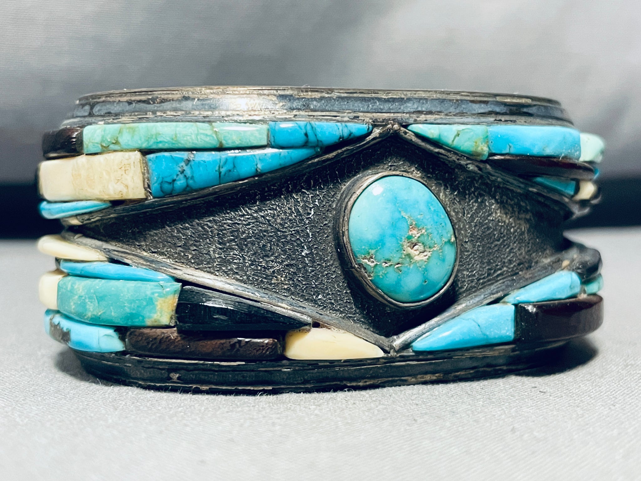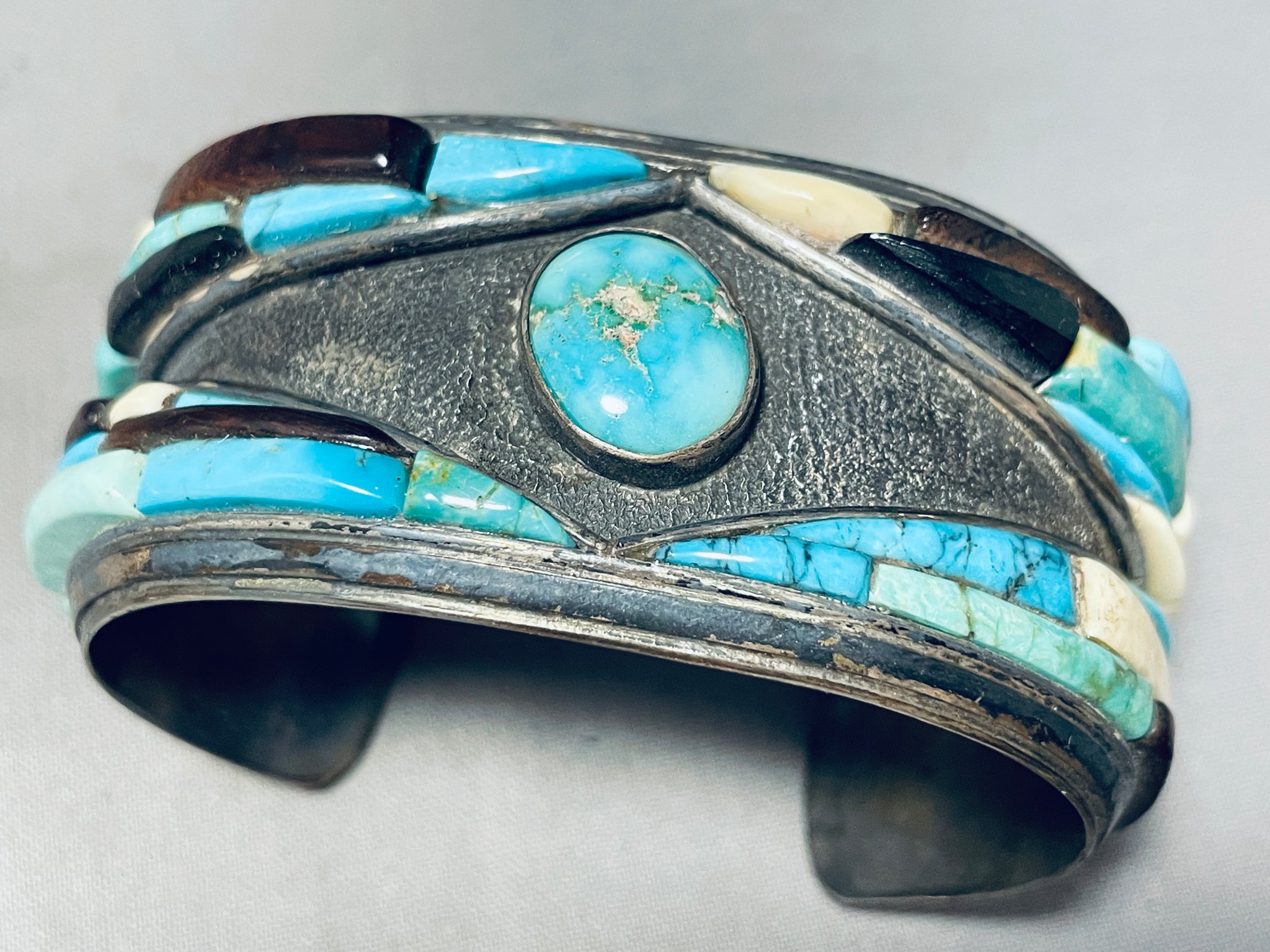 6.5 Inch Wrist Opulent Vintage Native American Navajo Turquoise Inlay Sterling Silver Bracelet