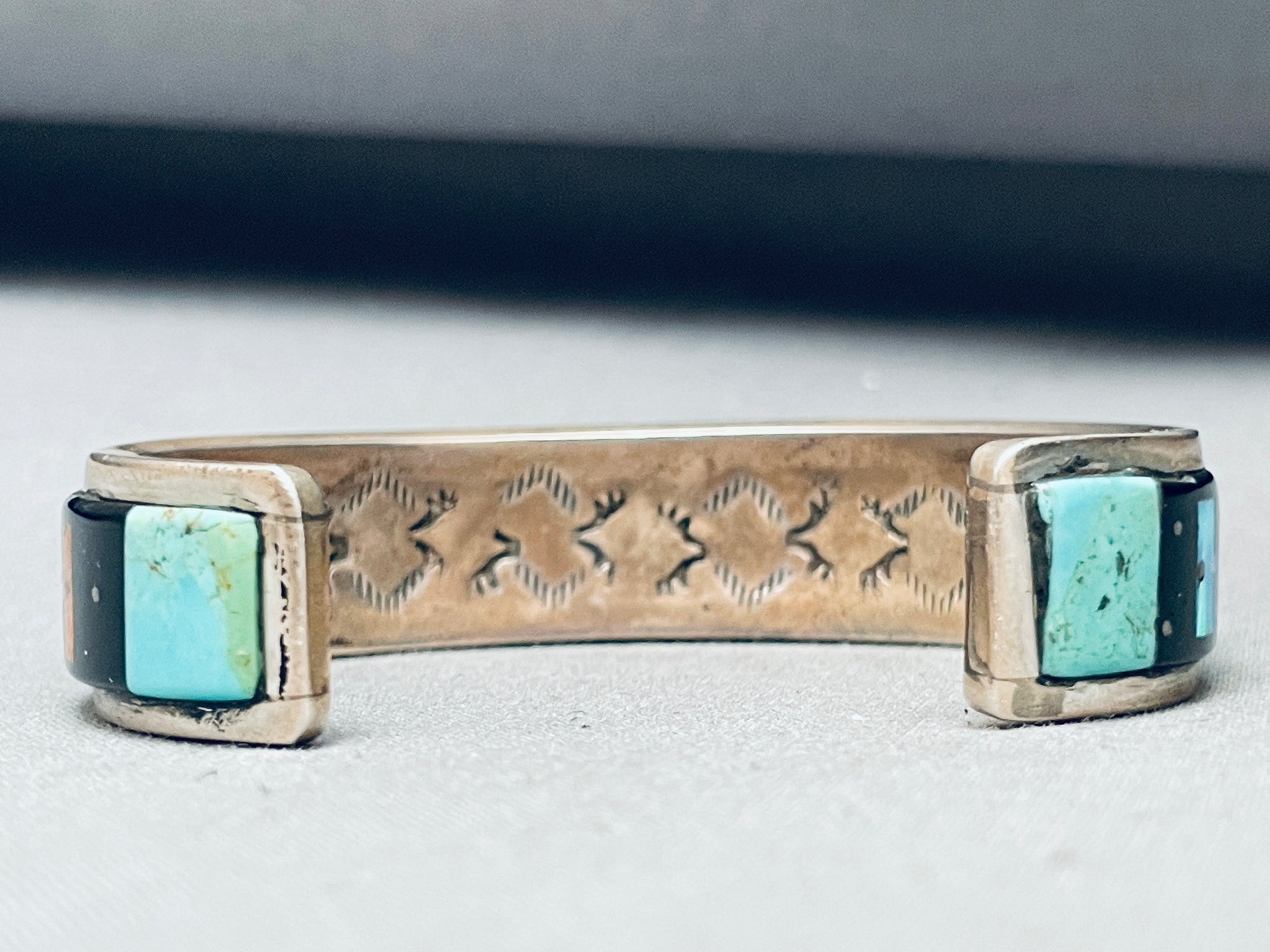 6.5 Inch Wrist Vintage Native American Navajo Hogan Inlay Sterling Silver Turquoise Bracelet