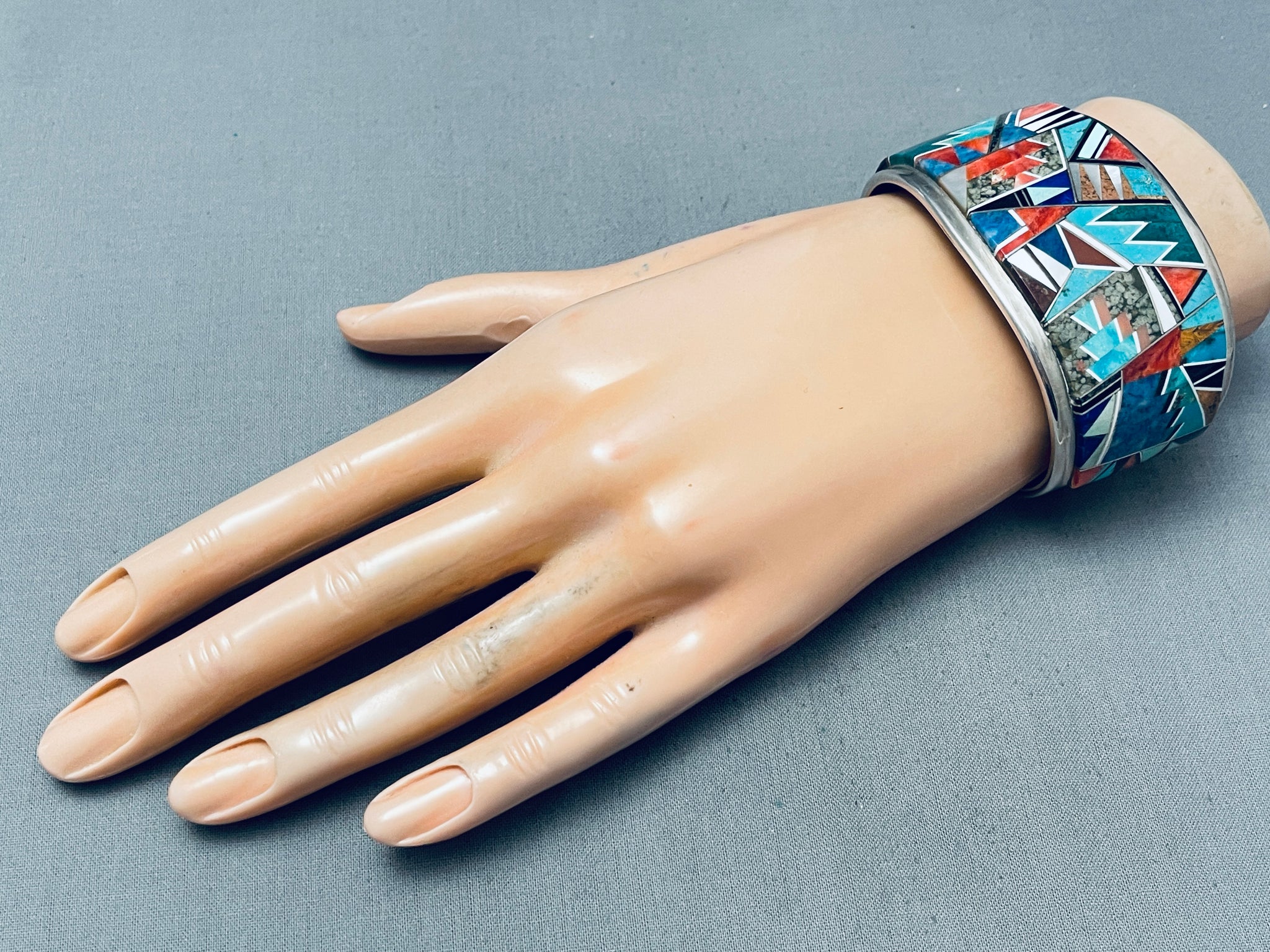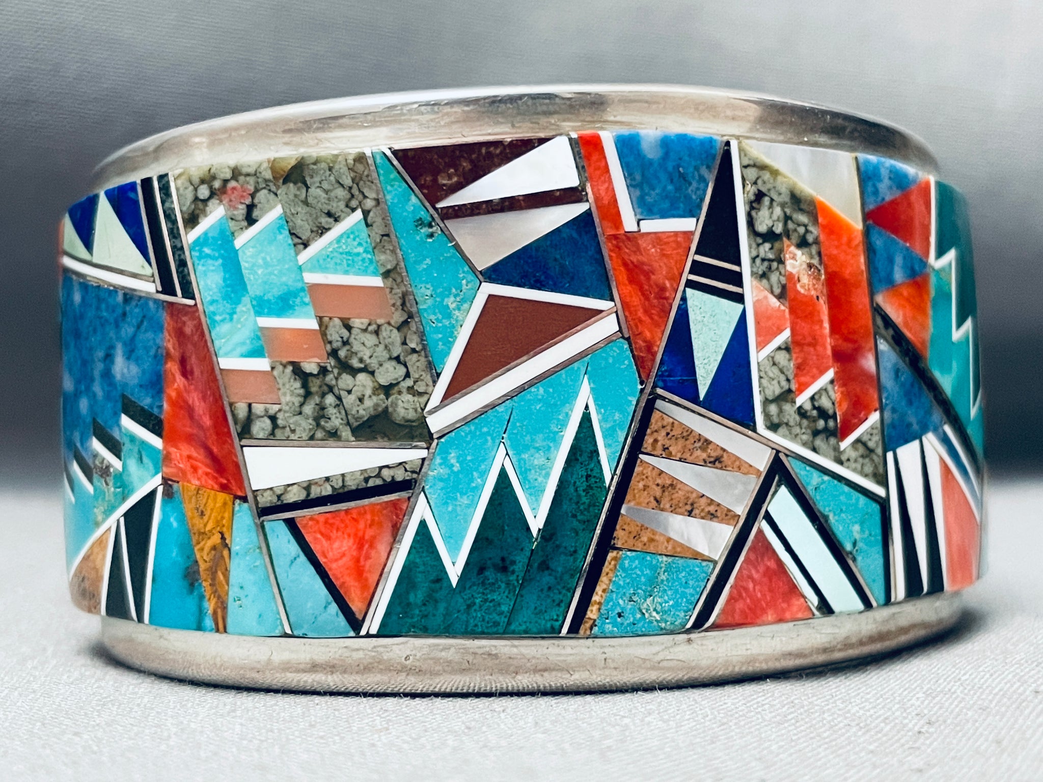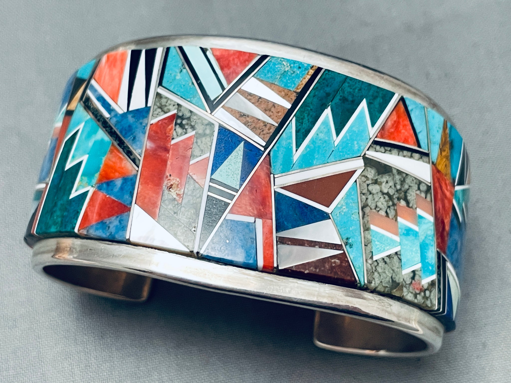 6.5 Inch Wrist Vintage Native American Navajo Tommy Jackson Inlay Sterling Silver Bracelet
