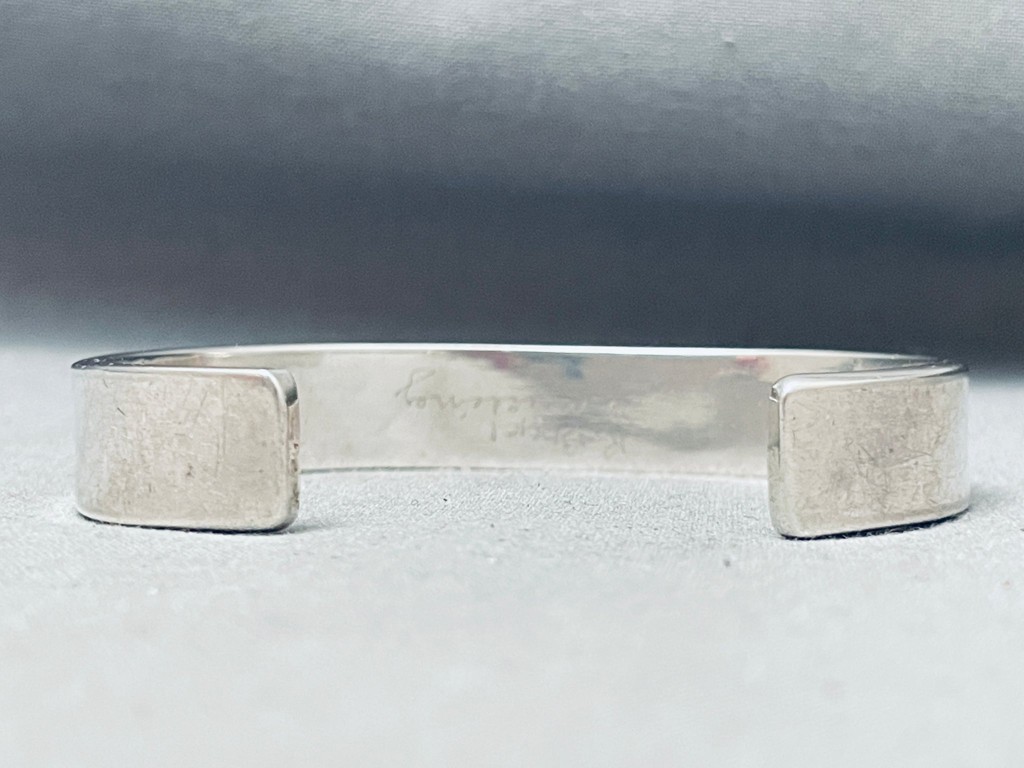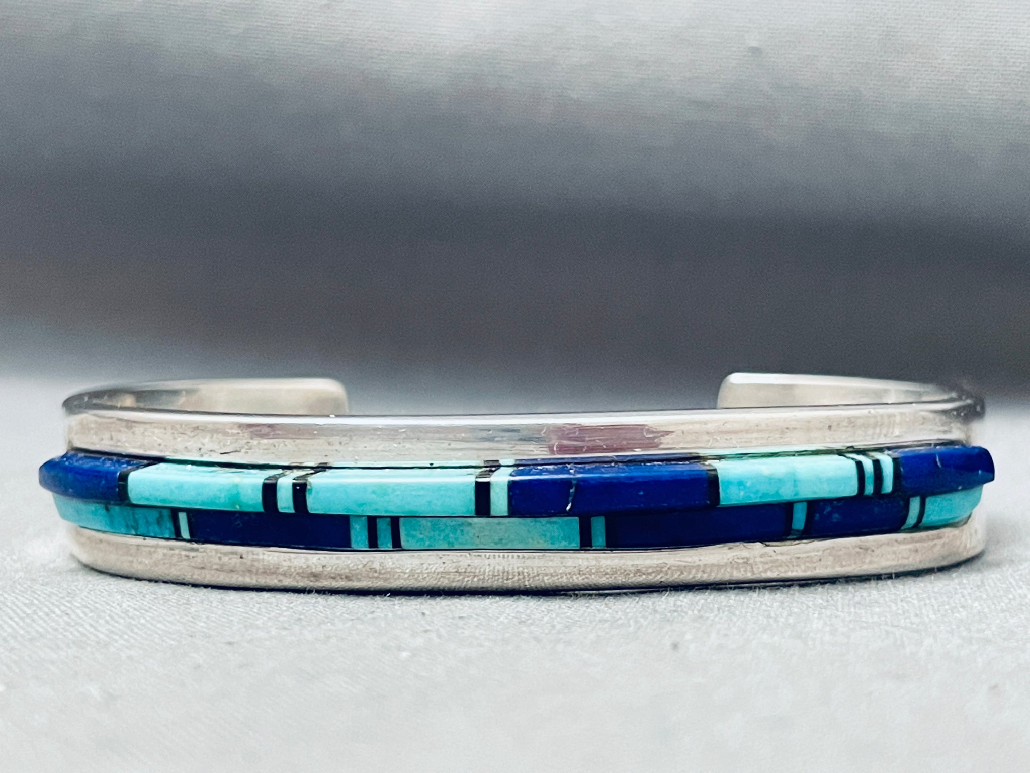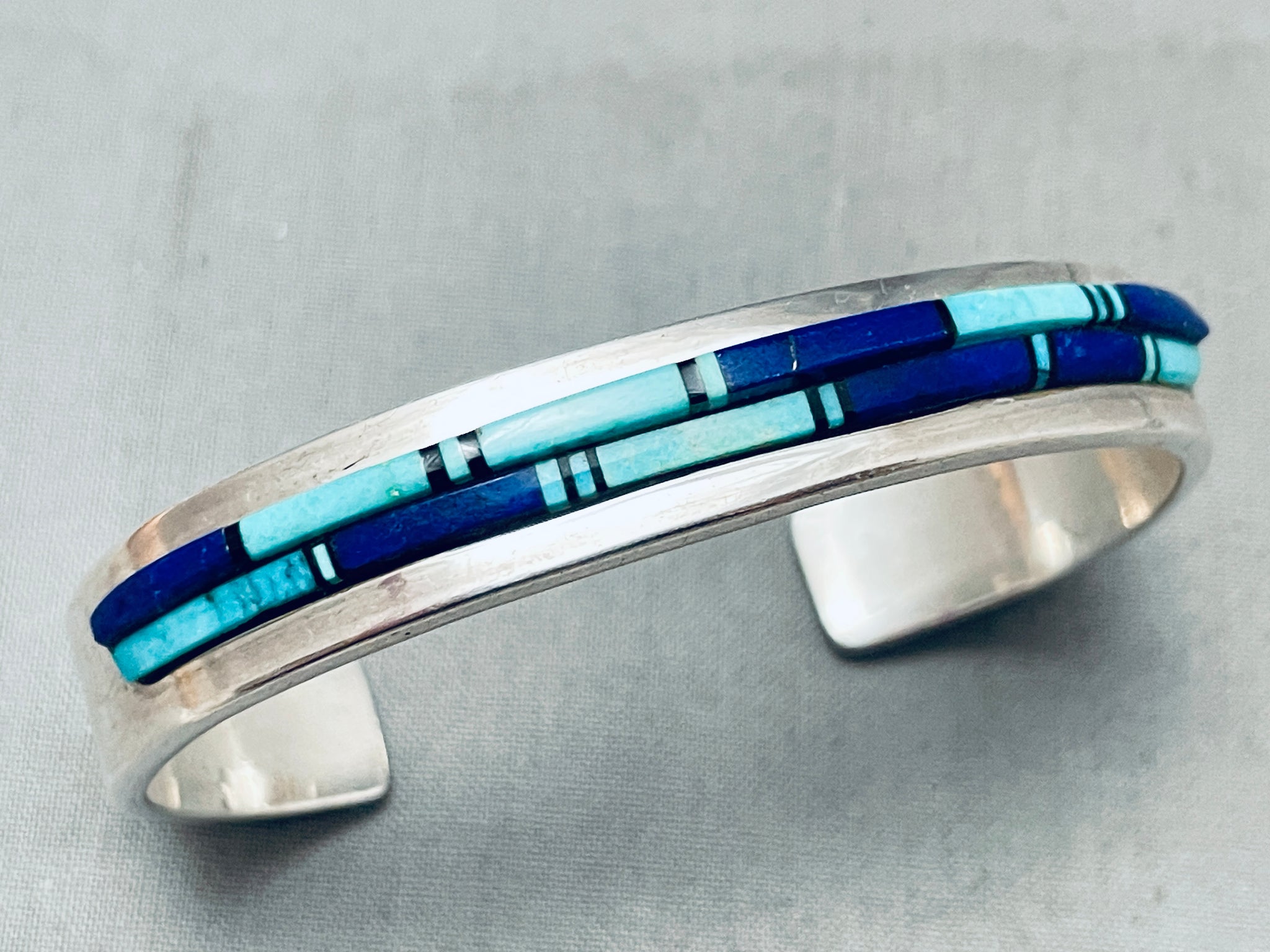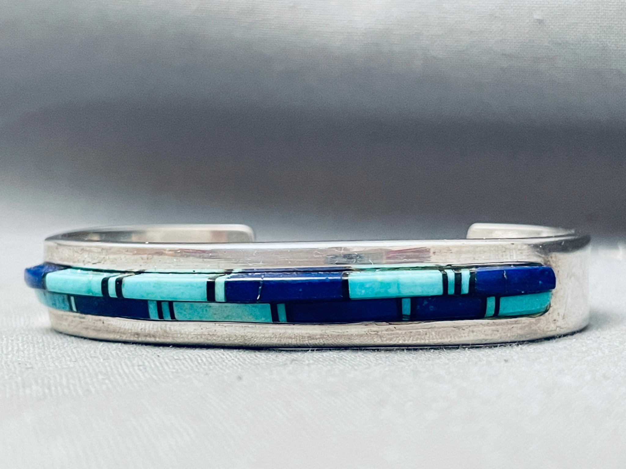 6.5 Inch Wrist Vintage Native American Navajo Turquoise Lapis Inlay Sterling Silver Bracelet
