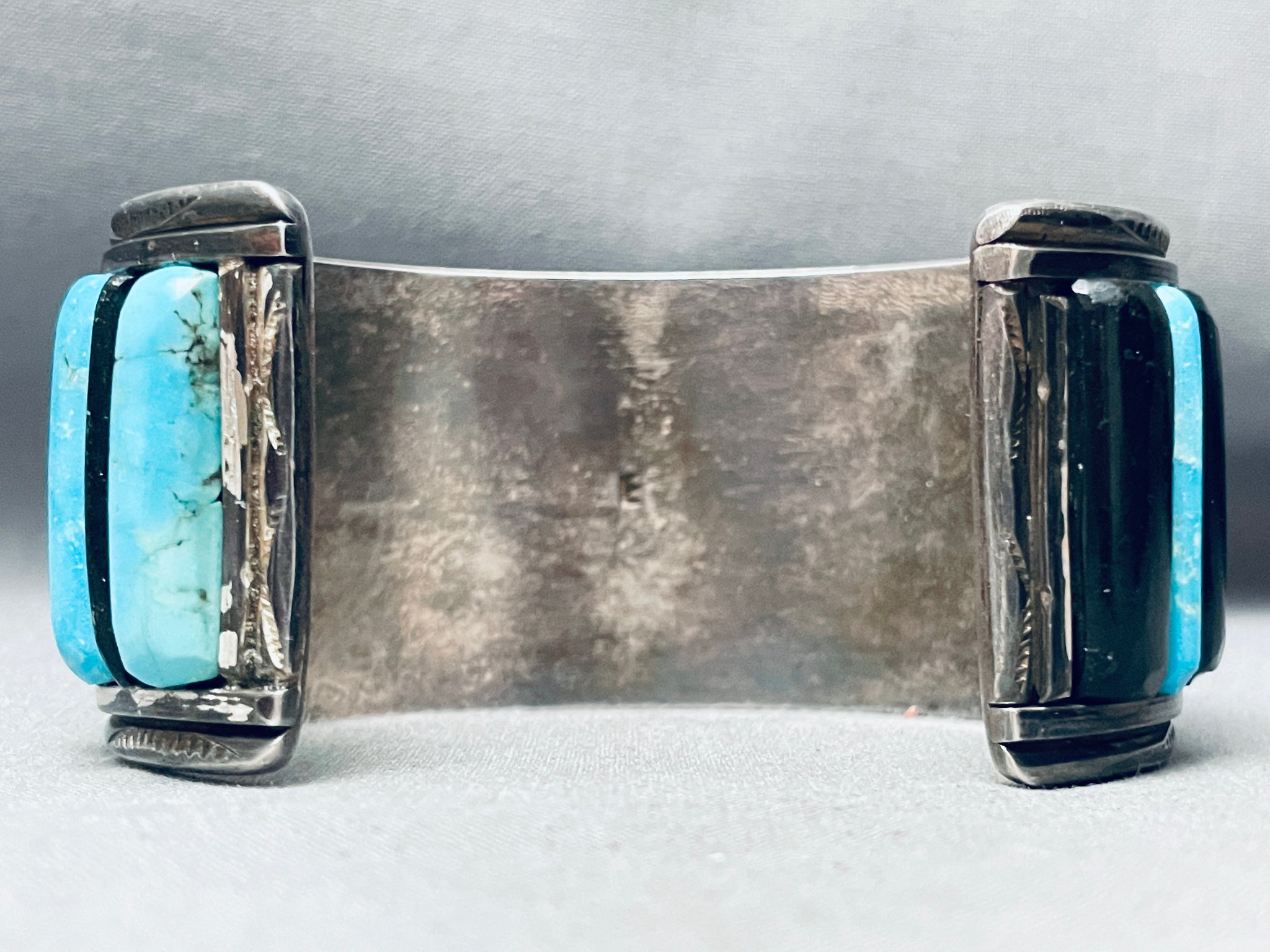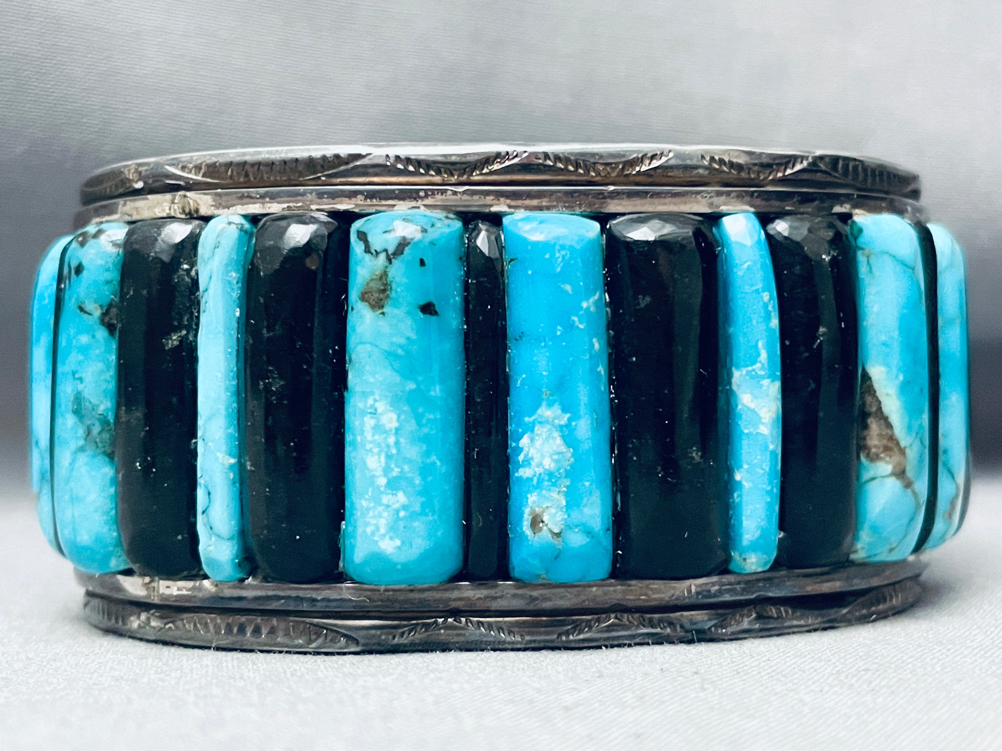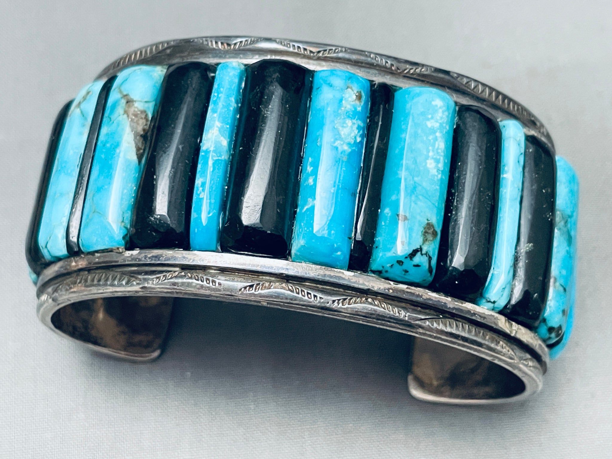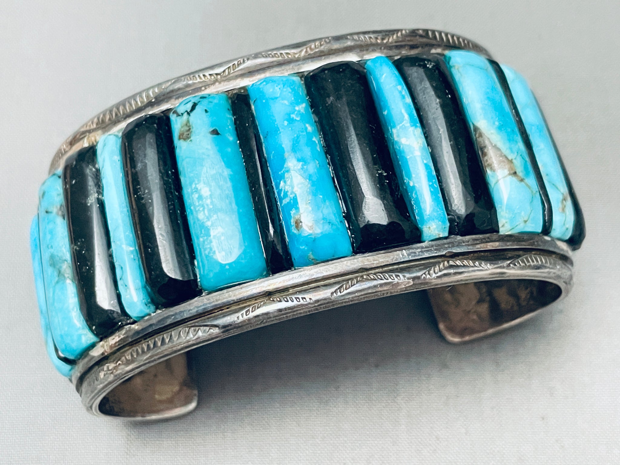 7 Inch Wrist Vintage Native American Navajo Turquoise Row Inlay Sterling Silver Bracelet