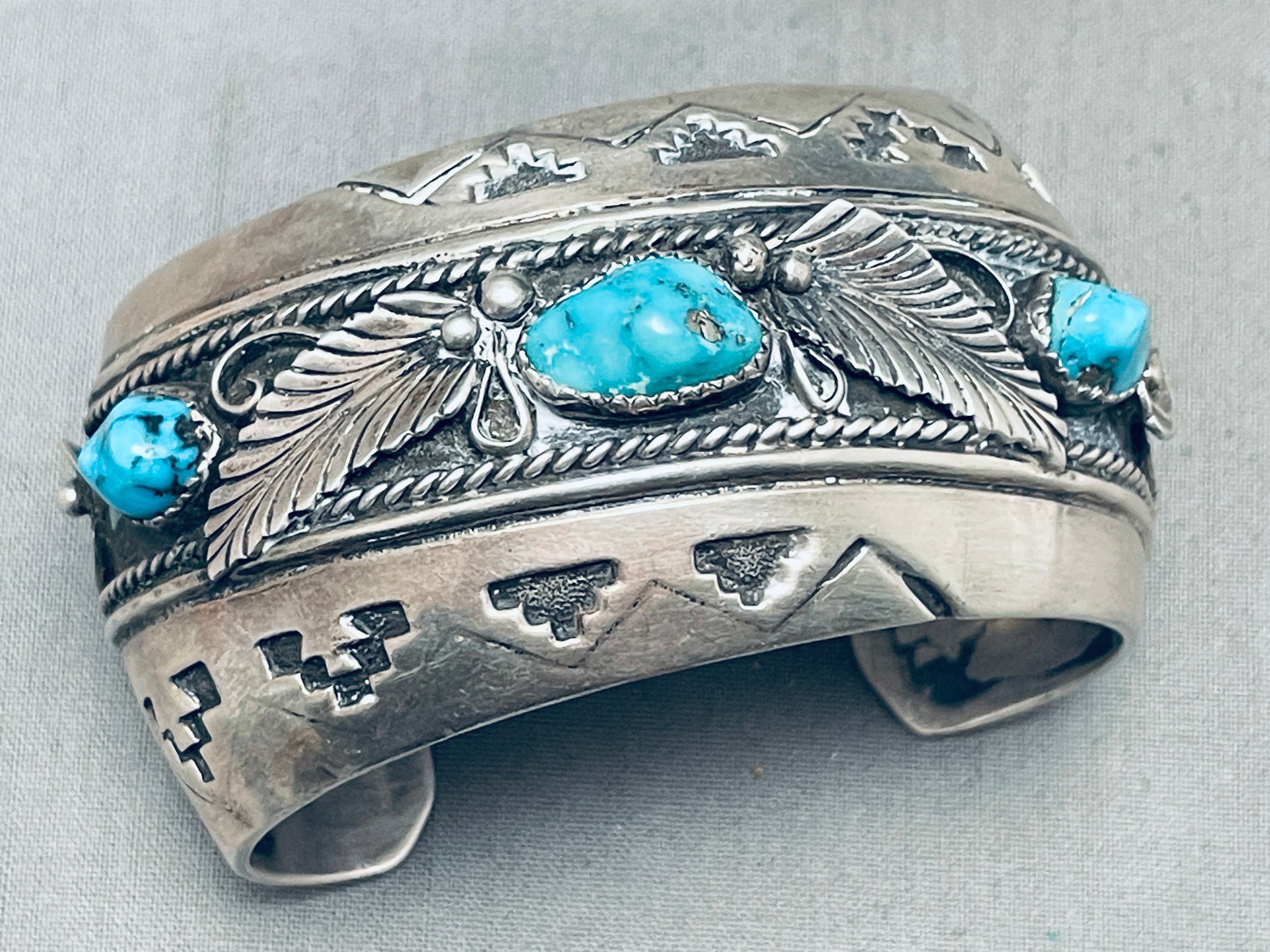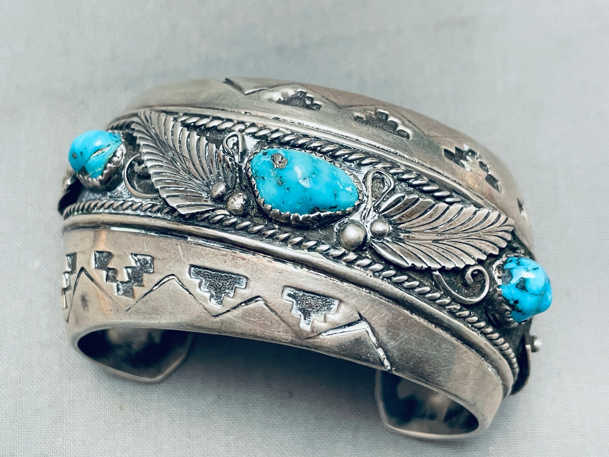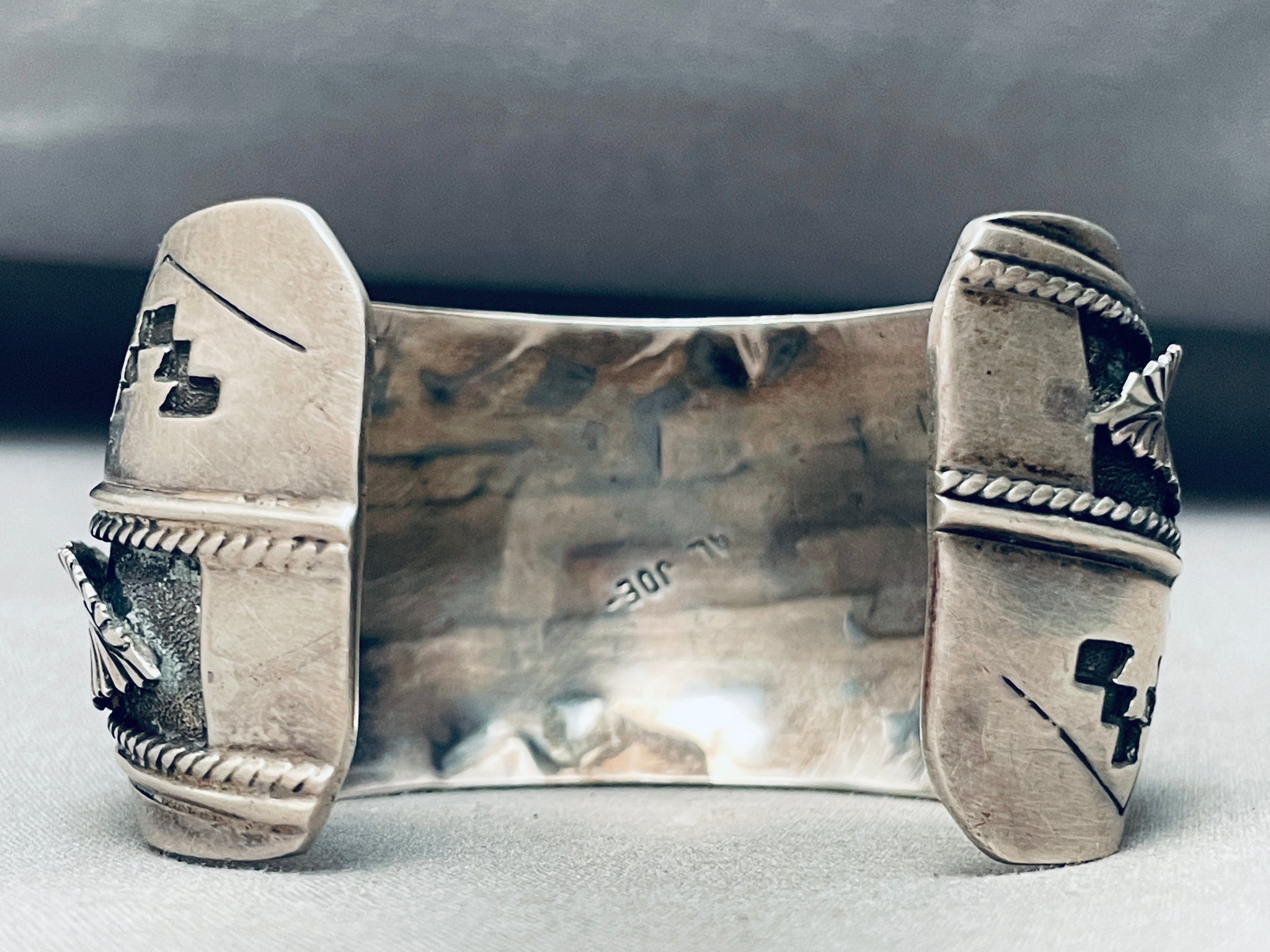 This is a superlative vintage Navajo three stone silver cuff bracelet. This incredible bracelet contains three chunky Morenci turquoise stones. Surrounding the stones are impeccable silver works that consist of ropes, leaves, wave works, raindrops, flowers, and bordering geometric patterns. The cuff is very thick and sturdy with amazing width. Such a beautiful bracelet. The center stone measures around 1/2" x 3/8". The width of the bracelet measures around 1-3/8". Signed by Navajo artist, Al Joe. Sterling silver. Cir. 1970's+. The inside end to end measures around 5-3/4" with an additional 1-1/4" gap. Sturdy 71 grams.