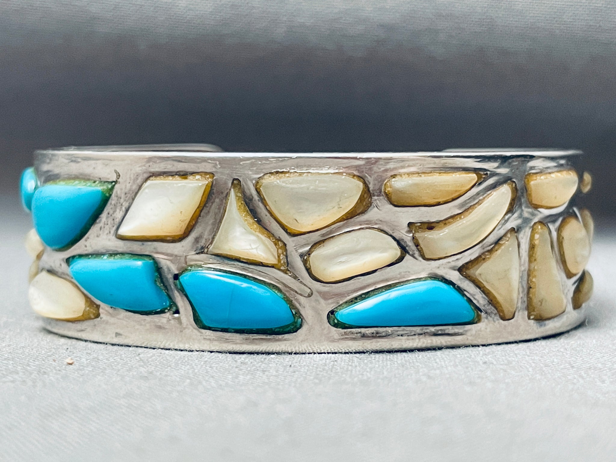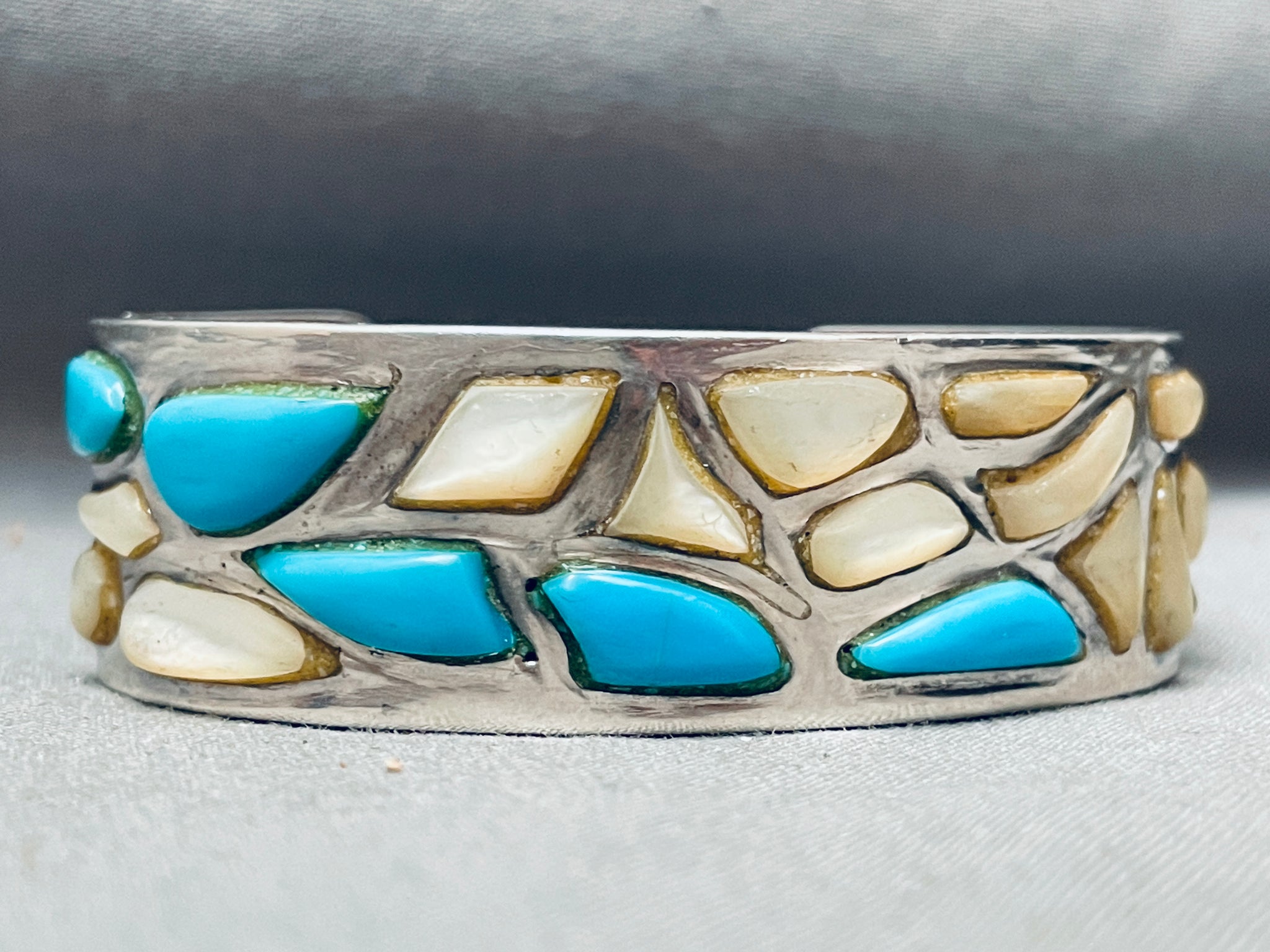 This is an amazing vintage Navajo inlaid thick silver cuff bracelet. This incredible bracelet contains a beautiful plethora of inlaid stones and shells that consist of mother of pearl shells along with Sleeping Beauty turquoise stones. The way the artist placed the inlaid stones and shells is just marvelous and so remarkable. The bracelet is thick and sturdy. The largest stone measures around 5/8" x 1/4". The width of the bracelet measures around 3/4". Sterling silver, marked. Cir. 1970's+. The inside end to end measures around 5-1/4" with an additional 1" gap. Sturdy 48 grams.