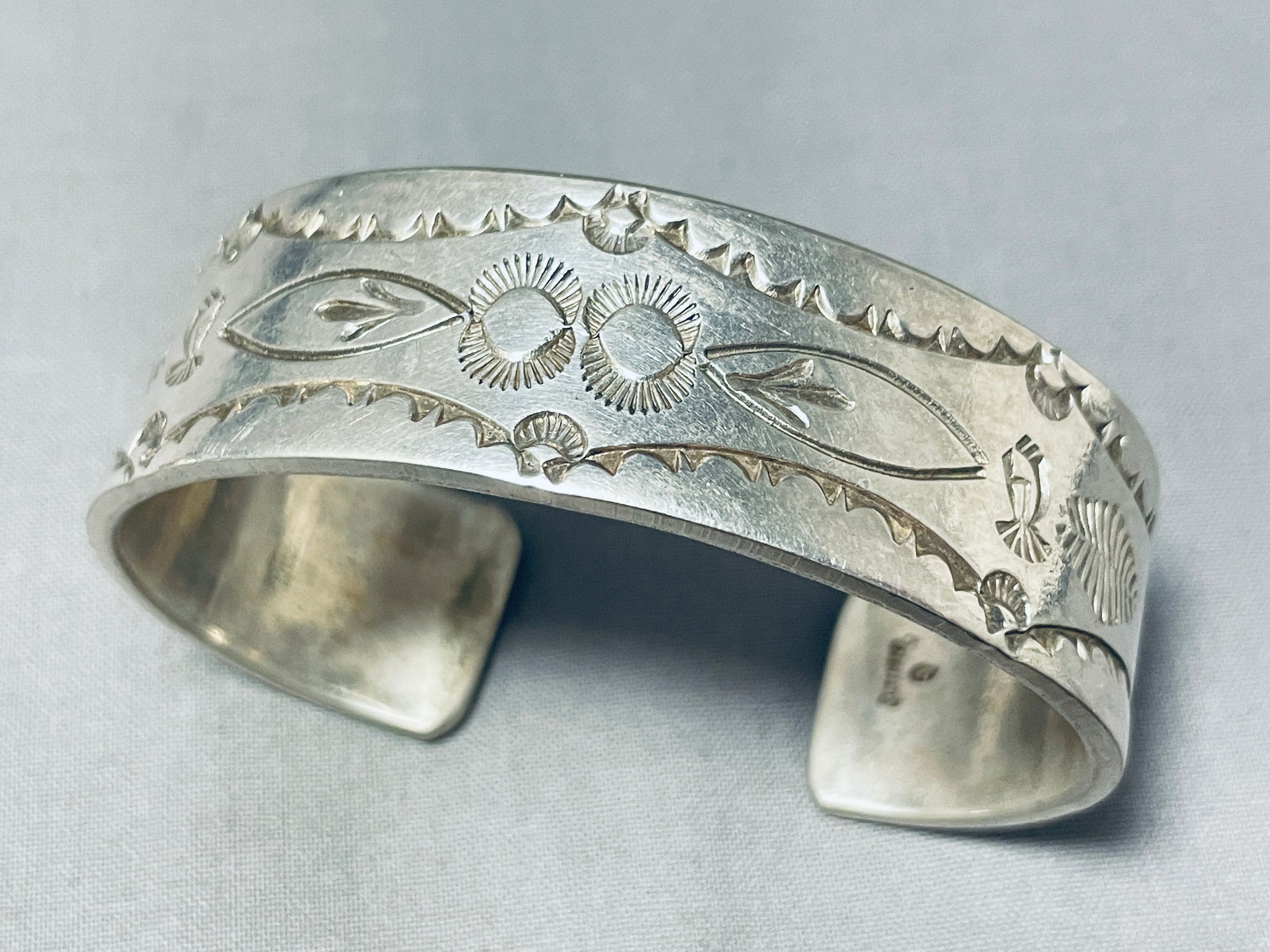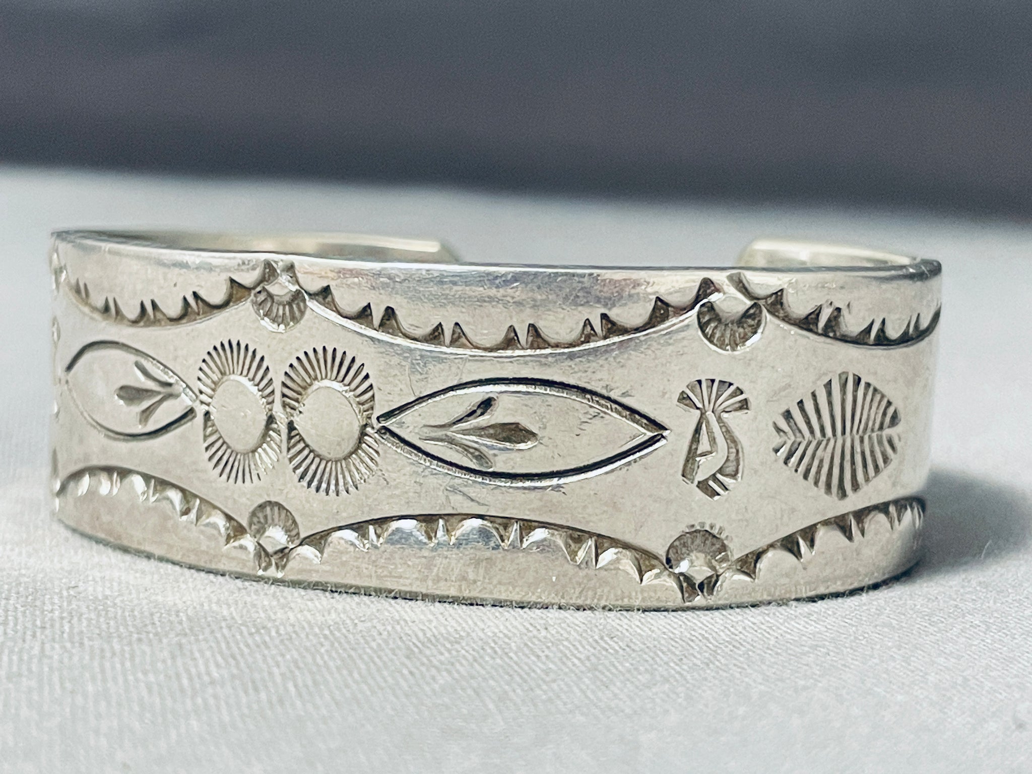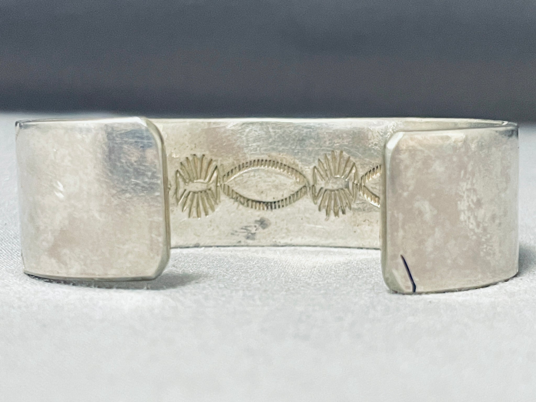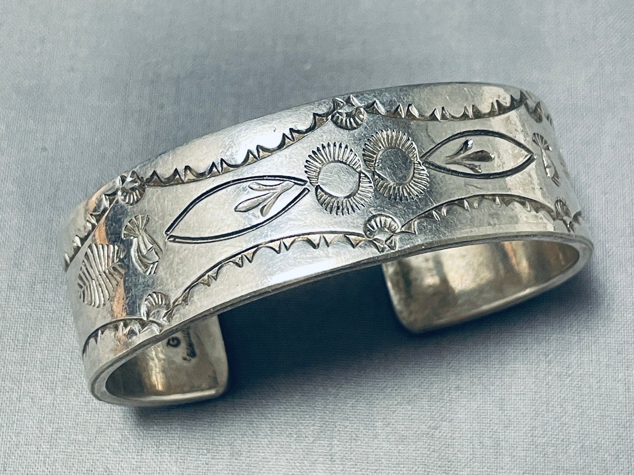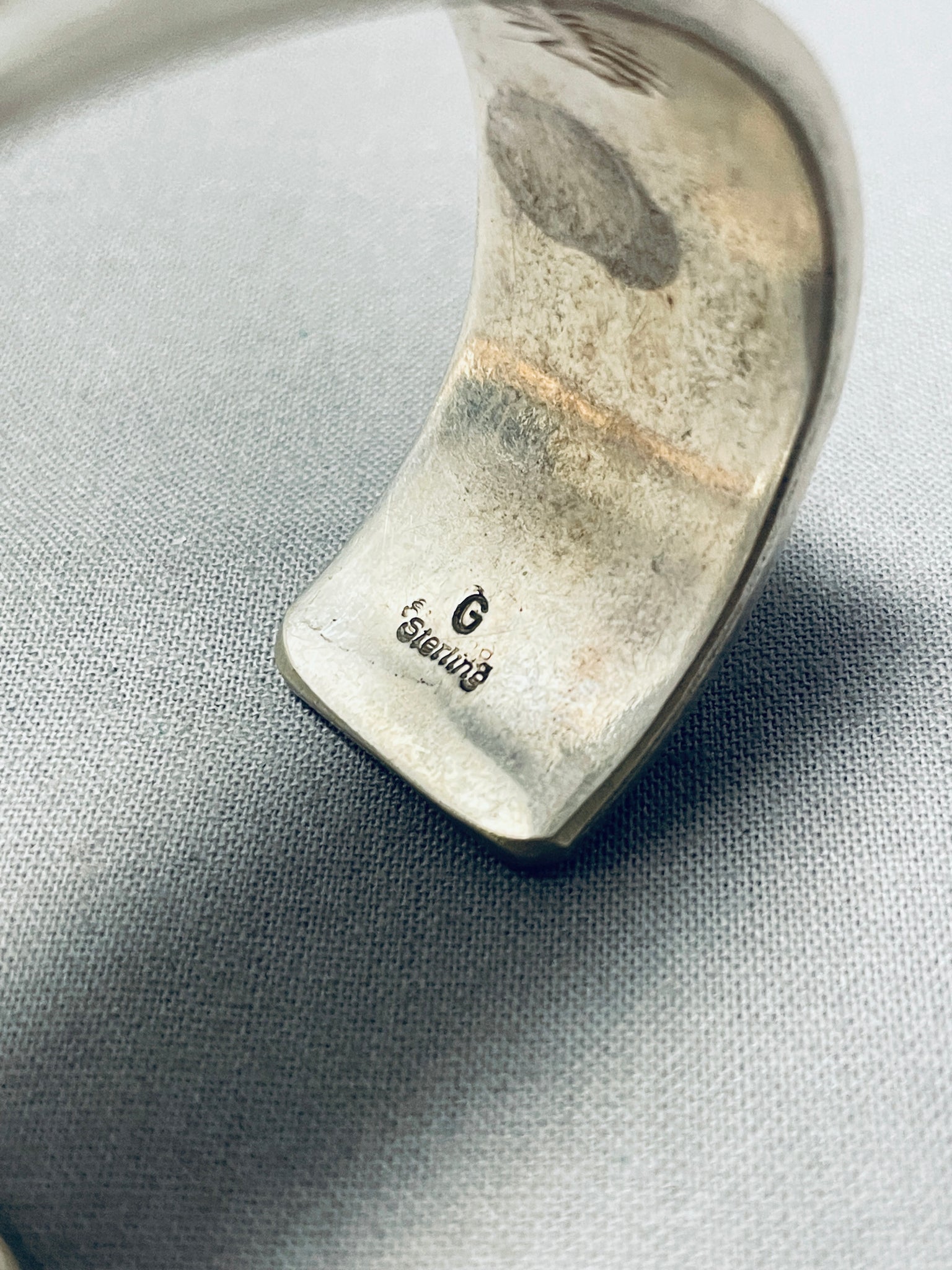 Here we have an impressive vintage Navajo silver bracelet having a large, heavy, handcarved smooth, solid silver cuff with silver handstampings all across and on the inside! Truly Remarkable! The width of the bracelet measures around 3/4". Signed by Navajo artist, G. Sterling silver, marked. The inside end to end measures around 5-3/4" with an additional 1" gap. Sturdy 66 grams.