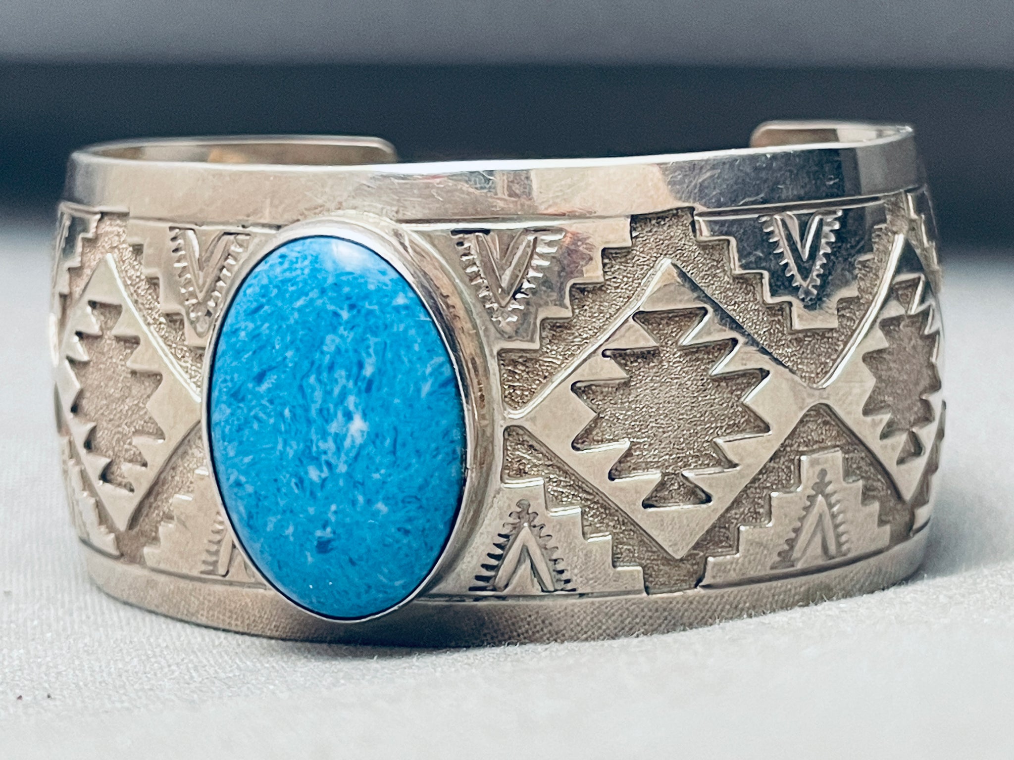 This is an amazing vintage Navajo silver cuff bracelet. This bracelet contains a center oval shaped denim lapis stone. Running down both ends of the cuff are outstanding stampings that include pueblo patterns, teepee patterns and diamond patterns. The center stone measures around 1" x 3/4". The width of the bracelet measures around 1-1/4". Signed by Navajo artist, Ben. Sterling silver, marked. The inside end to end measures around 6" with an additional 1-1/4" gap. Sturdy 57 grams.
