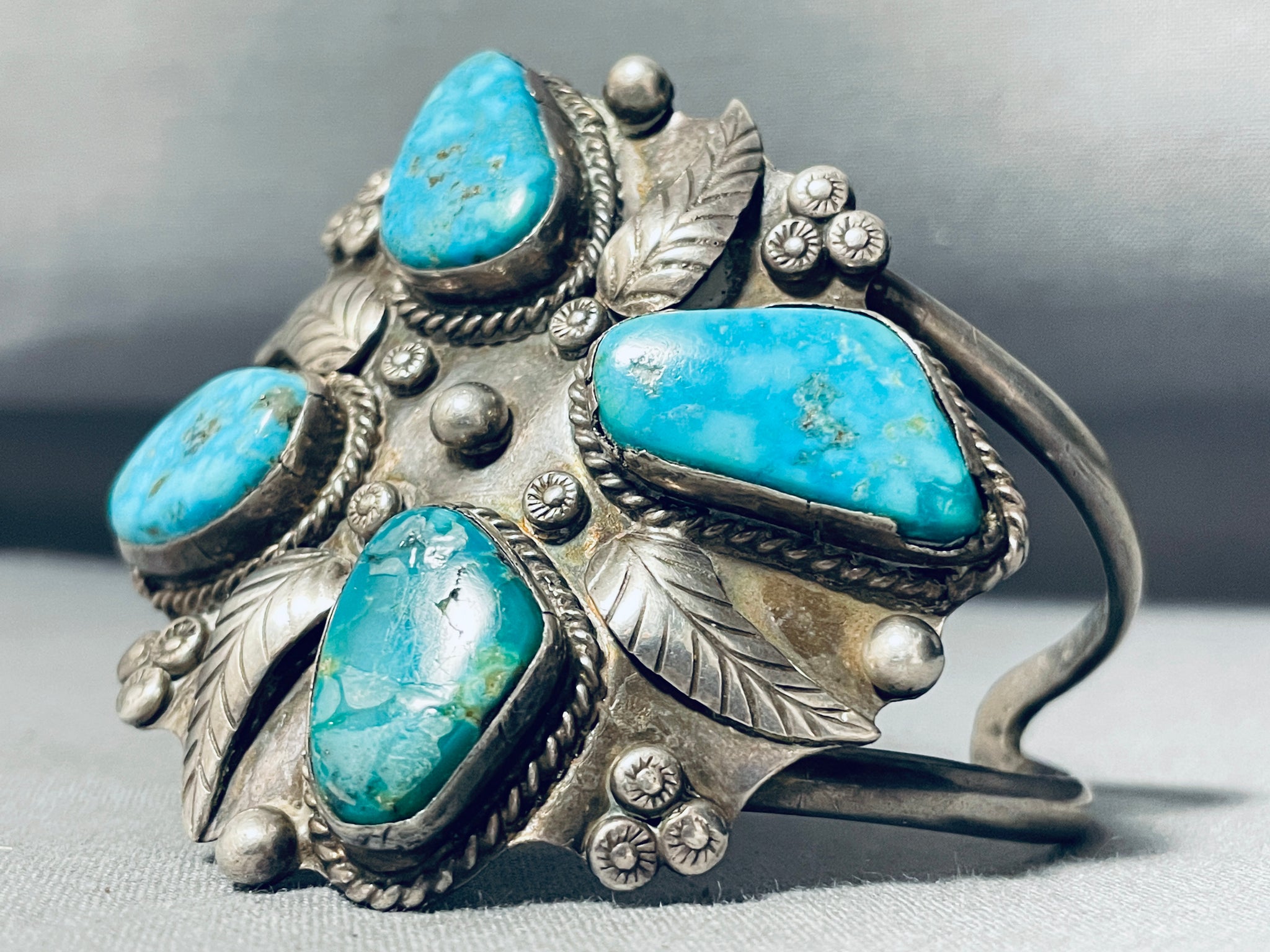 Big Museum Vintage Native American Navajo Turquoise Sterling Silver Leaf Bracelet Cuff