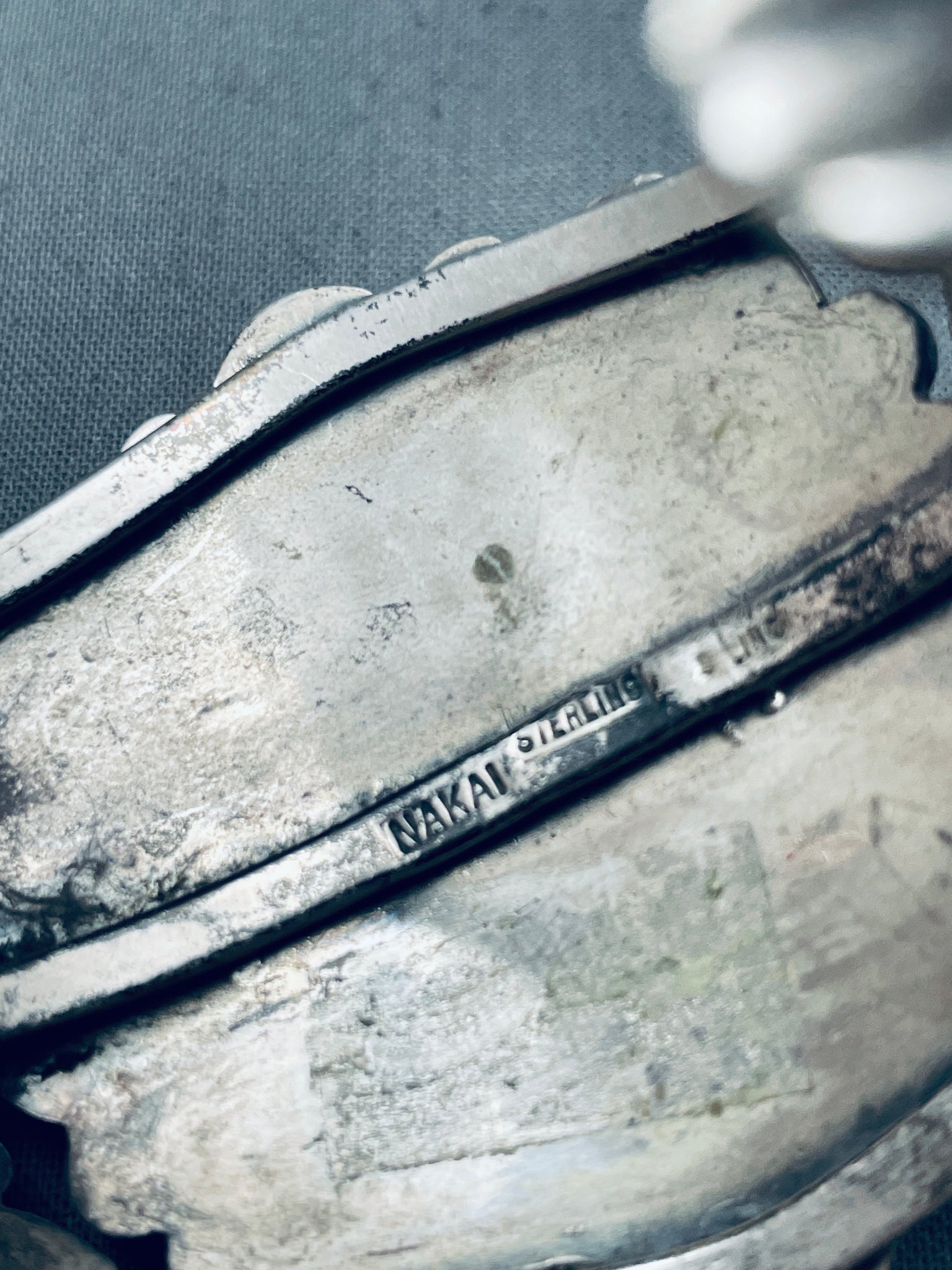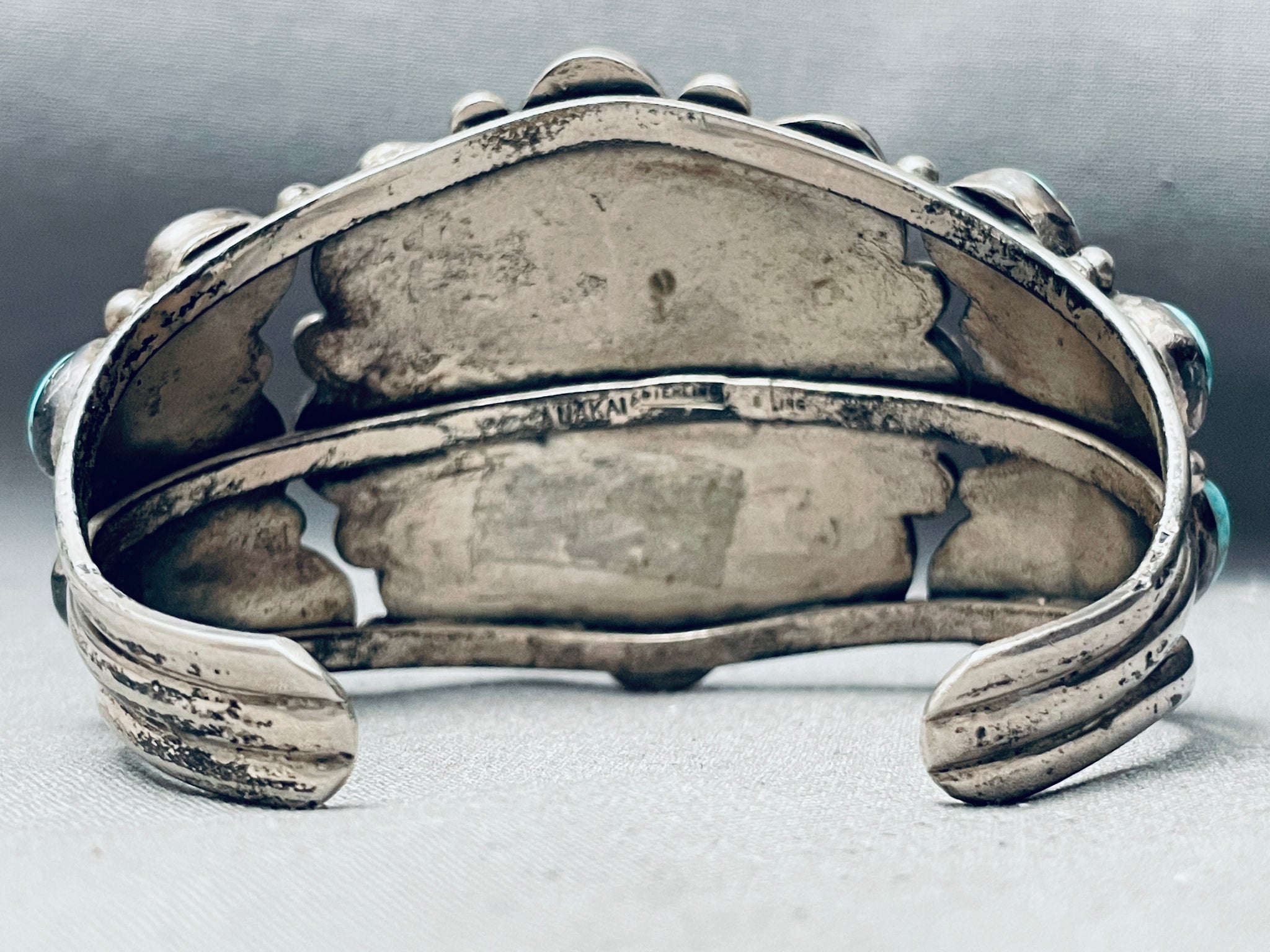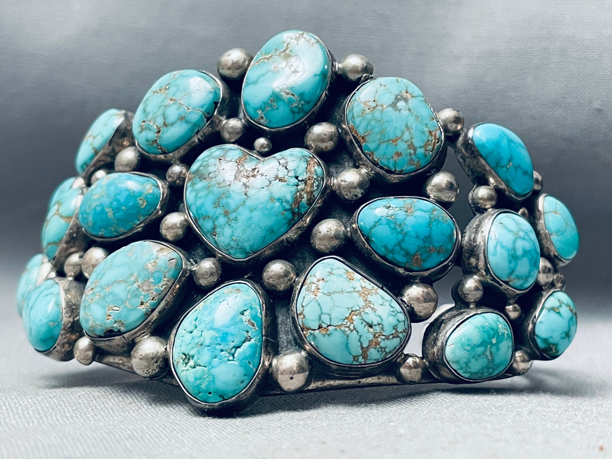 This is a remarkable vintage Navajo large chunky turquoise cluster silver bracelet. This impeccable bracelet contains a beautiful plethora of hand cut large chunky Red Mountain turquoise stones with the center stone being carved into a breathtaking heart pattern. Situated throughout all of the stones is a stunning plethora of large silver raindrops. This bracelet contains a fascinating sturdy and thick triple silver shank cuff that graduates in width towards the center. The height at the center of the bracelet measures around 2" while the width at the center of the triple silver shank cuff measures around 1-3/4". The center stone measures around 5/8" x 5/8". Signed by Navajo artist, Nakai . Sterling silver, marked. Cir. 1970's+. The inside end to end measures around 5-3/4" with an additional 1-1/4" gap. Sturdy 66 grams.