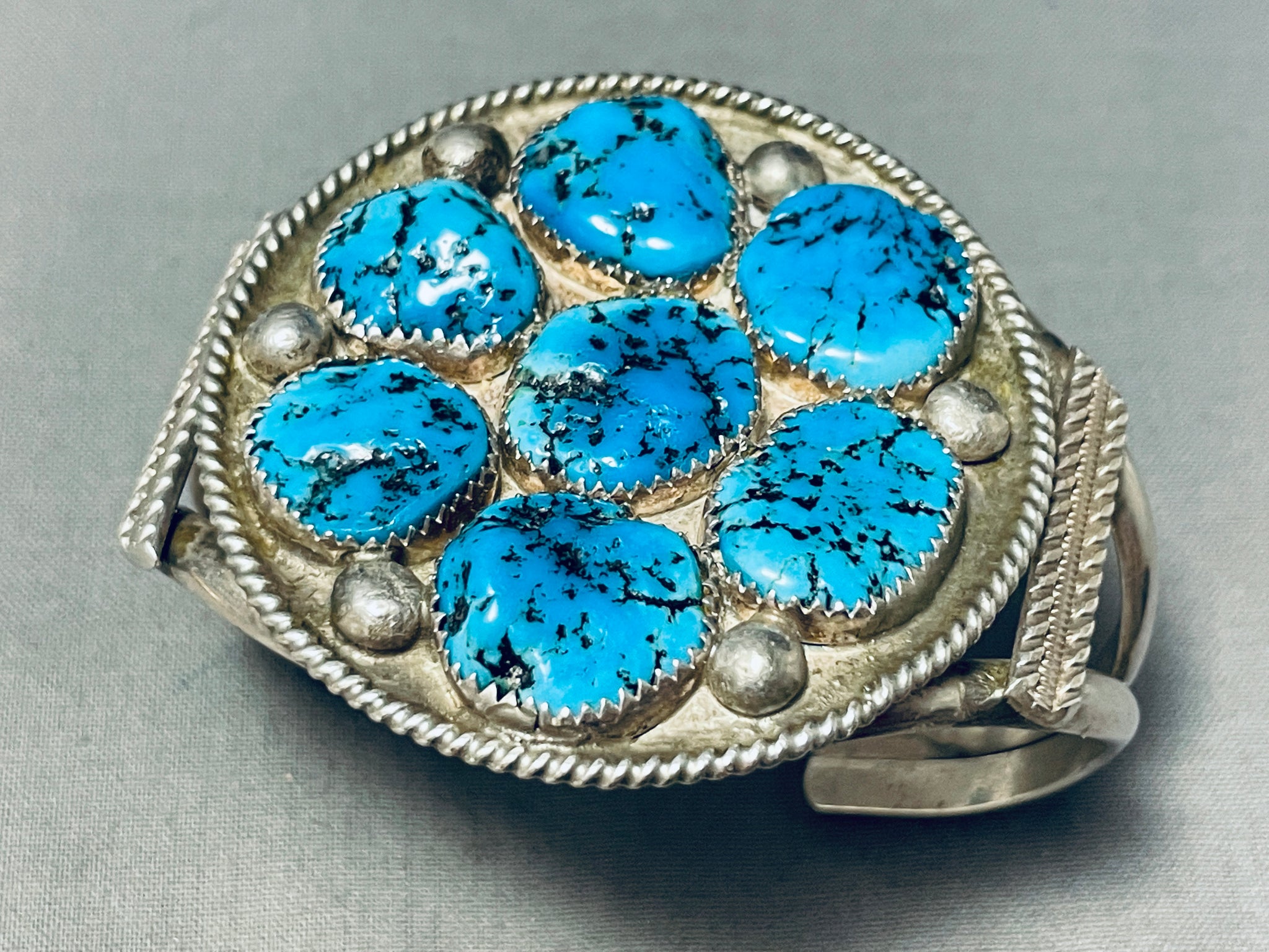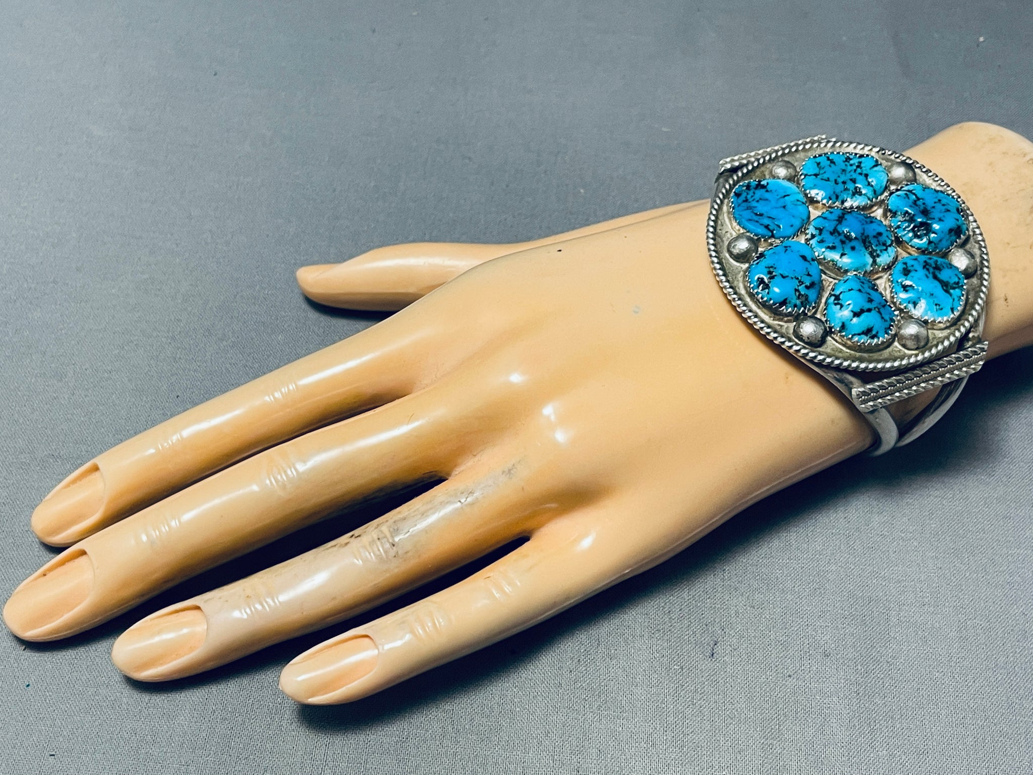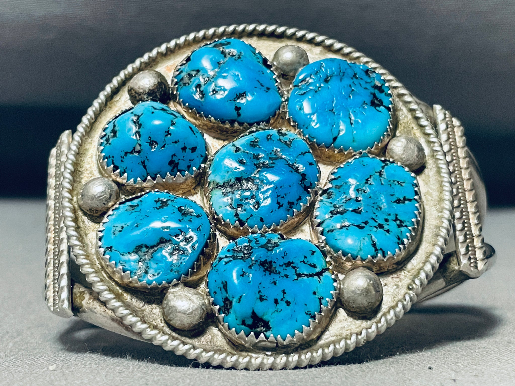 Chunky Turquoise Cluster Vintage Native American Navajo Sterling Silver Bracelet