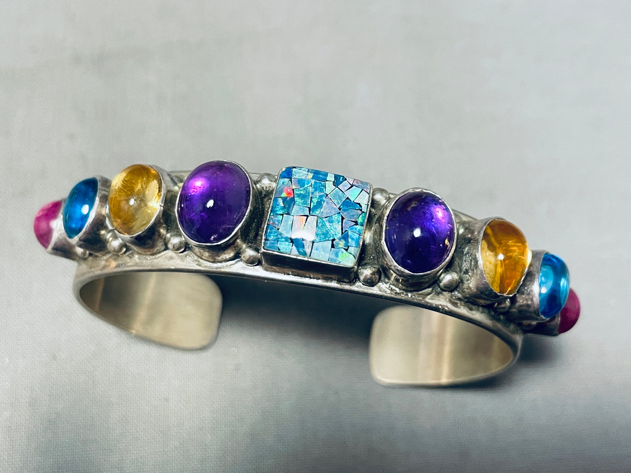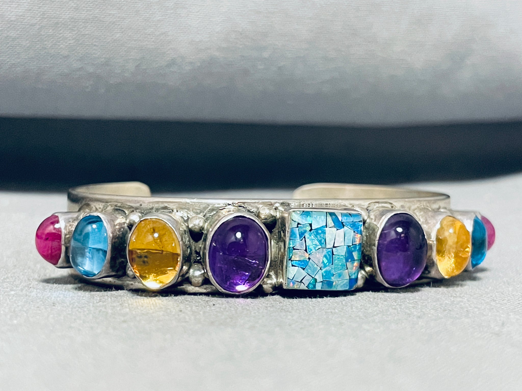 Colorful Native American Navajo Turquoise Amethyst Citrine Sterling Silver Bracelet