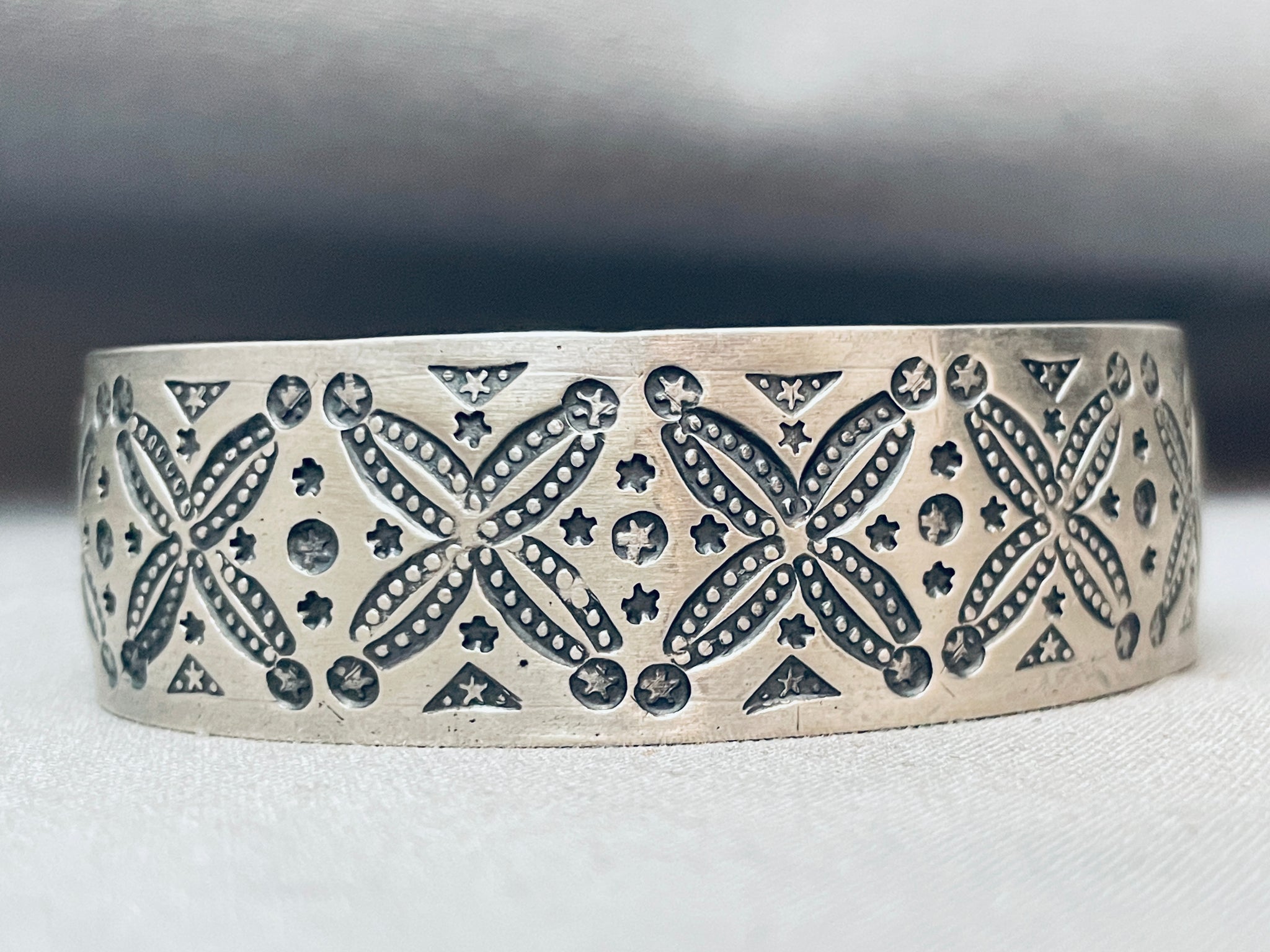 This is a stunning vintage Navajo all silver cuff bracelet. This fascinating bracelet contains beautiful deep carved patterns. The patterns consist of flower works, dotted works, teepee patterns and star patterns. The carved out patterns on the thick and sturdy silver cuff wrap completely around the entire cuff. Such a beautiful bracelet. The width of the bracelet measures around 3/4". Signed by Navajo artist, CR. Sterling silver. Cir. 1970's+. The inside end to end measures around 6" with an additional 3/4" gap. Sturdy 45 grams.