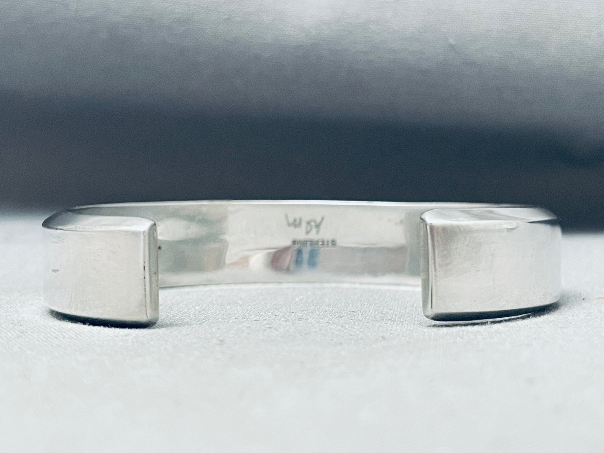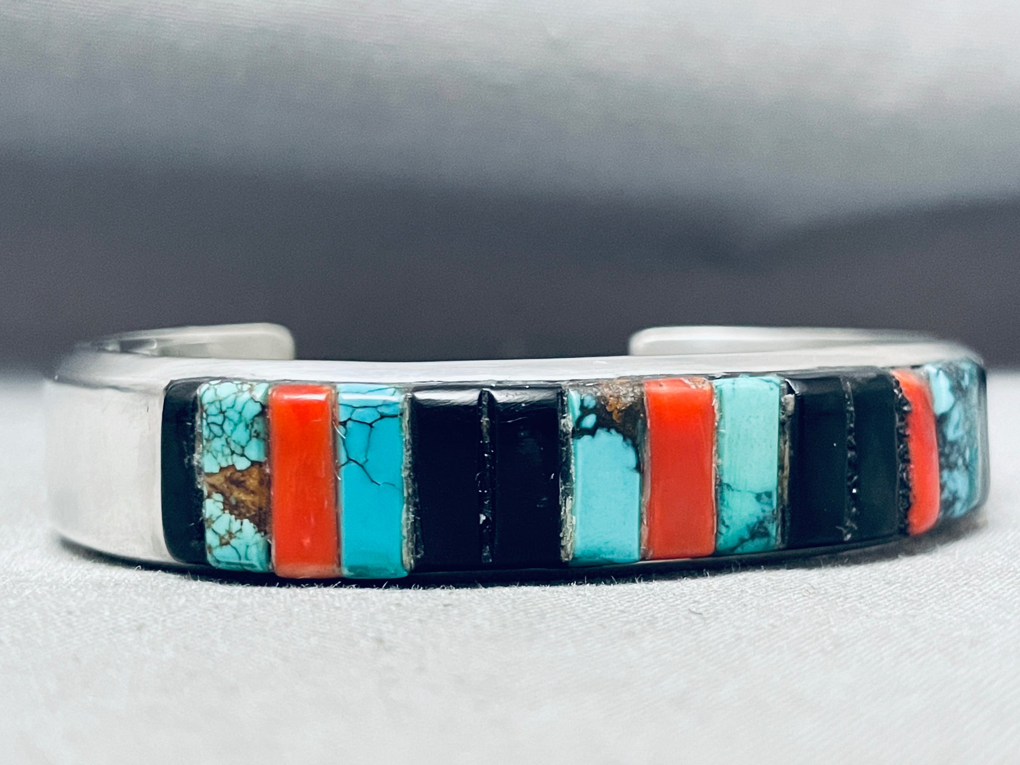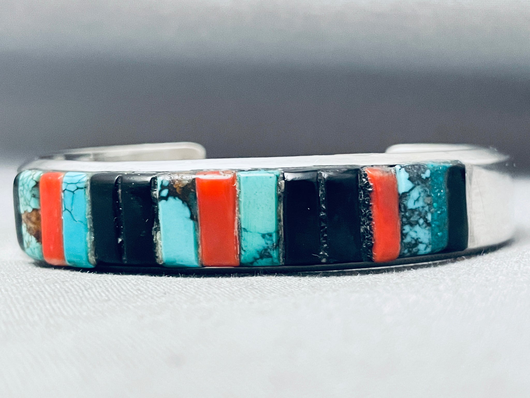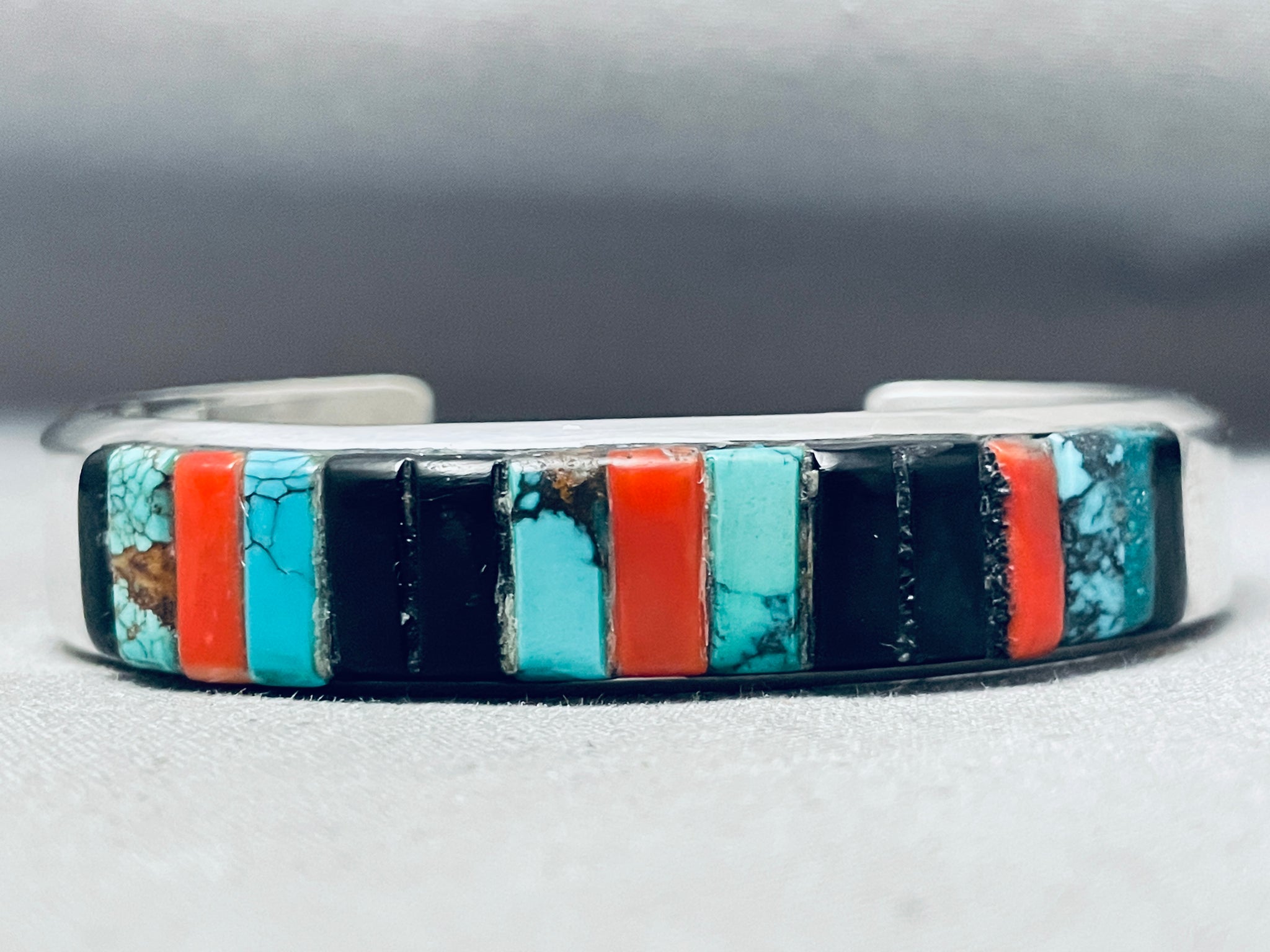 This is an exceptional vintage Navajo thick silver cuff bracelet. This phenomenal thick silver cuff bracelet consists of a amazing channel inlaid stones. The stones consist of beautiful jet stones, Royston turquoise and coral. The thickness of the cuff is absolutely amazing. The stones measure around 3/8" x 1/8". The width of the bracelet measures around 1/2". Signed by Navajo artist, hlm. Sterling silver, marked. Cir. 1970's+. The inside end to end measures around 5-1/2" with an additional 1-1/4" gap. Sturdy 31 grams.
