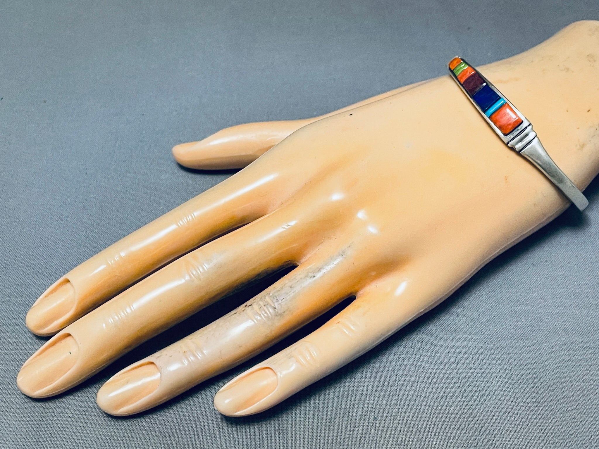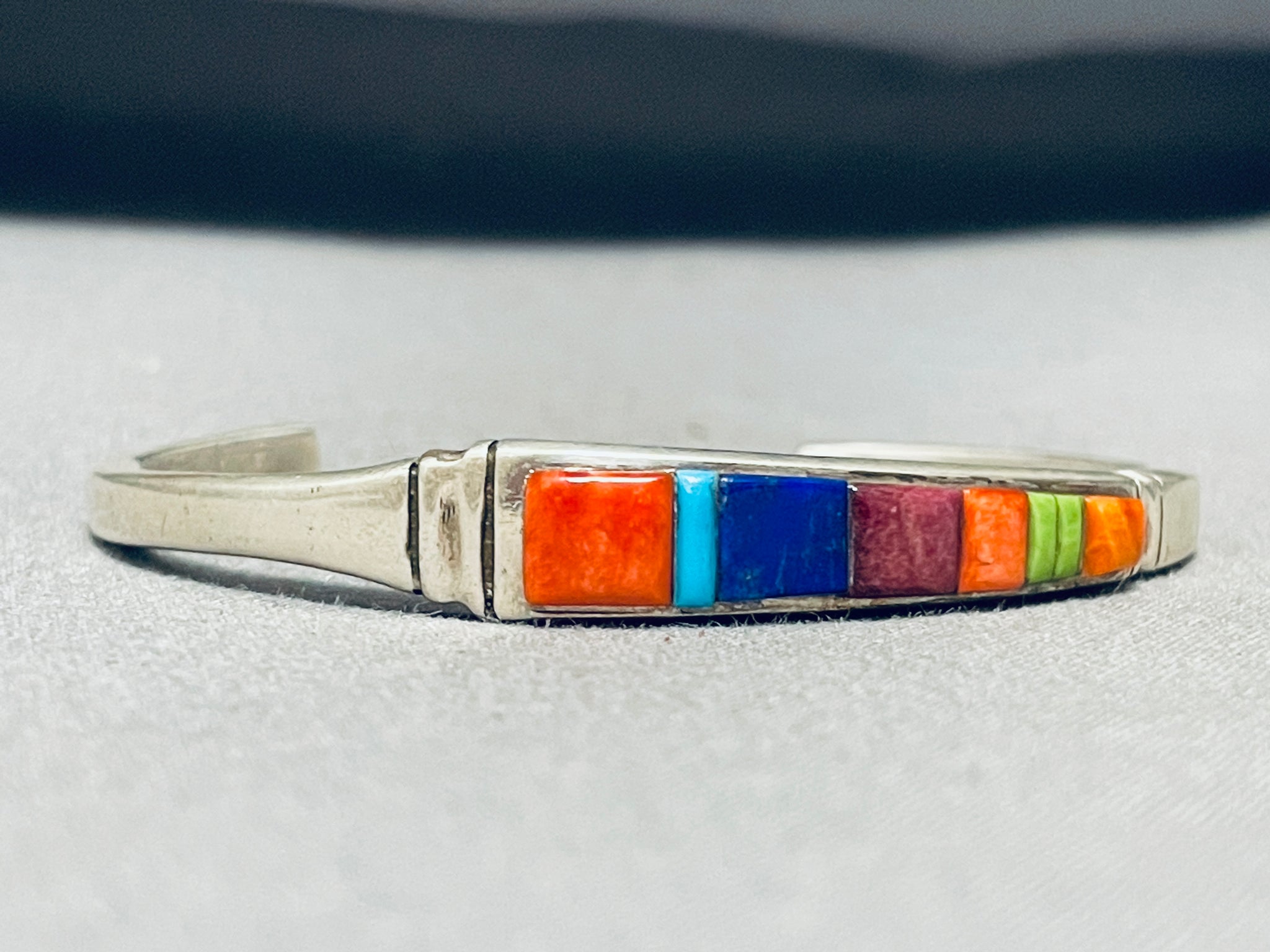 This is an incredible vintage Navajo inlaid thick silver cuff bracelet. This fascinating bracelet contains beautiful inlaid stones and shells that include Sleeping Beauty turquoise, orange spiny oyster shells, gaspeite, lapis and purple spiny oyster shells. Accenting the sides of the square thick silver cuff are fabulous sections of channel line segments. The width of the bracelet measures around 1/4". Sterling silver. Cir. 1980's+. The inside end to end measures around 5-1/4" with an additional 1-1/4" gap. Sturdy 21 grams.