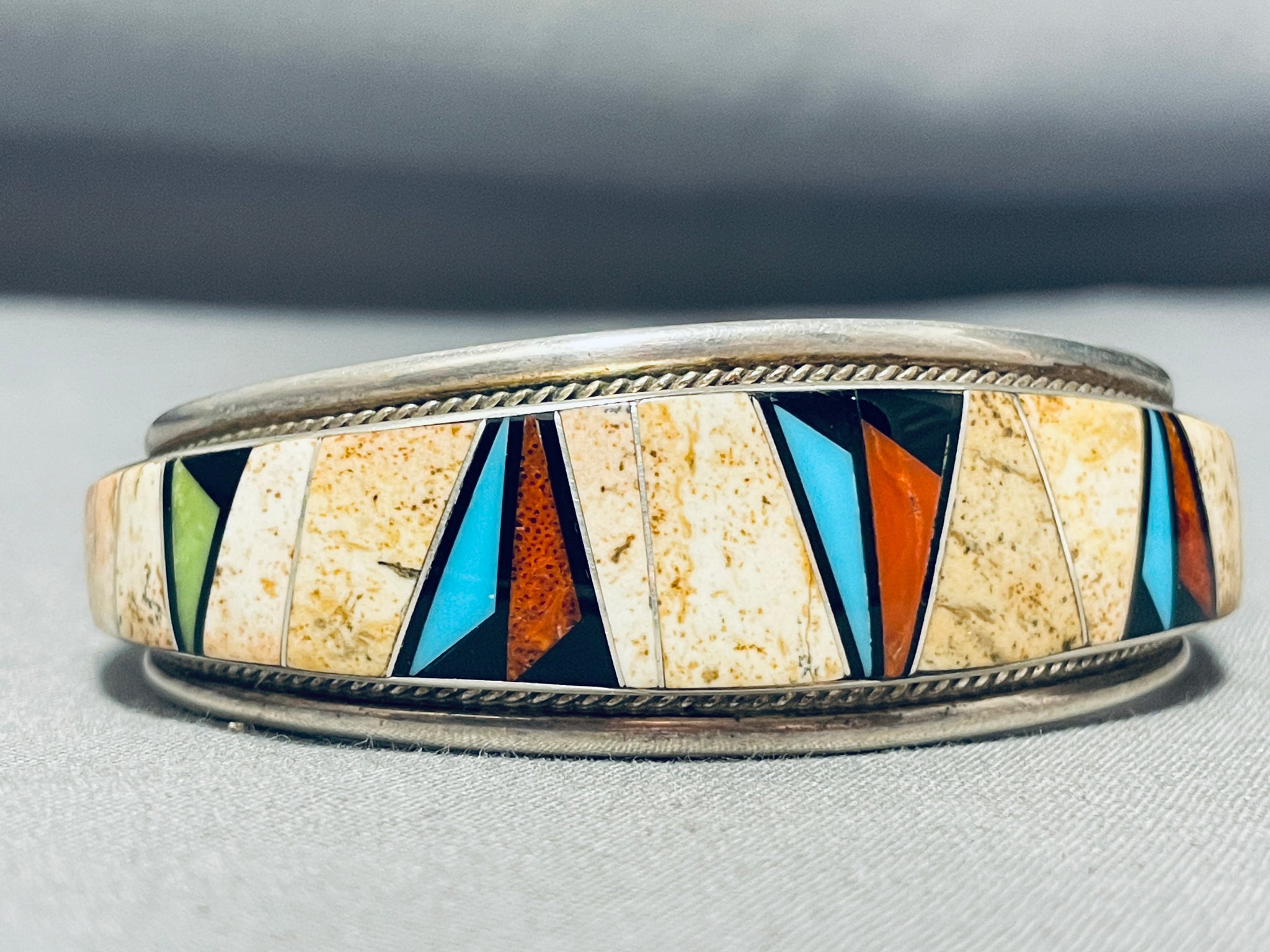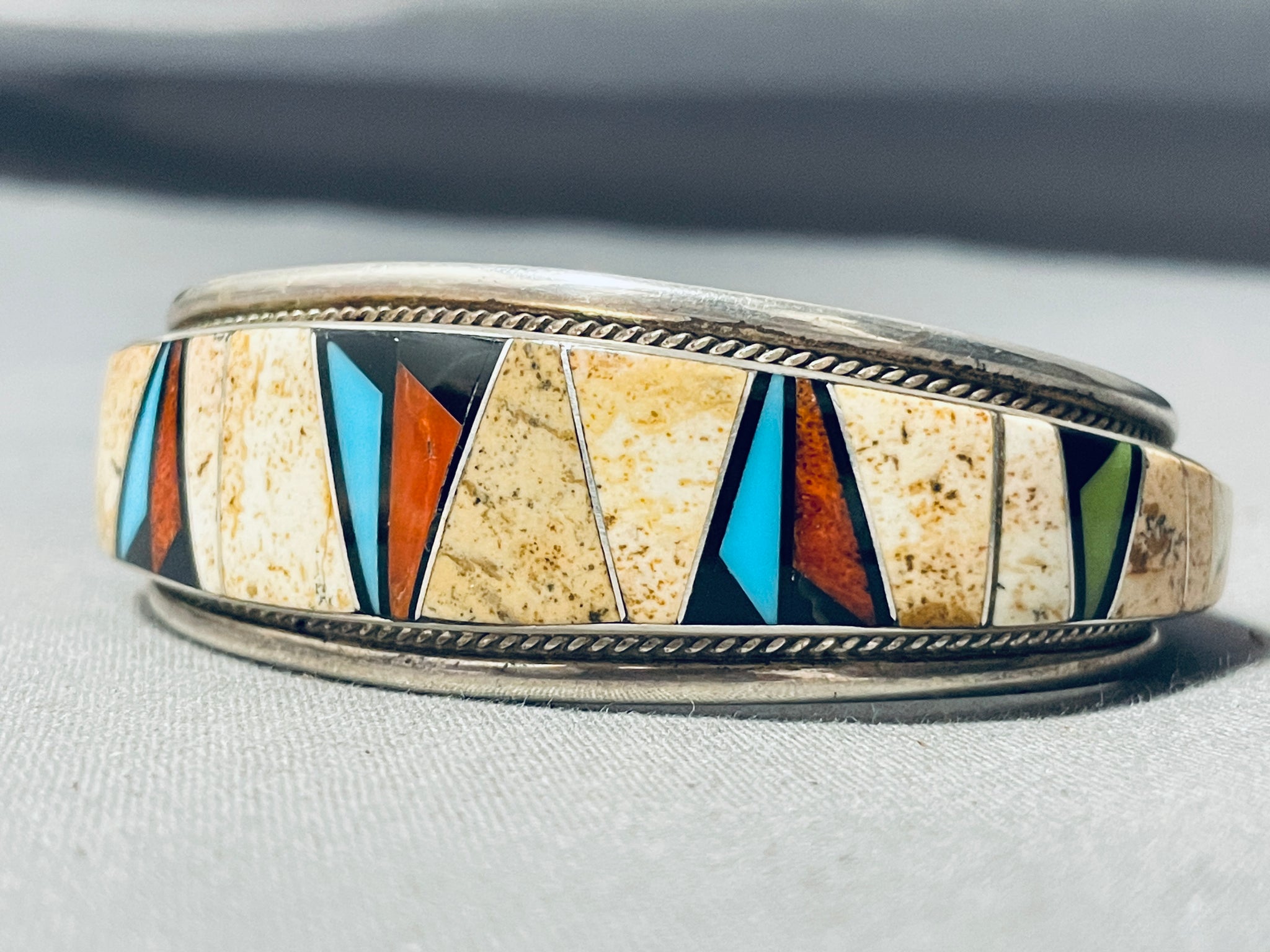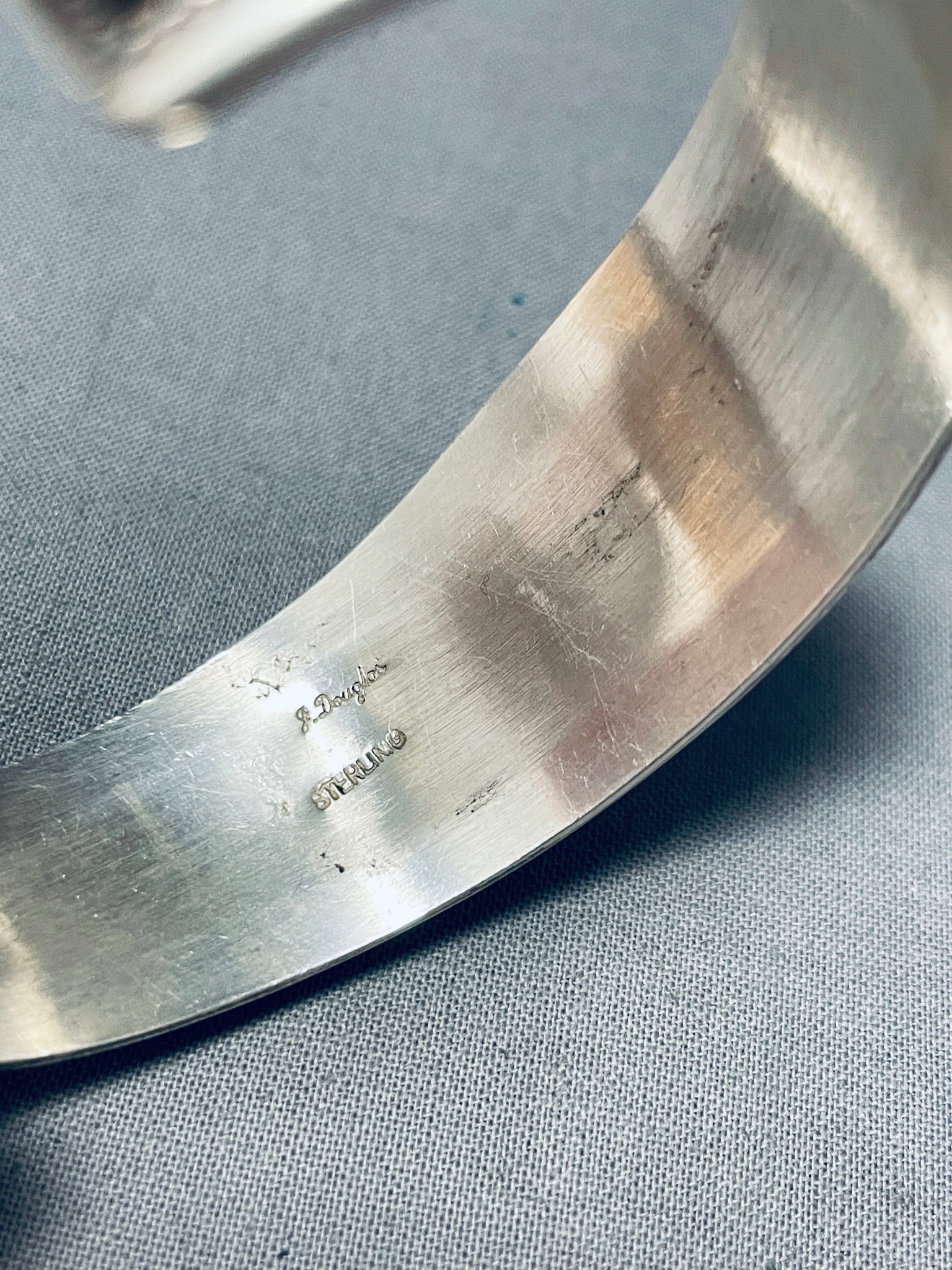 Douglas Signed Vintage Native American Navajo Turquoise Inlay Sterling Silver Inlay Bracelet