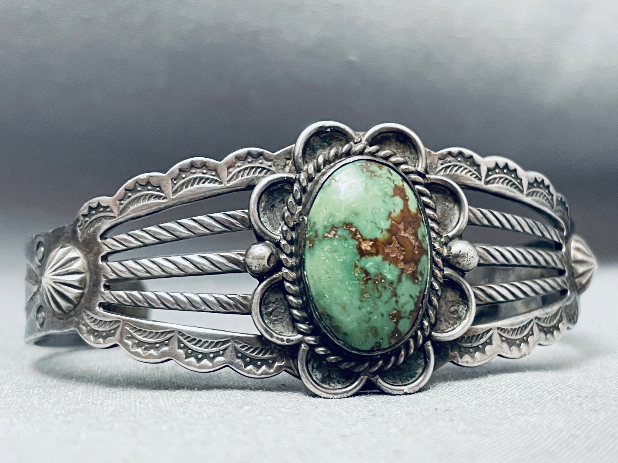 This is a magnificent vintage Navajo single stone silver bracelet. This remarkable bracelet contains a center oval shaped green Royston turquoise stone. Surrounding the stone are fascinating silver wave works, ropes and raindrops. This bracelet contains a wonderful five silver shank cuff that graduates into a single shank on both ends. The three center shanks consist of wonderful rope carvings while the outer shanks consist of beautiful sun stampings and bordering waving edges. Resting where the five silver shanks turn into a single shank are large silver shells. Running down the ends of the bracelet are long amazing sun stampings, such amazing workmanship. The center stone measures around 3/4" x 1/2". The width of the bracelet measures around 1". Sterling silver. Cir. Mid century+. The inside end to end measures around 5-1/4" with an additional 1-1/4" gap. Sturdy 22 grams.