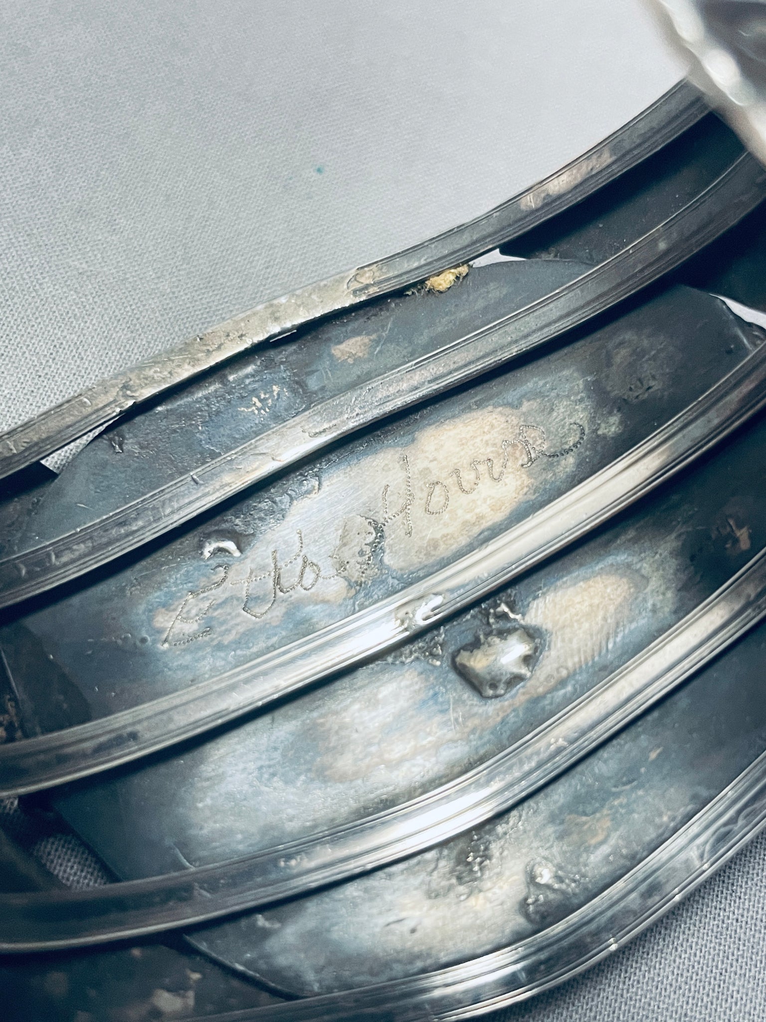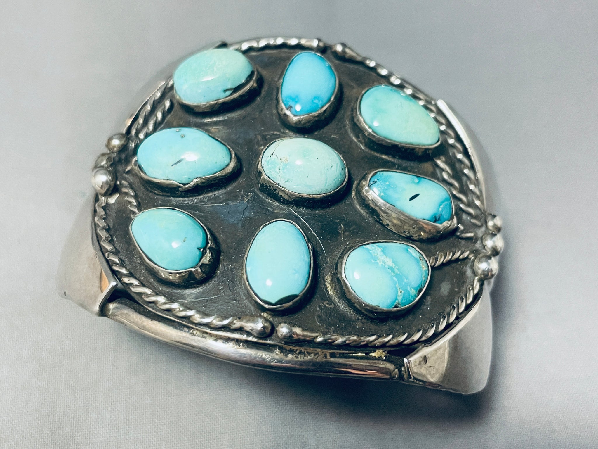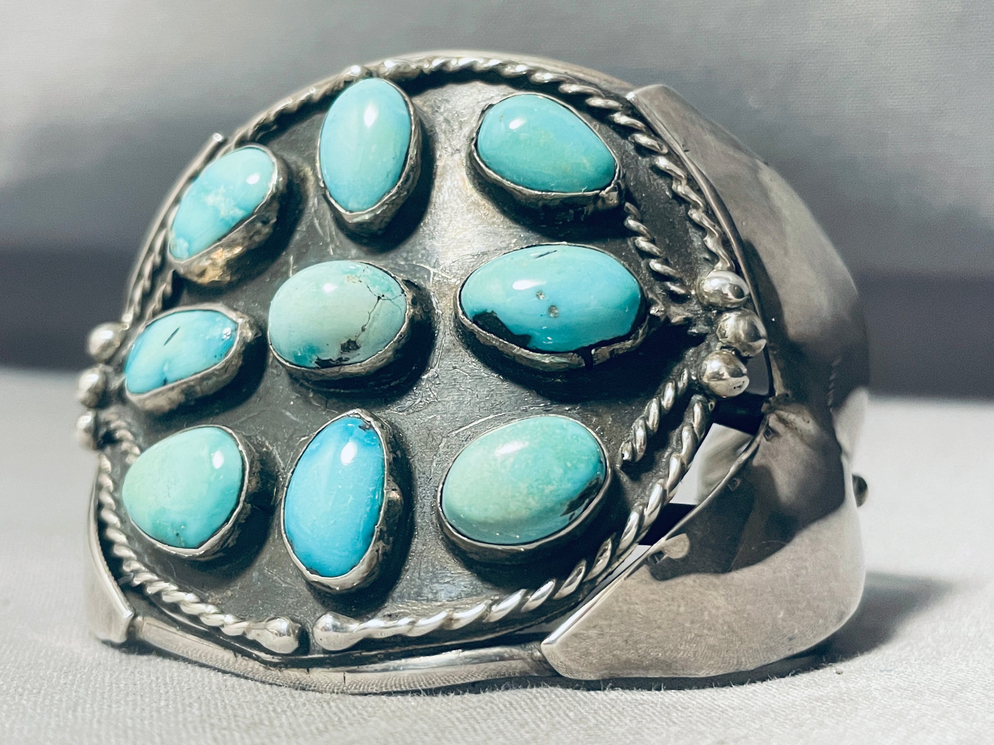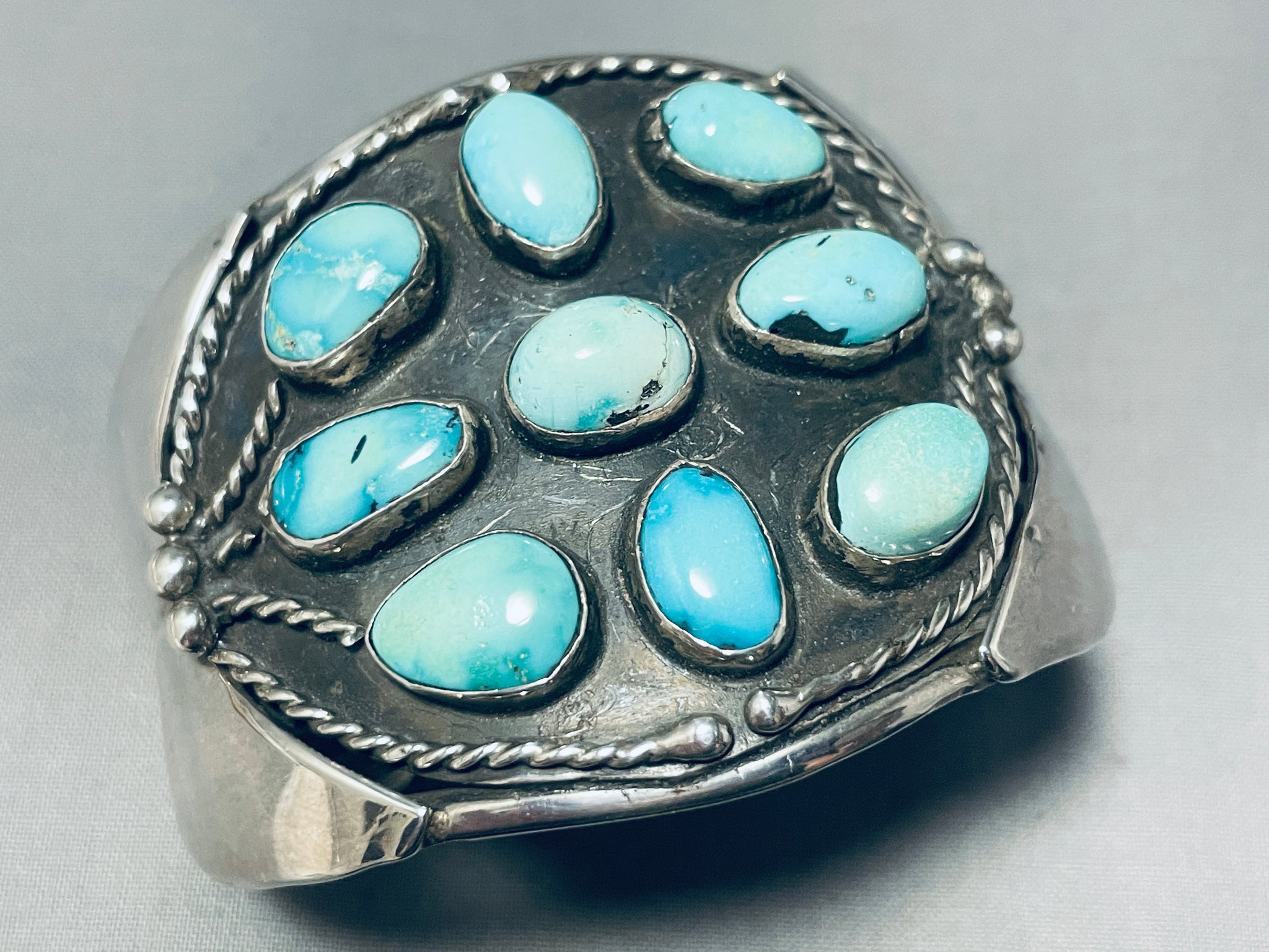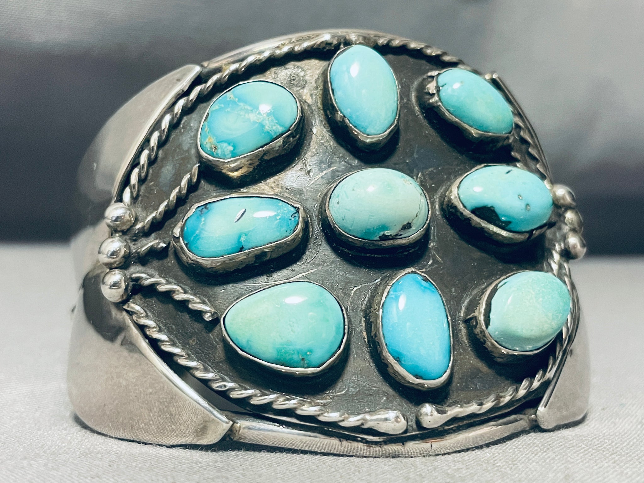 This is an astonishing vintage Navajo turquoise silver bracelet. This mind blowing bracelet contains 9 outstanding large chunky blue to green turquoise stones. Accenting the stones are impeccable silver rope stems with silver raindrops. I absolutely love the very large silver flanks that rest at each side of the bracelet. This marvelous bracelet consists of a phenomenal sturdy and thick five shank silver cuff that graduates in width towards the center. Just check out that incredible old natural patina. The stones measure around 1/2" x 3/8". The width of the bracelet measures around 2-1/8". Signed by Navajo artist, Etta H. Sterling silver. Cir. Mid century . The inside end to end measures around 5-1/4" with an additional 1-1/4" gap. Sturdy 79 grams.