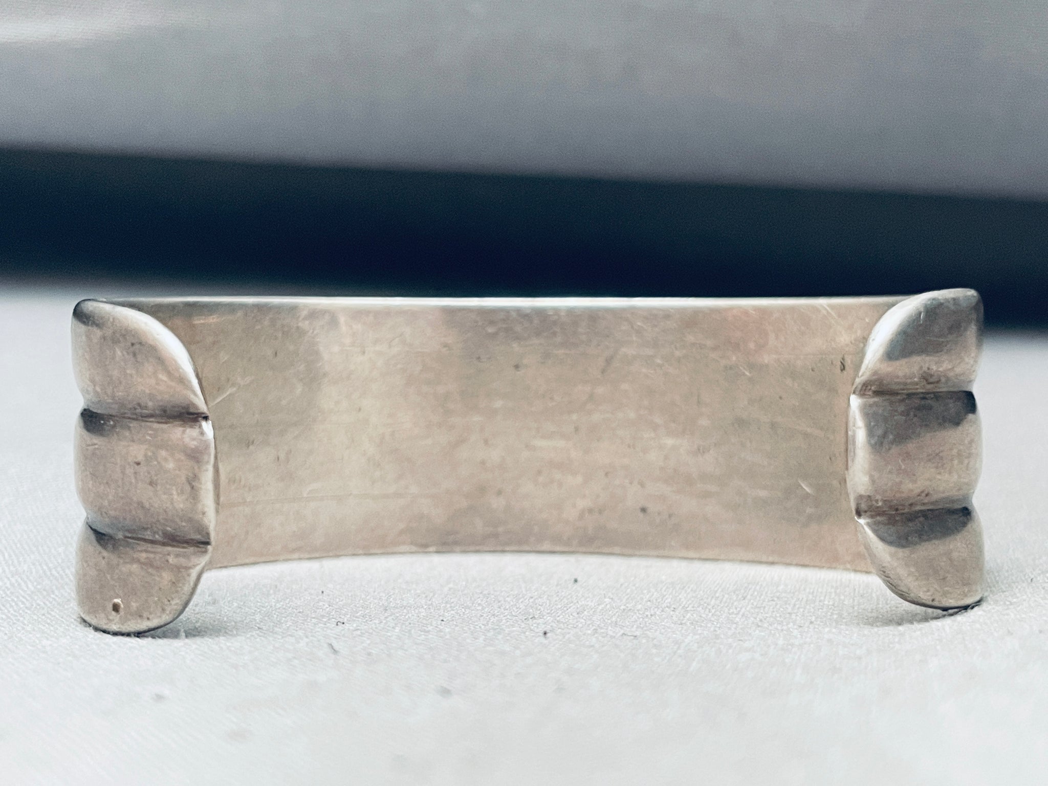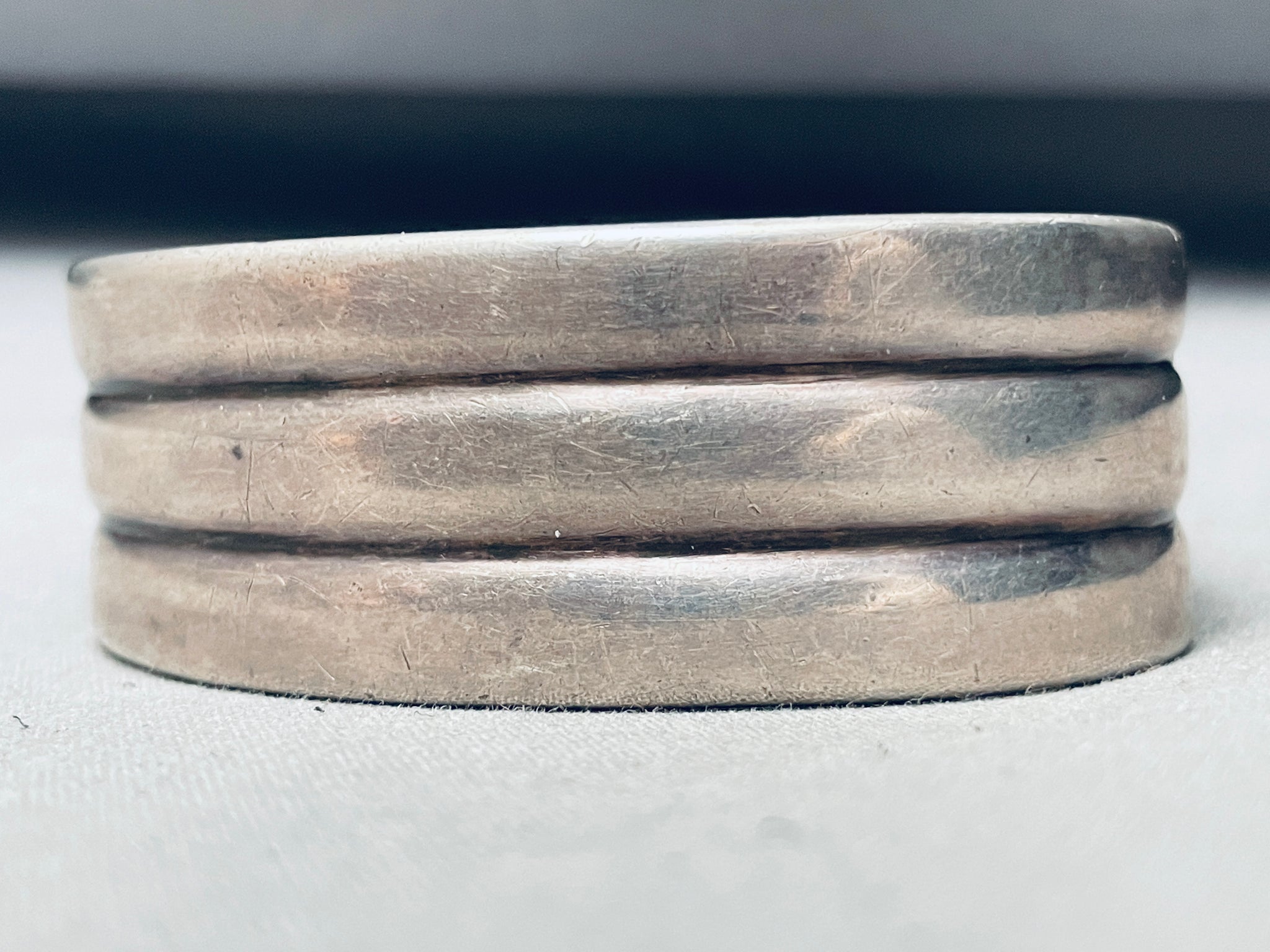 This is a marvelous vintage Navajo all silver cuff bracelet. This incredible bracelet contains two line segments that run from one end to the other giving the bracelet a three shank look. The simplicity of this bracelet is outstanding but making the bracelet a simplistic look is far from being simple. The width of the bracelet measures around 7/8". Sterling silver. Cir. Mid Century +. The inside end to end measures around 5-1/4" with an additional 1-1/2" gap. Sturdy 44 grams.