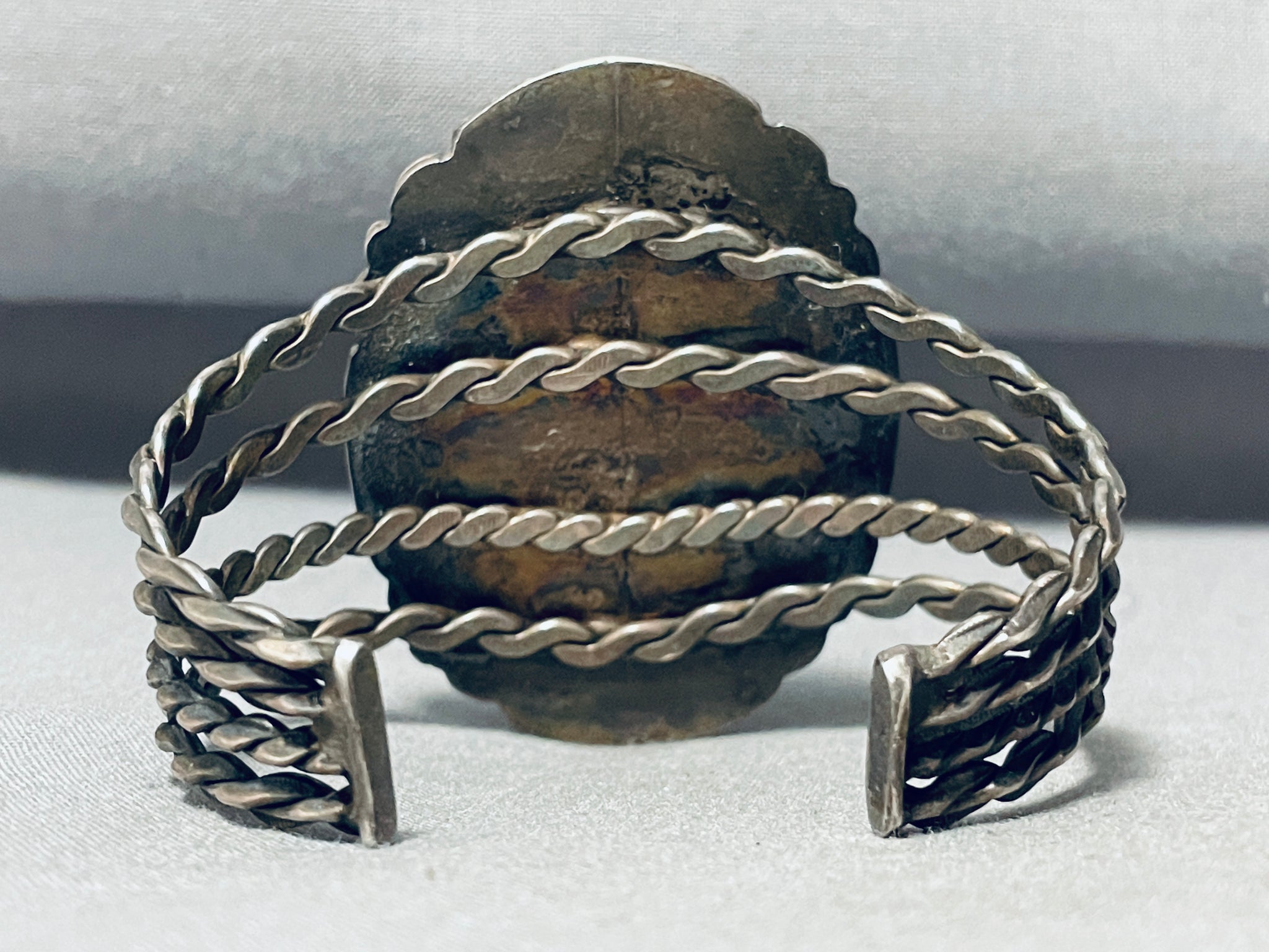 Look at those hadn woven sterling shanks! This is a superlative vintage Navajo very large single stone silver bracelet. This outstanding bracelet contains a marvelous center oval shaped tan, orange and black colored petrified wood stone. Surrounding the stone are phenomenal silver works that consist of raindrops, wave works and a rope. The impressive large and thick quadruple silver shank cuff is beautifully coiled on each shank from end to end. The old natural patina on the bracelet is just amazing. The height at the center of the bracelet measures around 2-1/4" while the width at the center of the quadruple silver shank cuff measures around 1-3/8". A Navajo silver bracelet featuring petrified wood is a unique and beautiful piece of jewelry that combines the craftsmanship of Navajo silversmithing with the natural beauty of petrified wood. Petrified wood is ancient wood that has undergone a fossilization process, turning it into stone while preserving its original cellular structure. Navajo silversmiths are renowned for their skill in creating exquisite silver jewelry, often incorporating traditional motifs and techniques passed down through generations. When combined with petrified wood, they create a striking contrast between the silver and the rich earthy tones and patterns of the wood. Wearing a Navajo silver bracelet with petrified wood can be a meaningful way to connect with the natural world and appreciate the artistry of Native American culture. It serves as a unique adornment and a conversation starter, as you can share the story of petrified wood and the craftsmanship behind the piece. The center stone measures around 1-3/4" x 1-1/4". Sterling silver. Cir. Mid century . The inside end to end measures around 5-1/4" with an additional 1" gap. Sturdy 52 grams.
