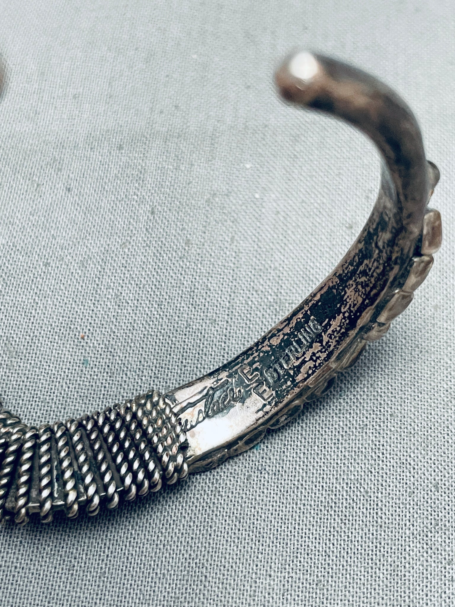 This is an exquisite vintage Navajo very thick all silver bracelet. This remarkable bracelet contains a unique design with the cuff waving across the center. Located on the ends are phenomenal chunky teepee patterns and located in the center is a coiled silver rope that beautifully wraps around the shank. This bracelet is absolutely astonishing with how intircate and detailed it is. The width of the bracelet measures around 3/4". Signed by Navajo artist, EE. Sterling silver, marked. Cir. 1970's+. The inside end to end measures around 5-1/2" with an additional 3/4" gap. Sturdy 35 grams.