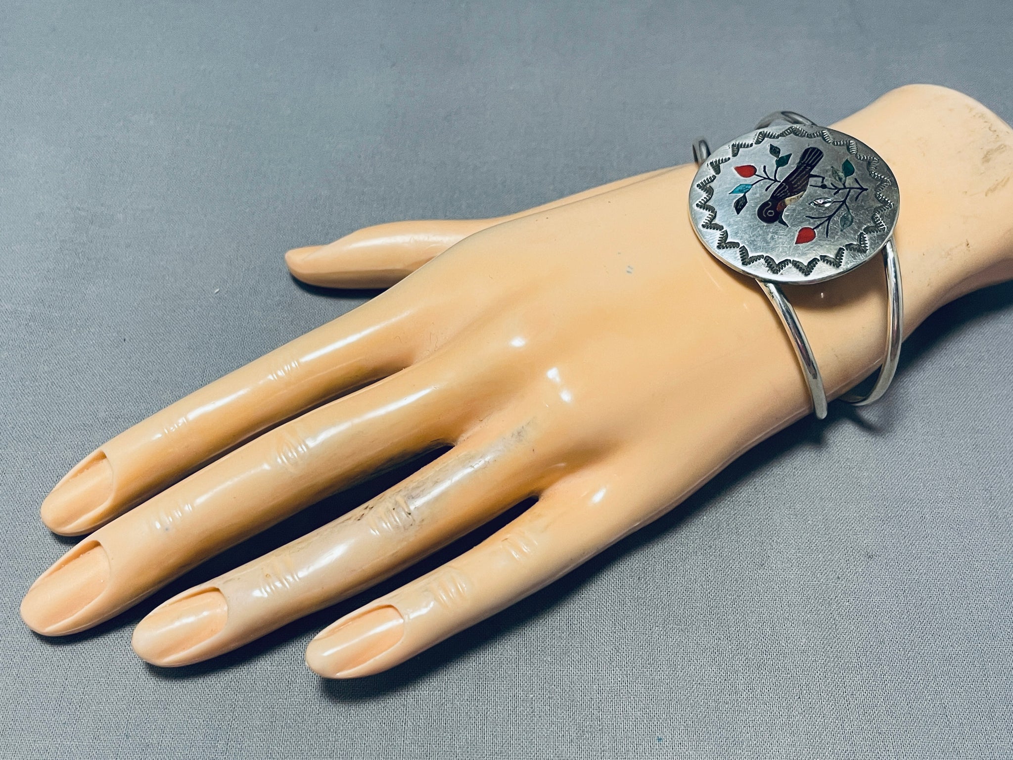 Happy Life Bird Native American Navajo Coral Sterling Silver Inlay Bracelet