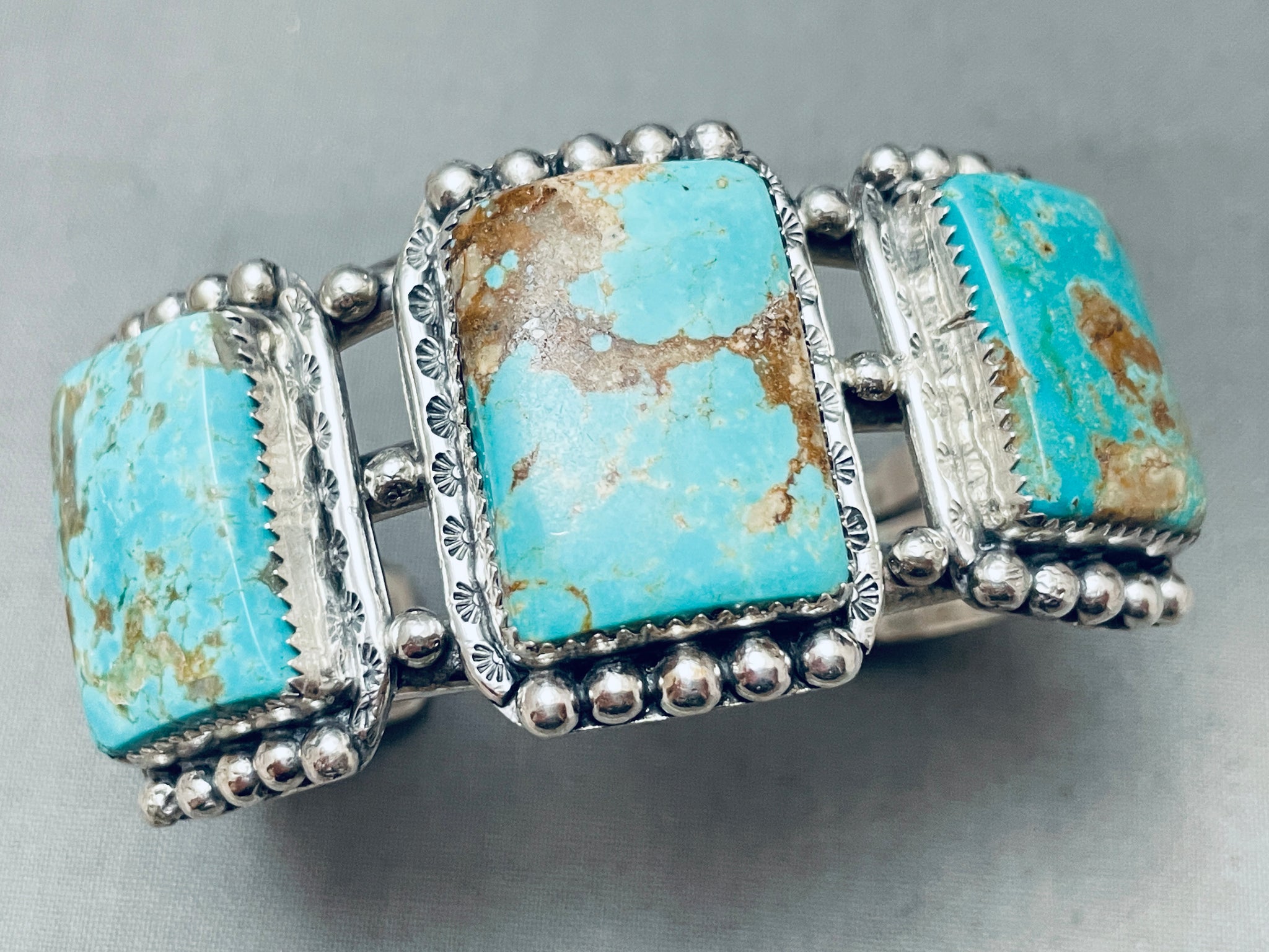This is an exceptional vintage Navajo large three stone silver bracelet. This incredible bracelet contains three gigantic rectangular shaped Easter Blue turquoise stones. Surrounding each of the stones are fascinating large chnky silver raindrops with accenting sun stampings. This bracelet contains a fabulous sturdy and thick triple silver shank cuff that graduates in width towards the center with end terminal caps for a more comfortable fit. The height at the center of the incredible bracelet measures around 1-3/8" while the width at the center of the triple silver shank cuff measures around 1". The center stone measures around 1" x 3/4". Signed by Navajo artist, Helen Harrison. Sterling silver, marked. The inside end to end measures around 5-1/4" with an additional 1" gap. Sturdy 62 grams.