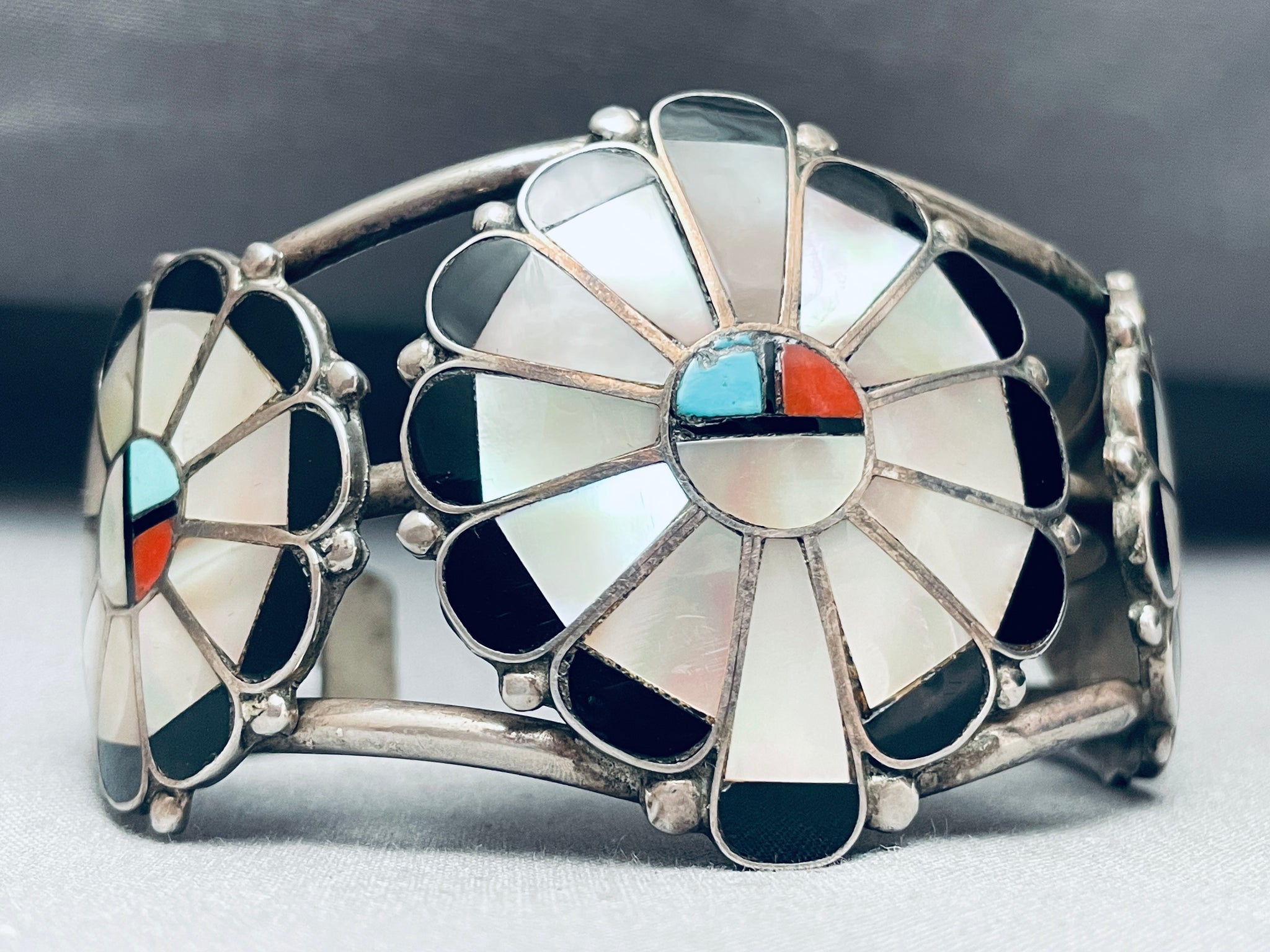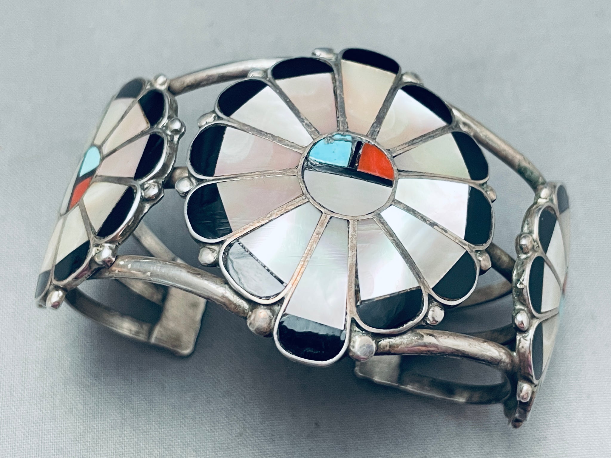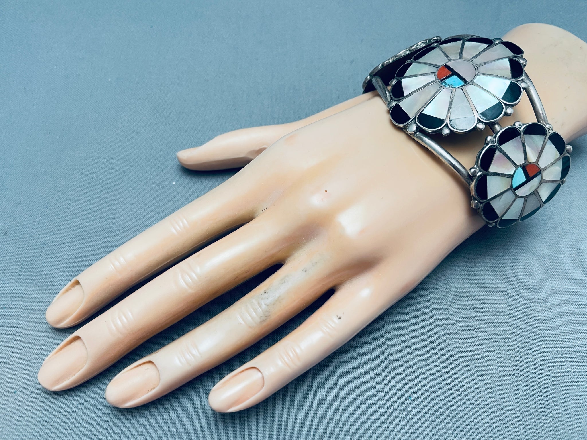 Huge Quality Vintage Native American Zuni Turquoise Inlay Sterling Silver Bracelet