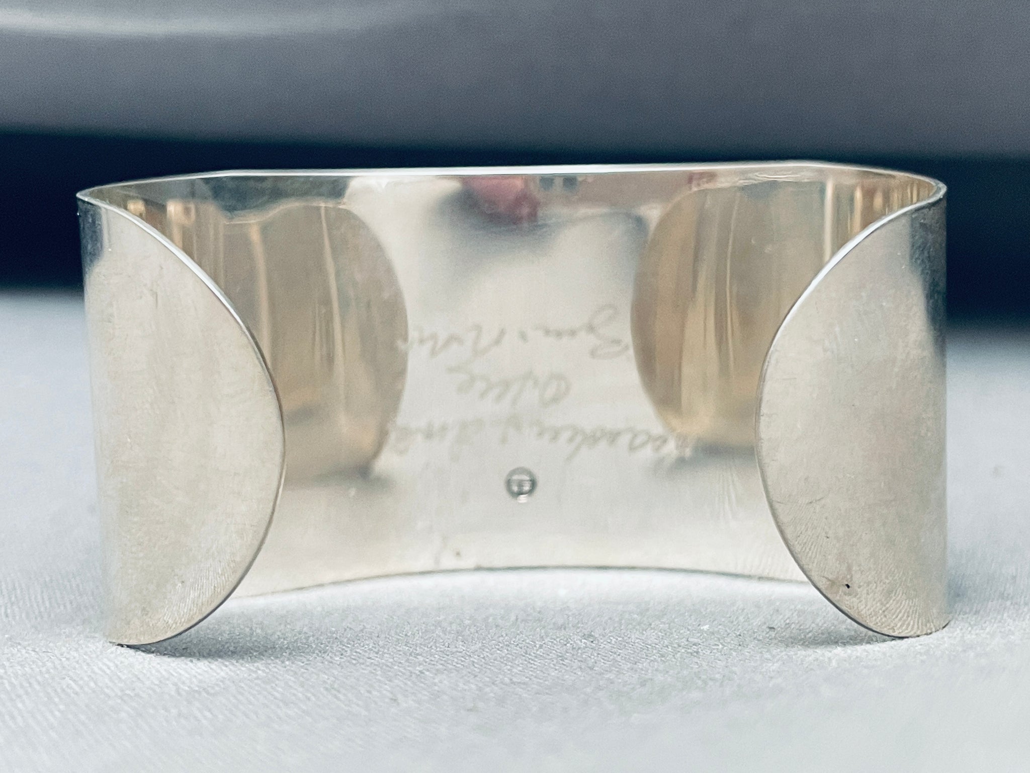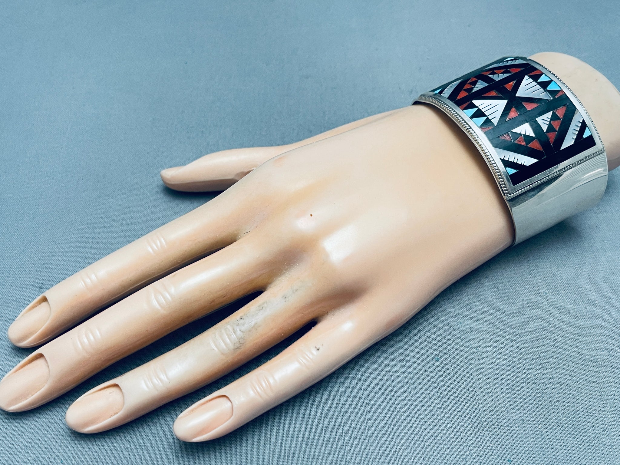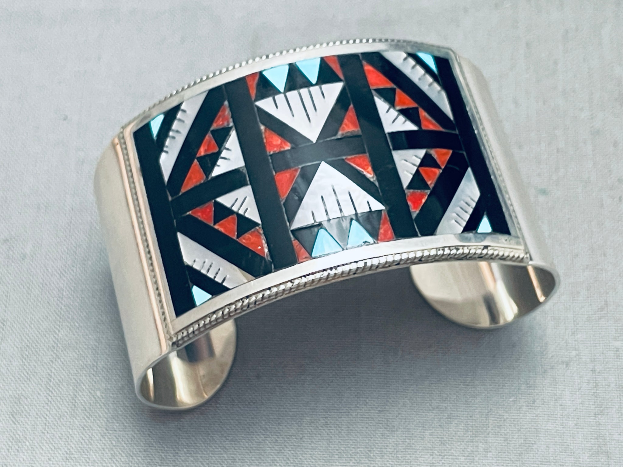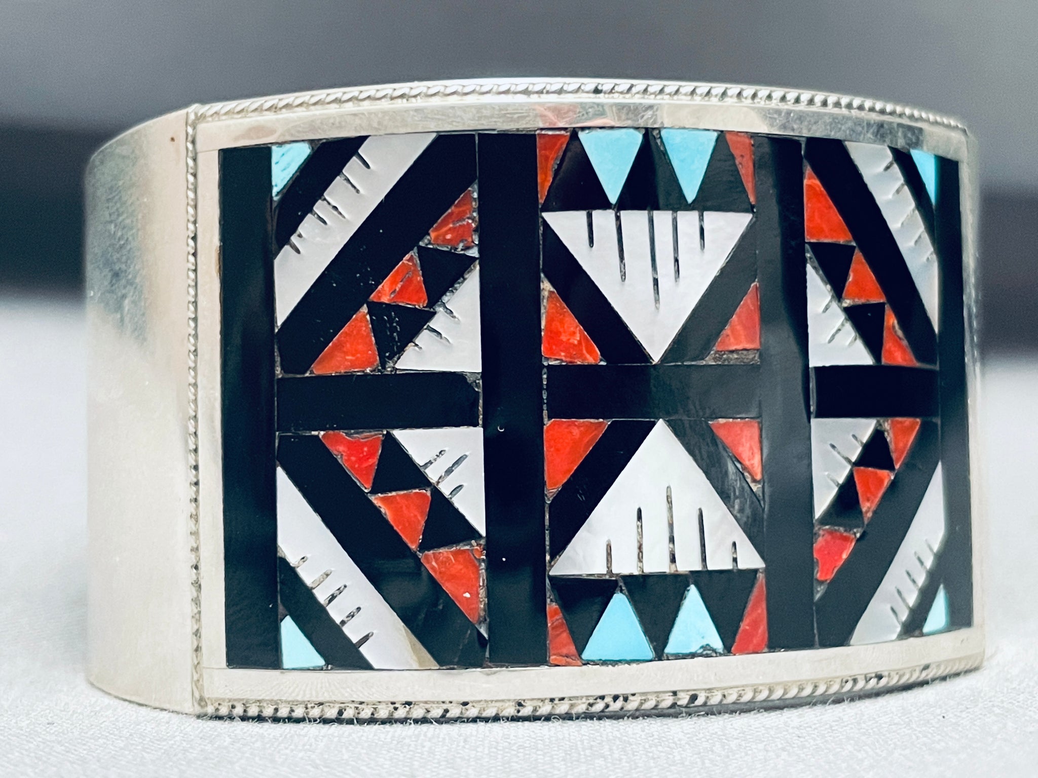 Leo Otue Vintage Native American Zuni Rug Inlay Turquoise Sterling Silver Bracelet