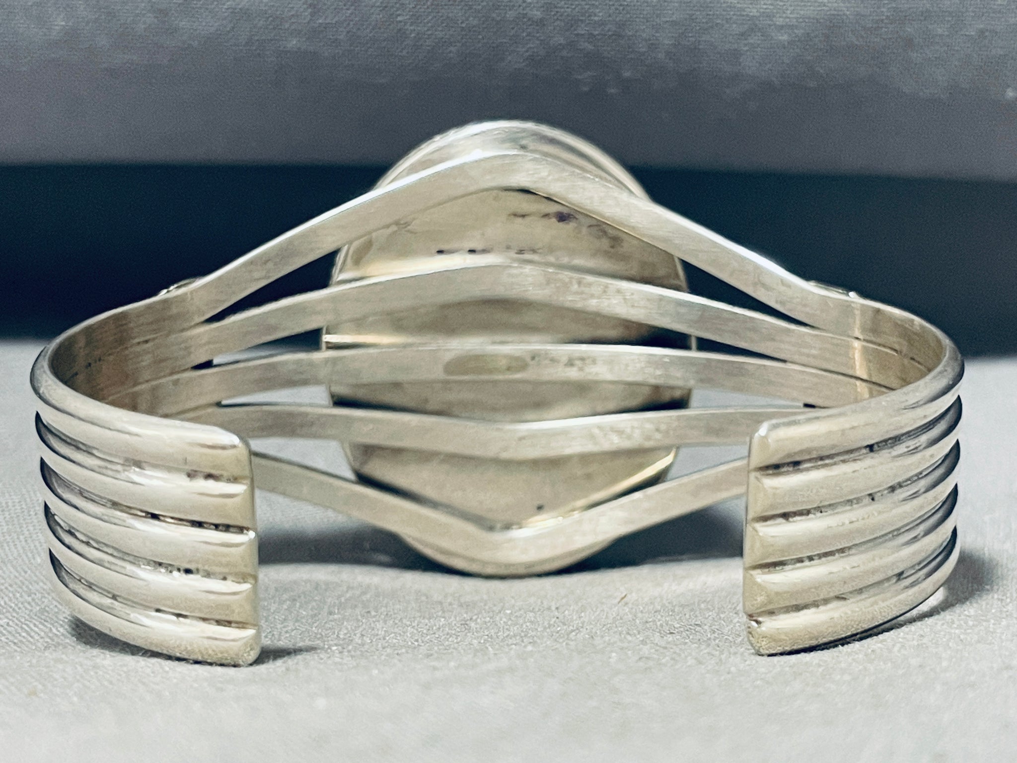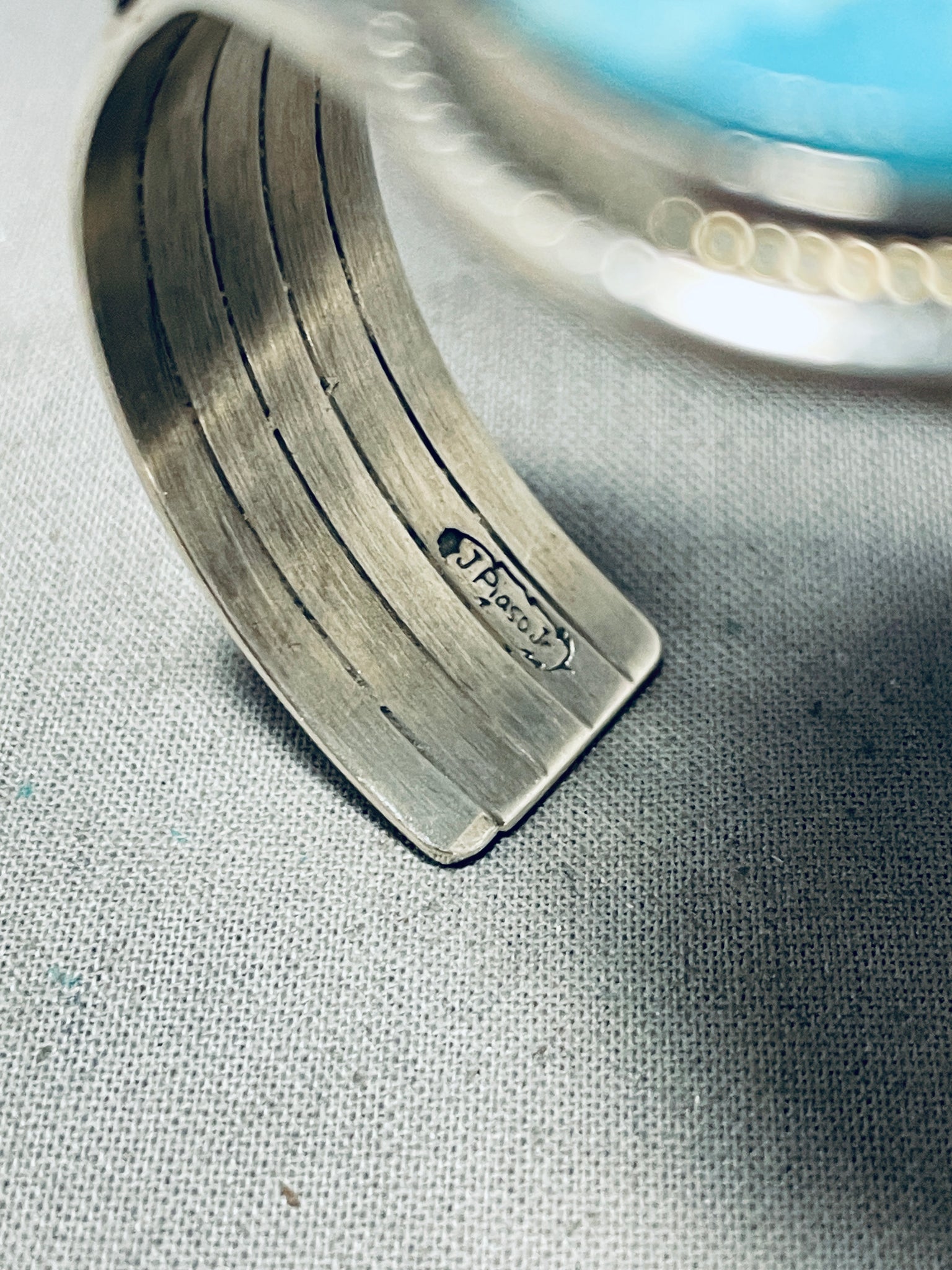 The center stone measures around 1-3/8" x 1". The width of the bracelet measures around 1-1/2". Signed by Navajo artist, J. Piaso, Jr.. Sterling silver, marked. The inside end to end measures around 5-1/2" with an additional 1-1/8" gap. Sturdy 53 grams.