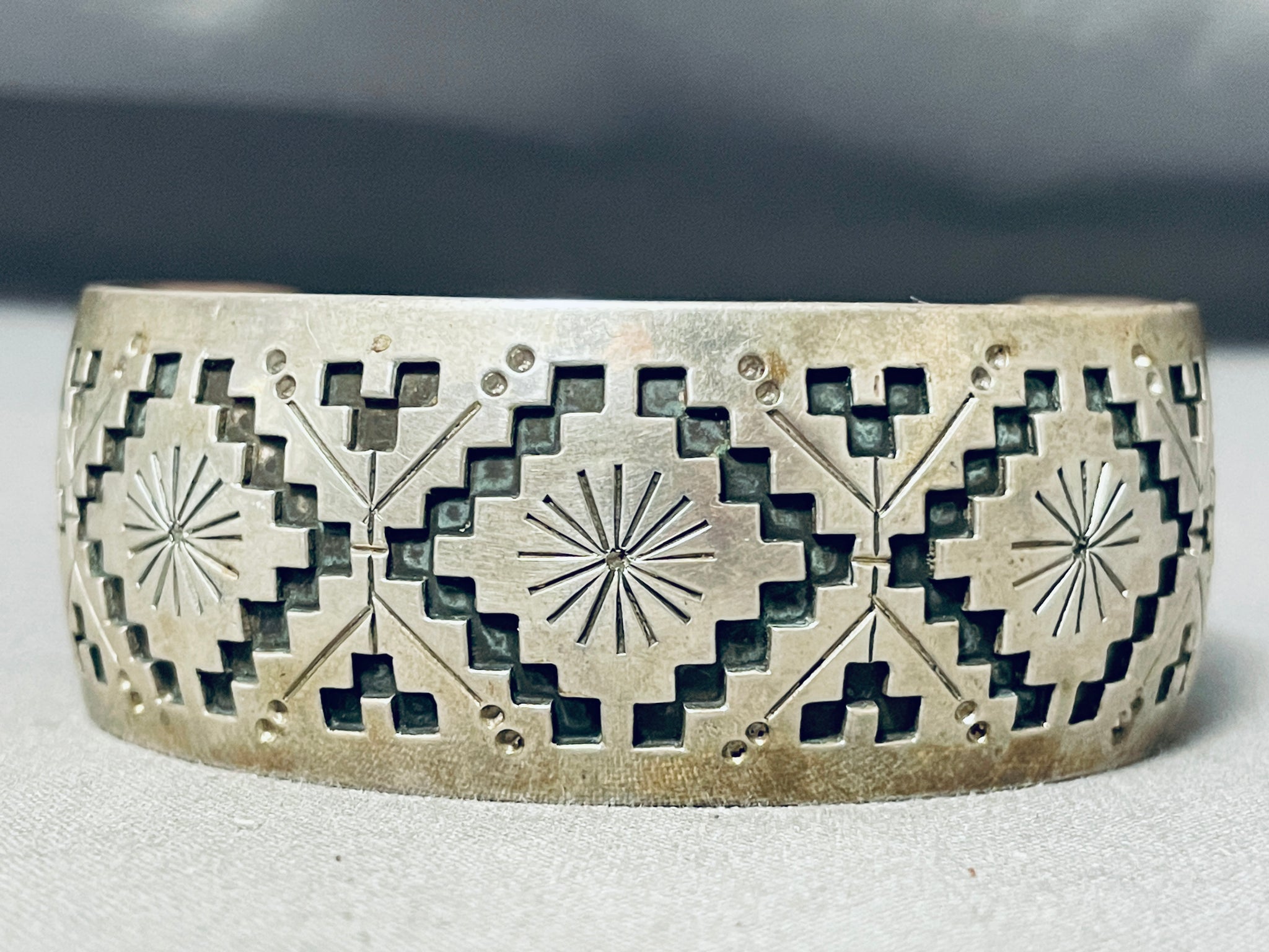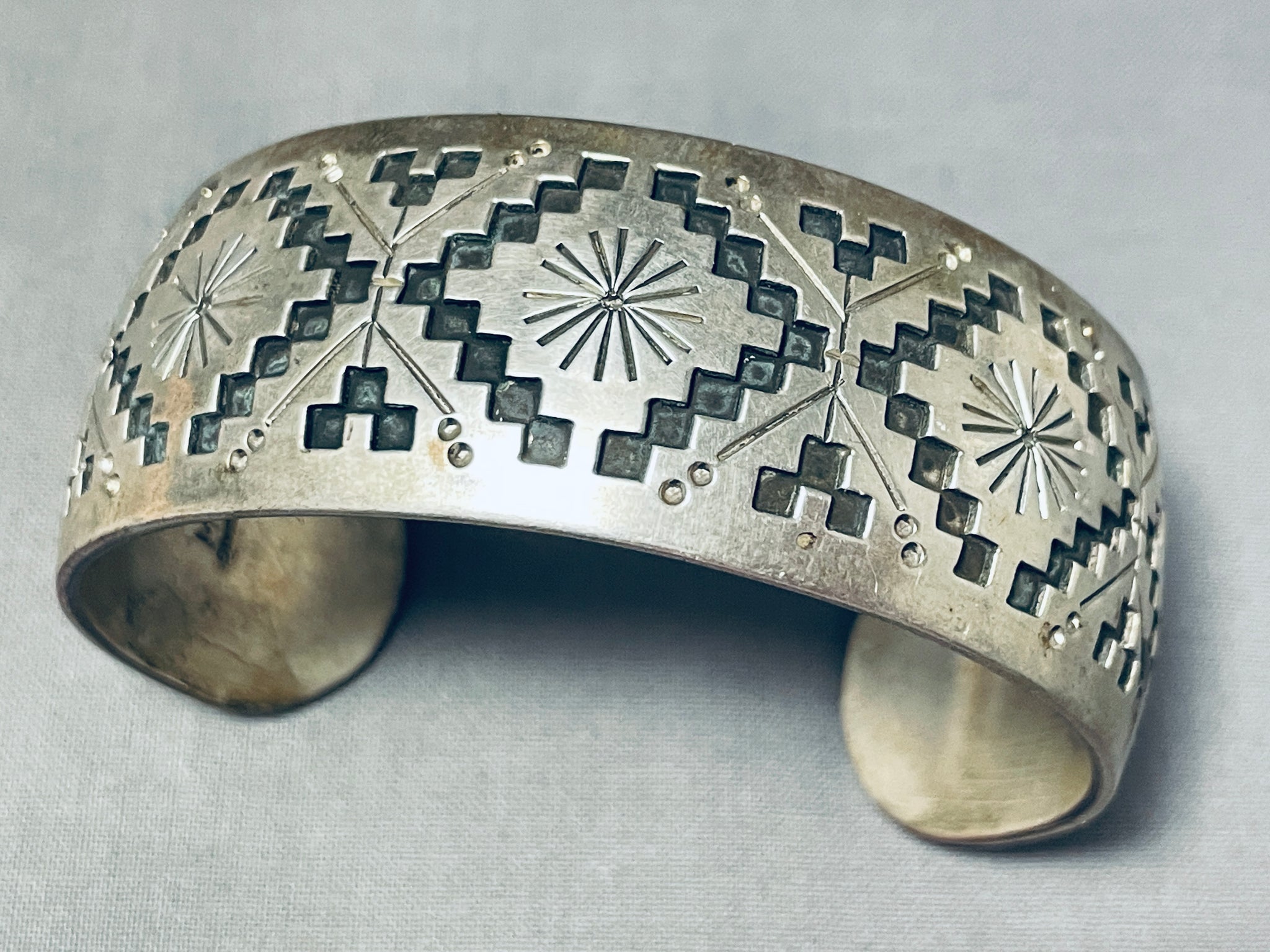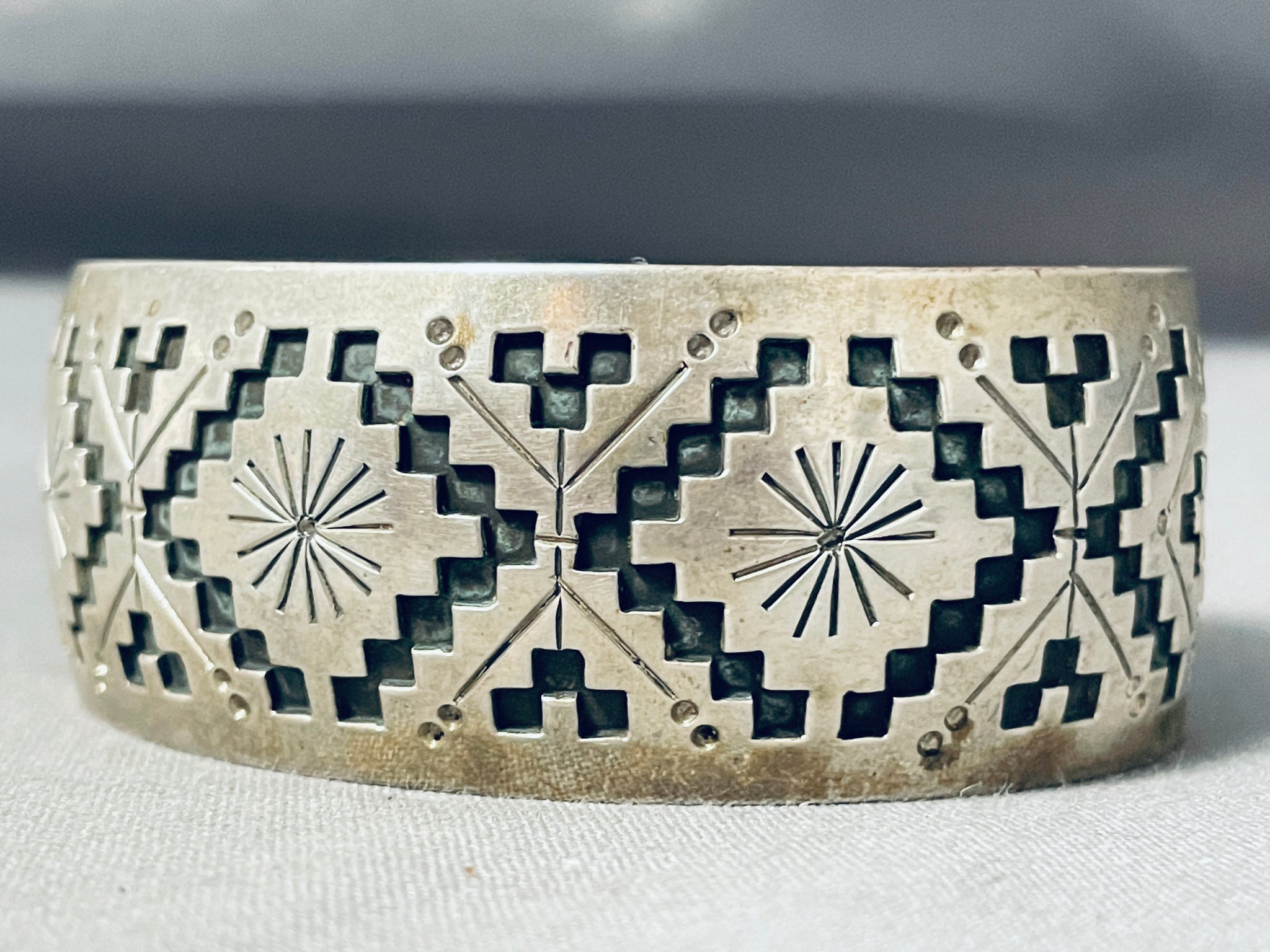 Mesmerizing Vintage Native American Navajo Sterling Silver Rug Designs Large Bracelet