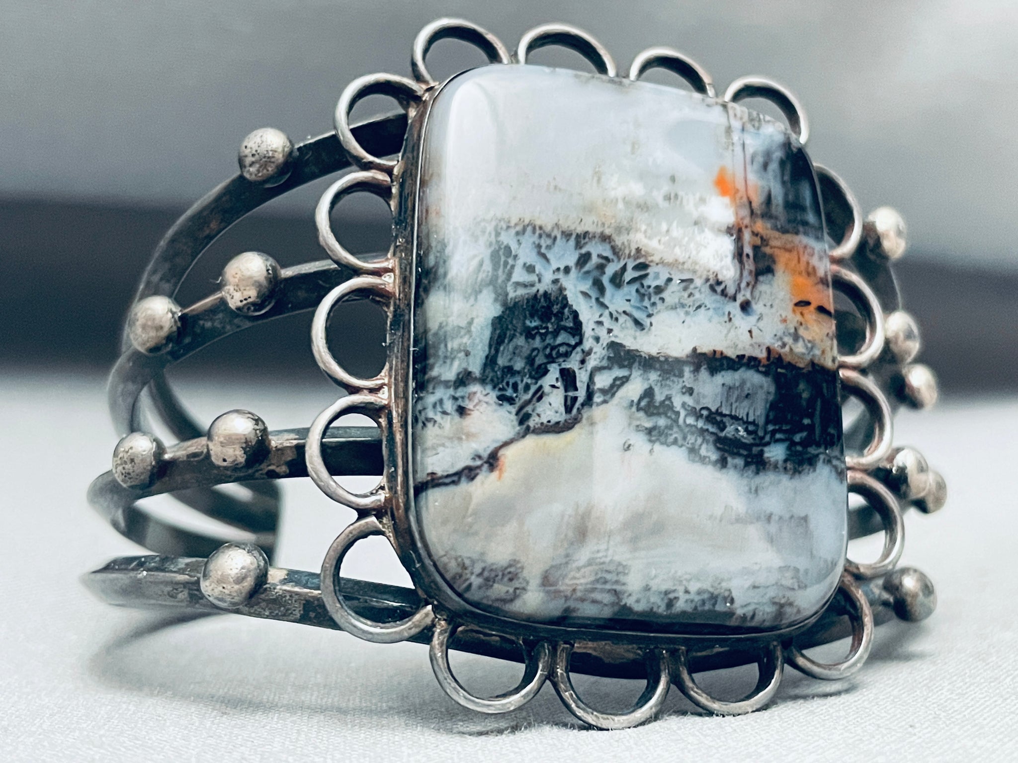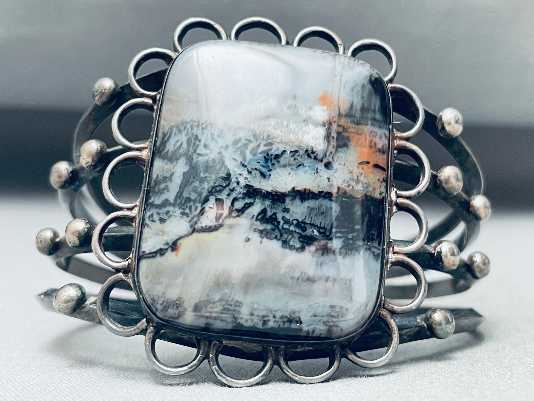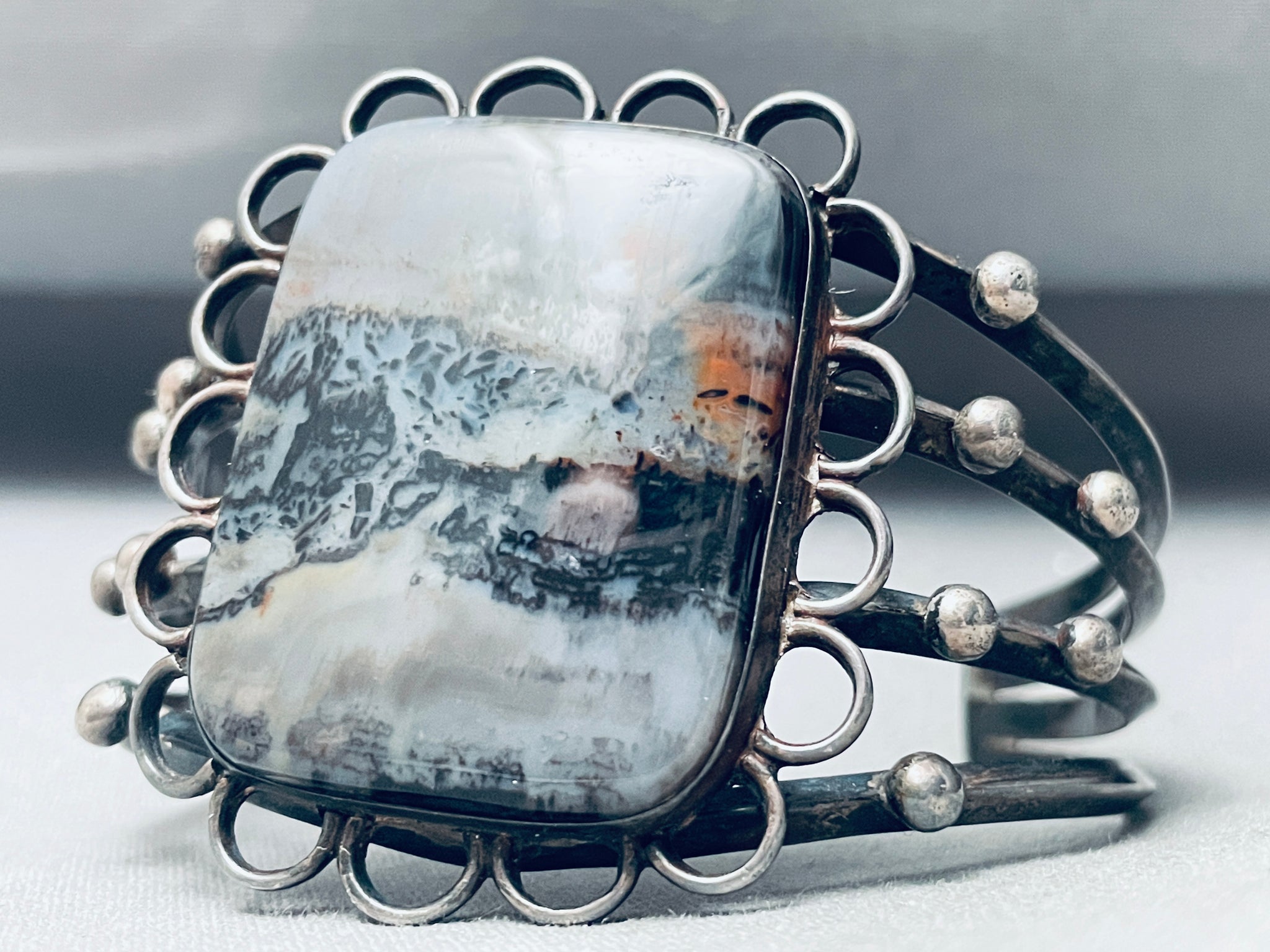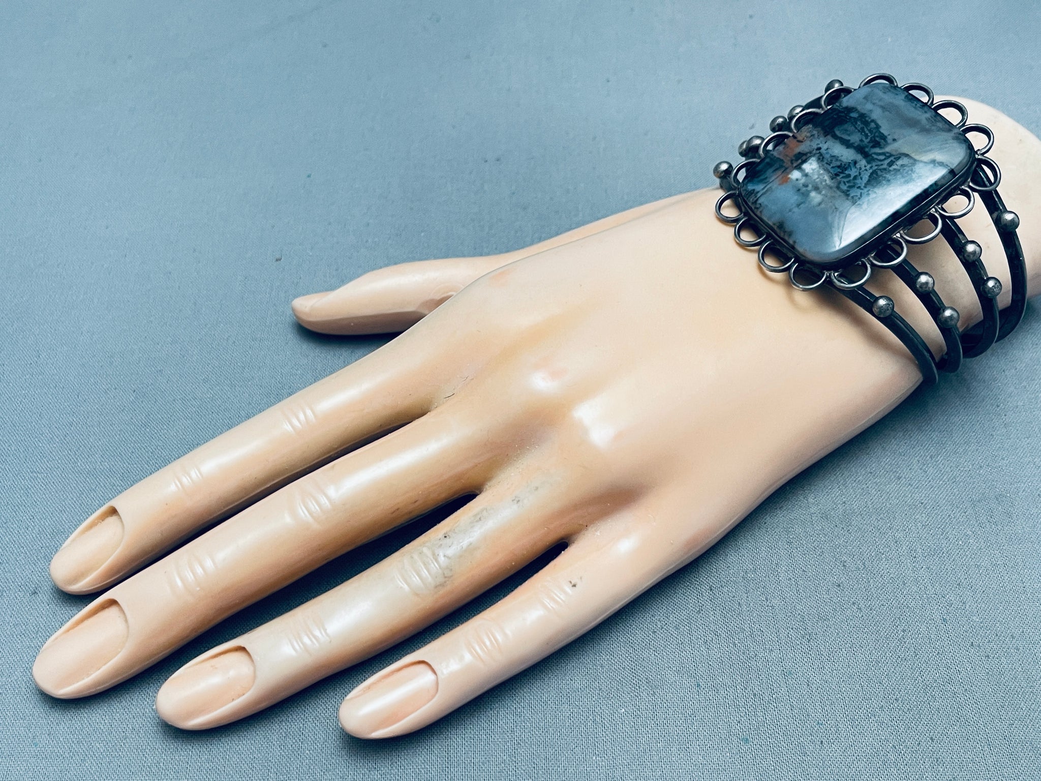 This is a superior vintage Navajo single stone silver bracelet. This amazing bracelet contains a large rectangular shaped agate stone. The stone is a beautiful gray to black color. Surrounding the stone are fascinating wave works and raindrops. This incredible bracelet contains a graduating four shank silver cuff. The height at the center of the bracelet measures around 1-7/8" while the width of the four silver shank cuff measures around 1-1/2". The center stone measures around 1-3/8" x 1-1/8". Sterling silver. Cir. Mid century +. The inside end to end measures around 5-1/2" with an additional 1-1/4" gap. Sturdy 45 grams.