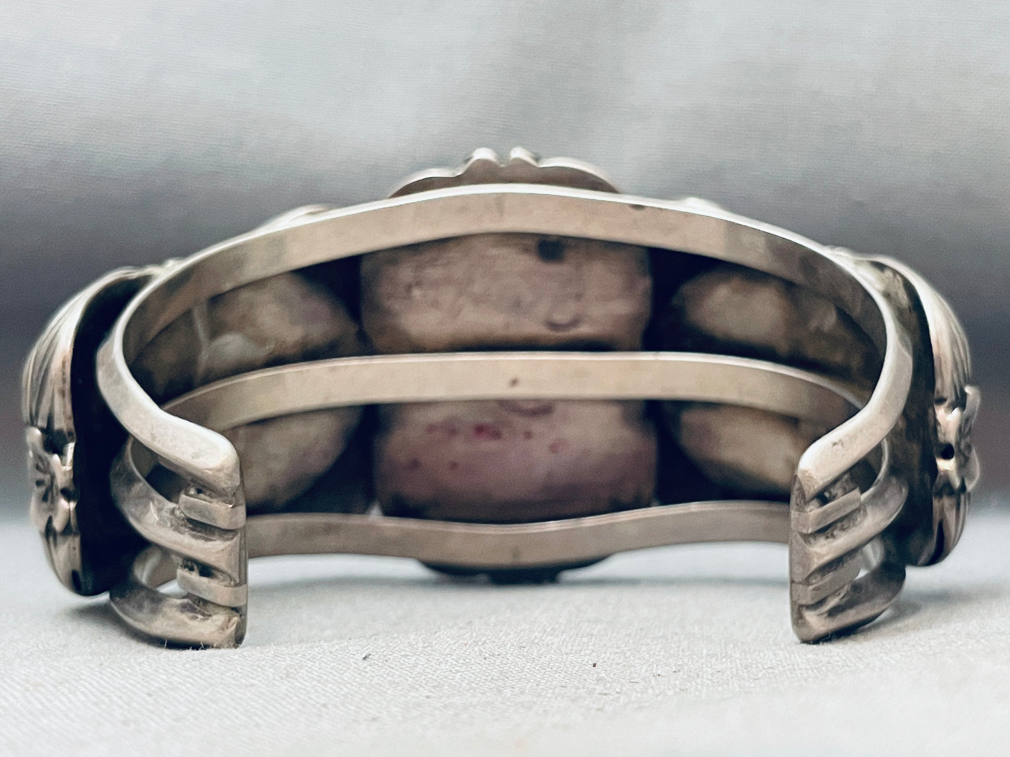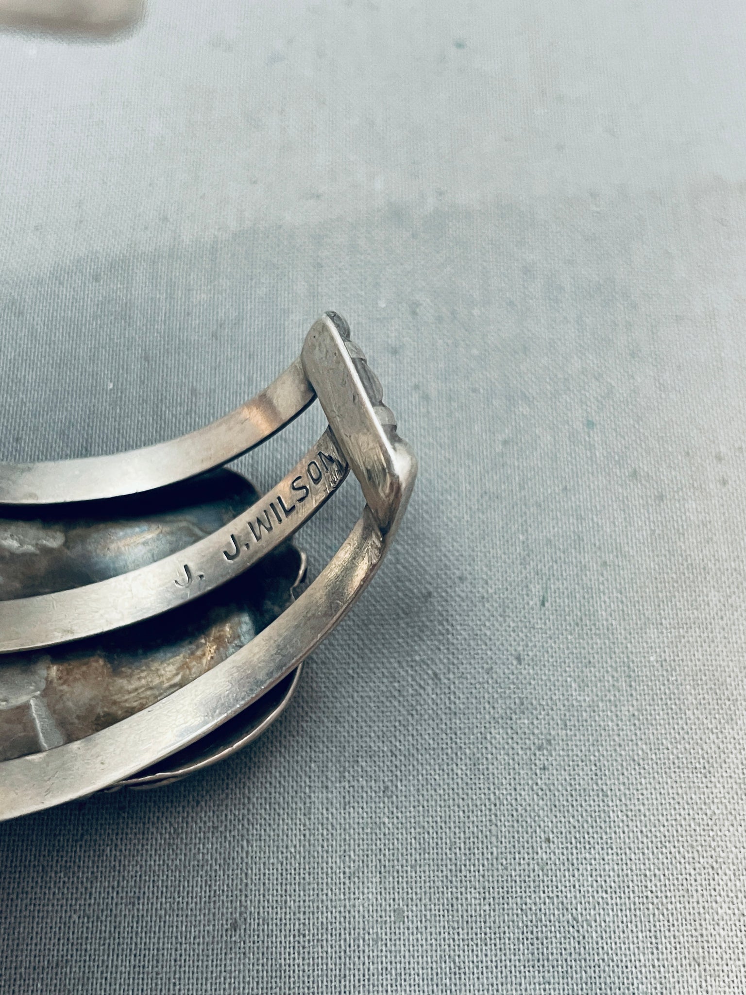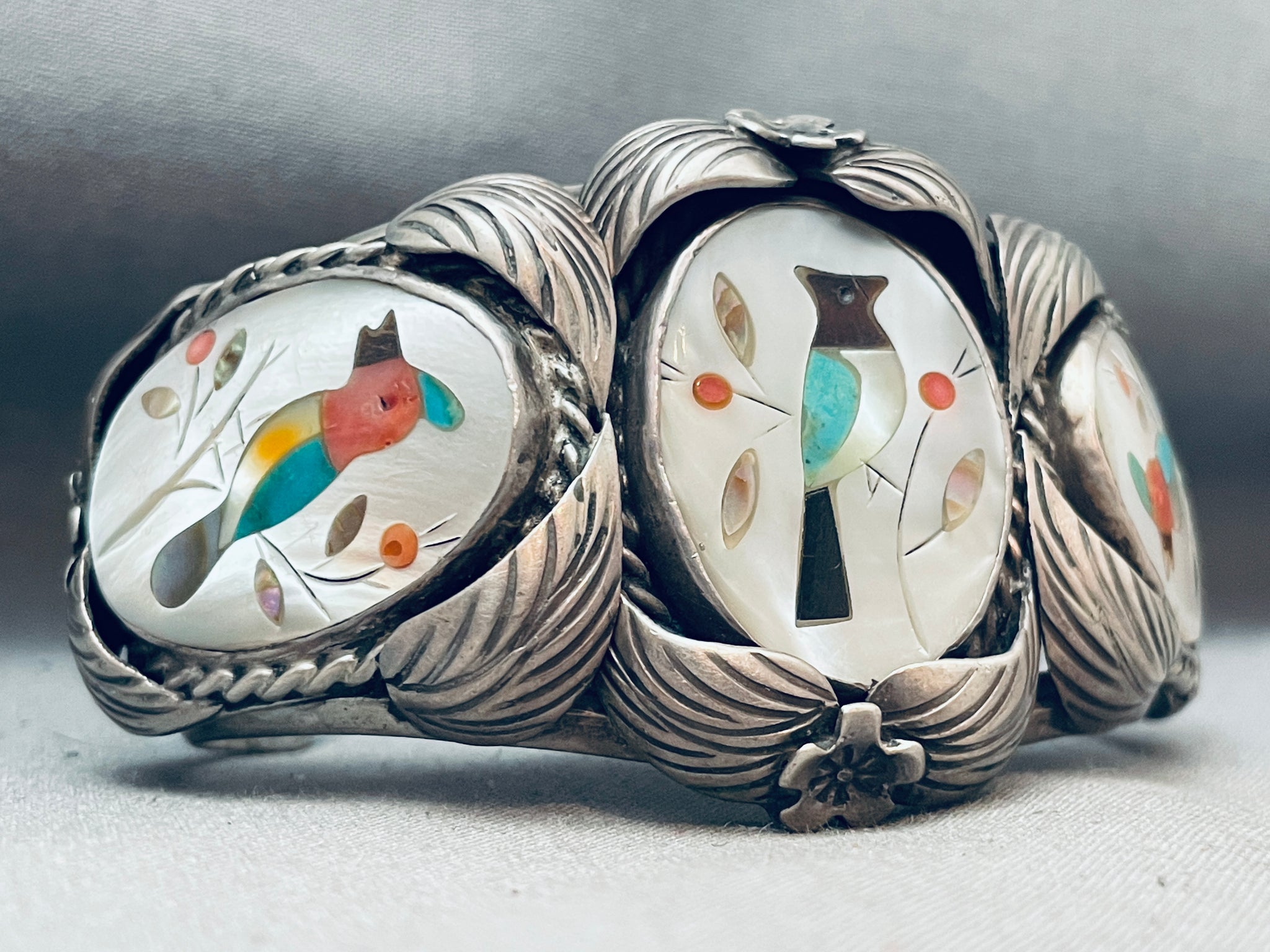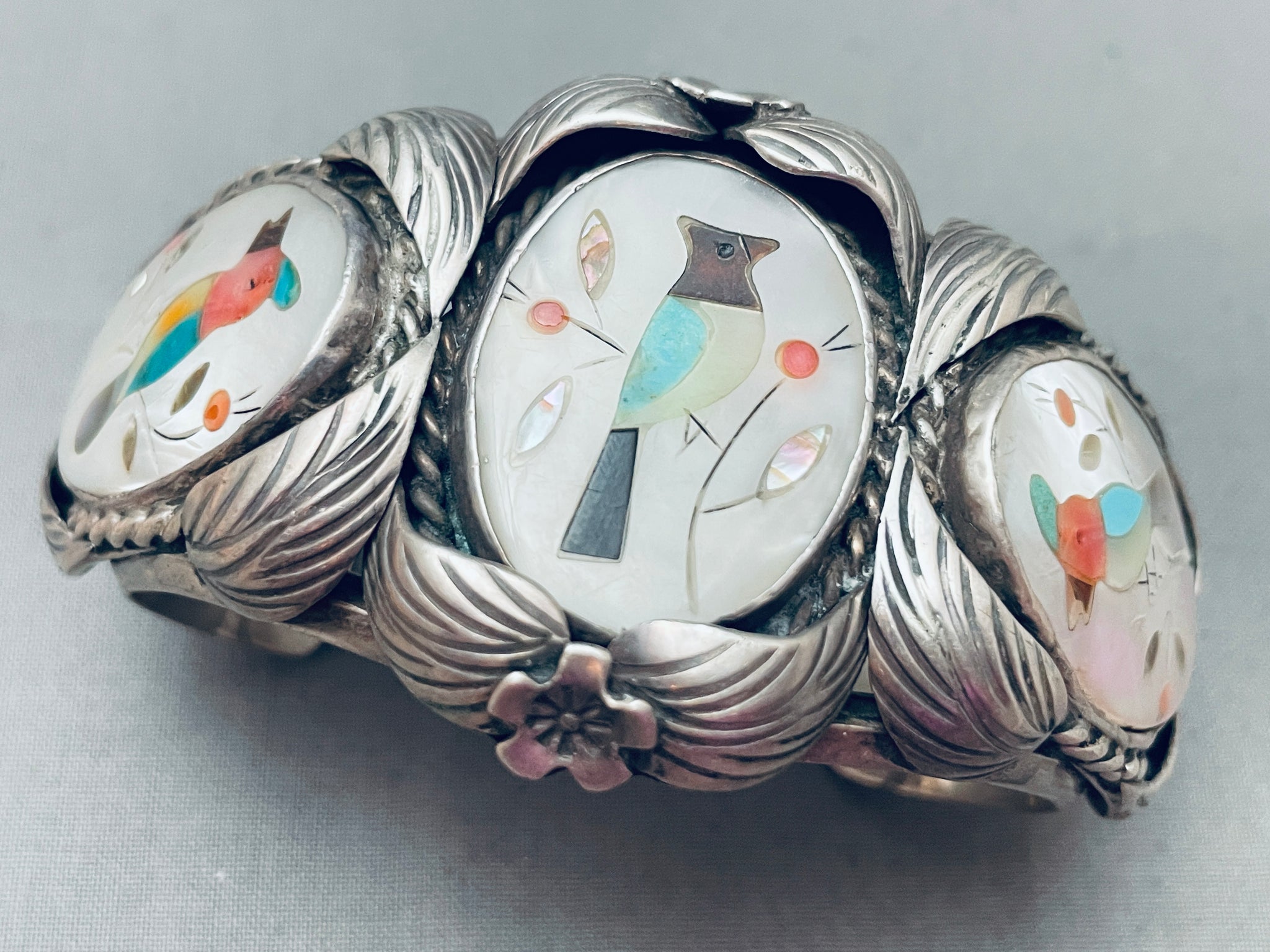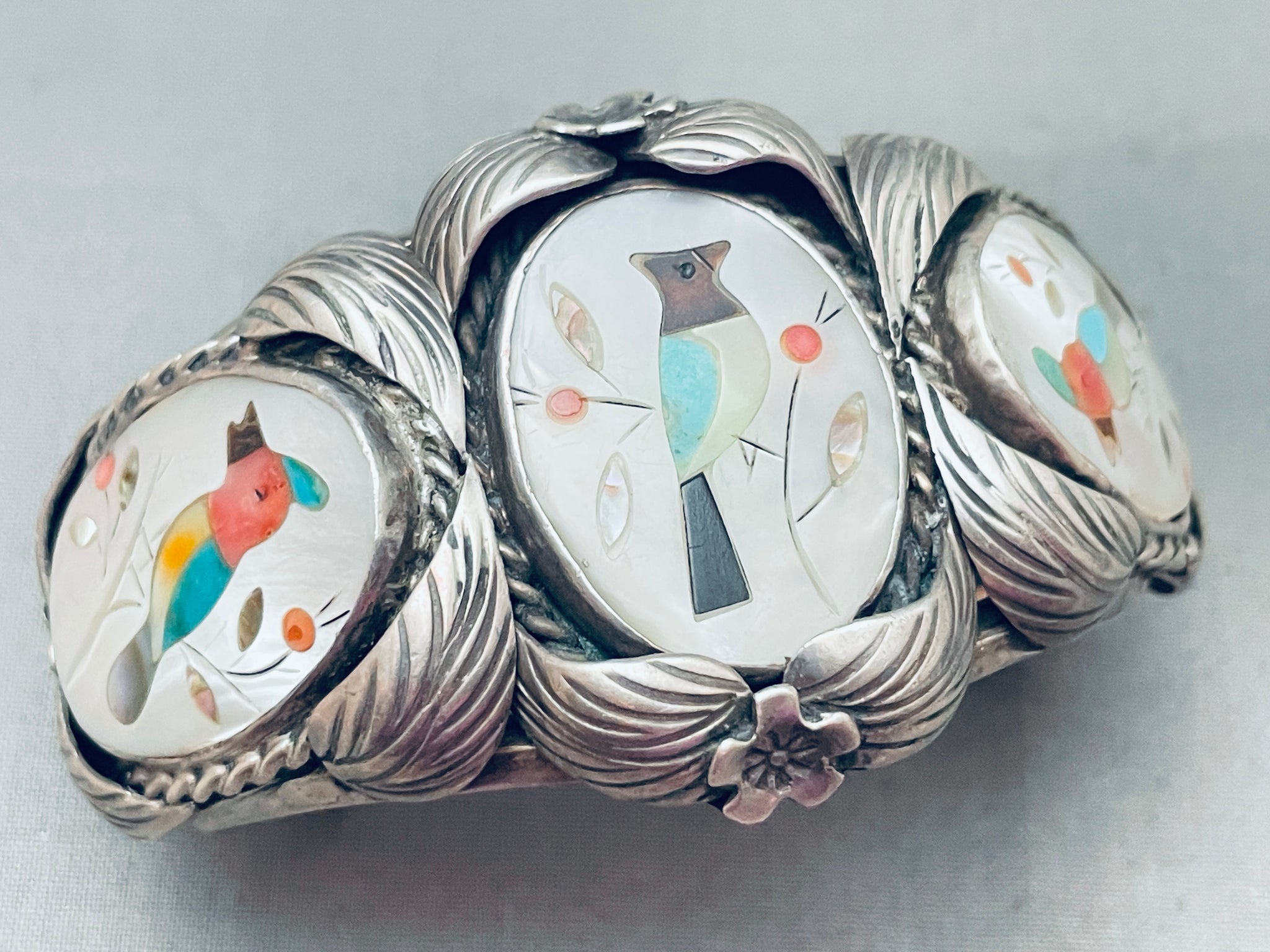 This is an astonishing vintage Zuni inlaid silver bracelet. This remarkable bracelet contains three outstanding inlaid bird sections that each consist of marvelous mother of pearl, brown shell, pink coral, opal, and turquoise. Surrounding each of the inlaid bird sections are marvelous silver works that include hand carved detailed 3D silver leaves, flowers, and thick silver ropes. The intricacy and detailing on this bracelet is just phenomenal. The bracelet consists of a wonderful sturdy and thick triple silver shank cuff. The width of the bracelet measures around 1-3/4". Signed by Zuni artist, JJ Wilson. Sterling silver. Cir. 1970's+. The inside end to end measures around 5" with an additional 1-1/2" gap. Sturdy 72 grams.