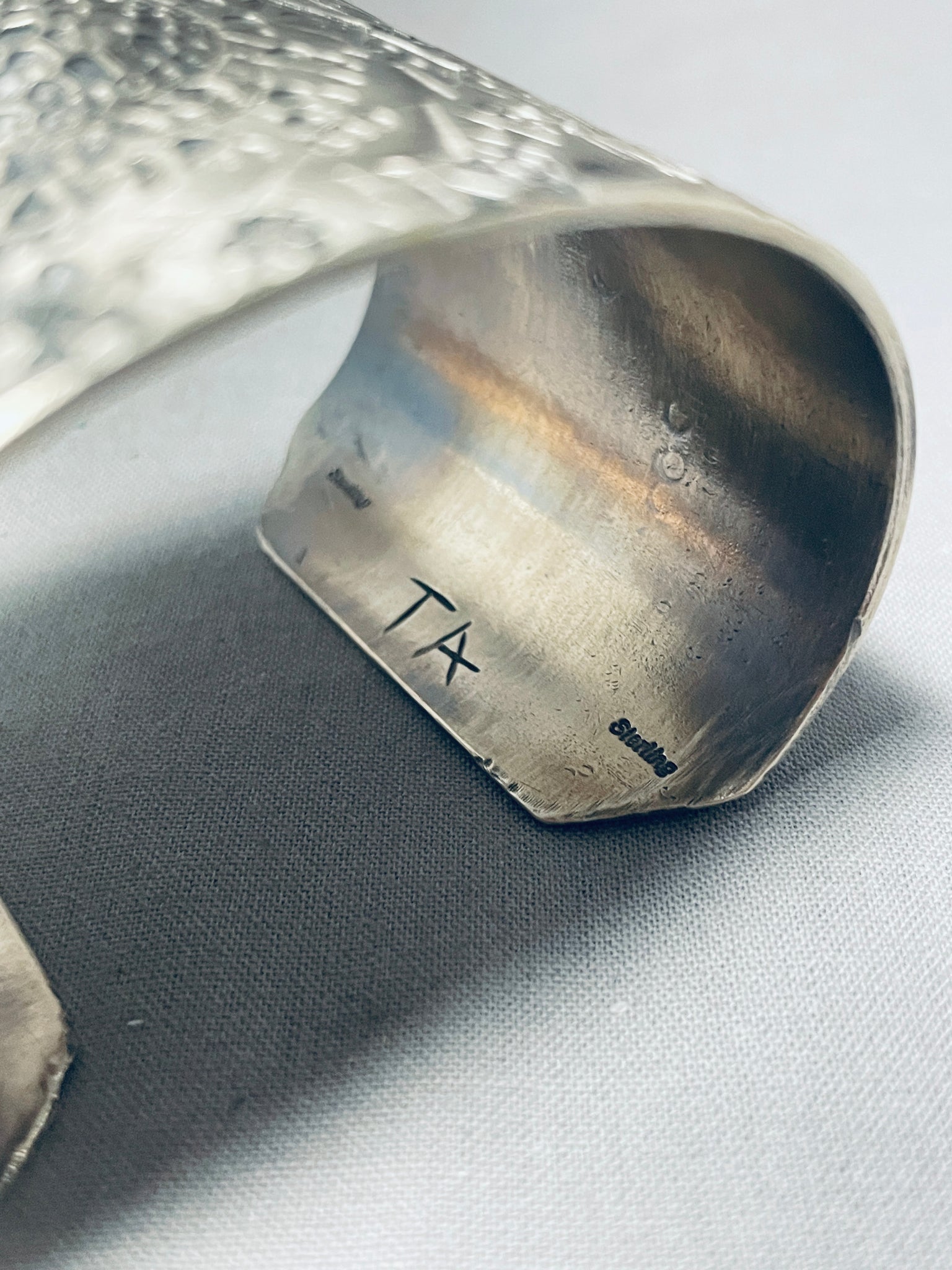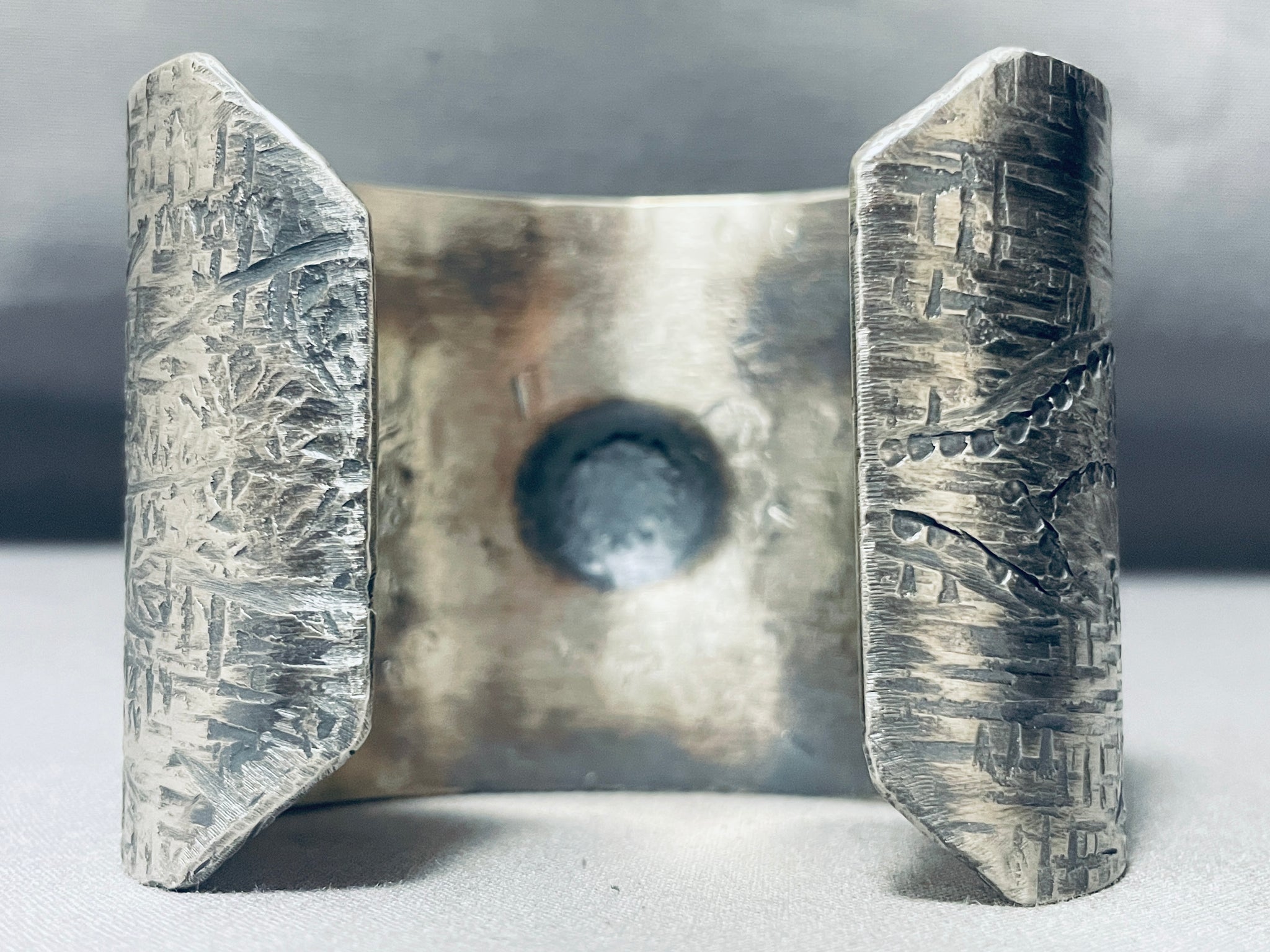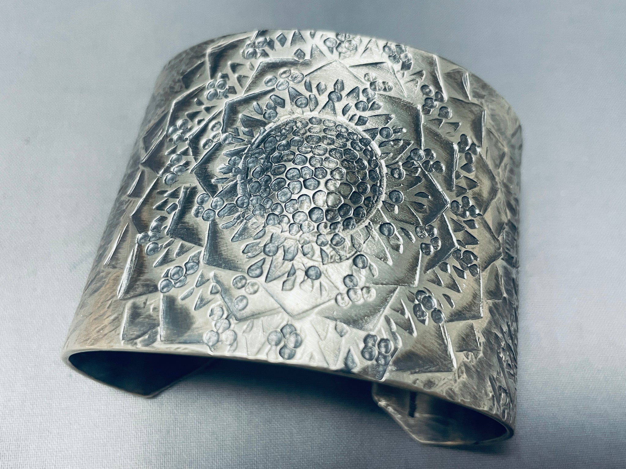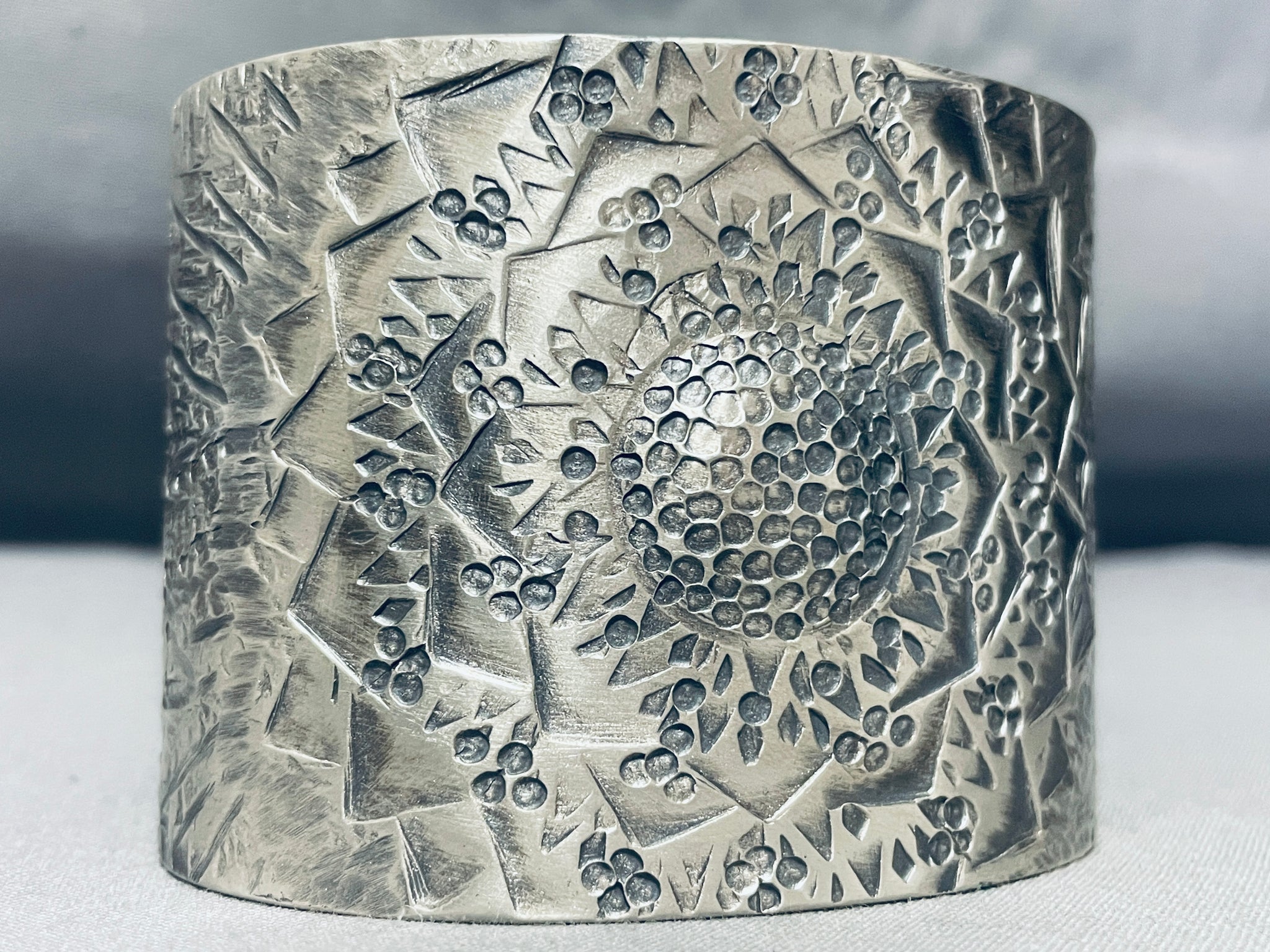Native American One Of The Most Detailed Hand Hammered Sterling Silver Wide Bracelet Cuff