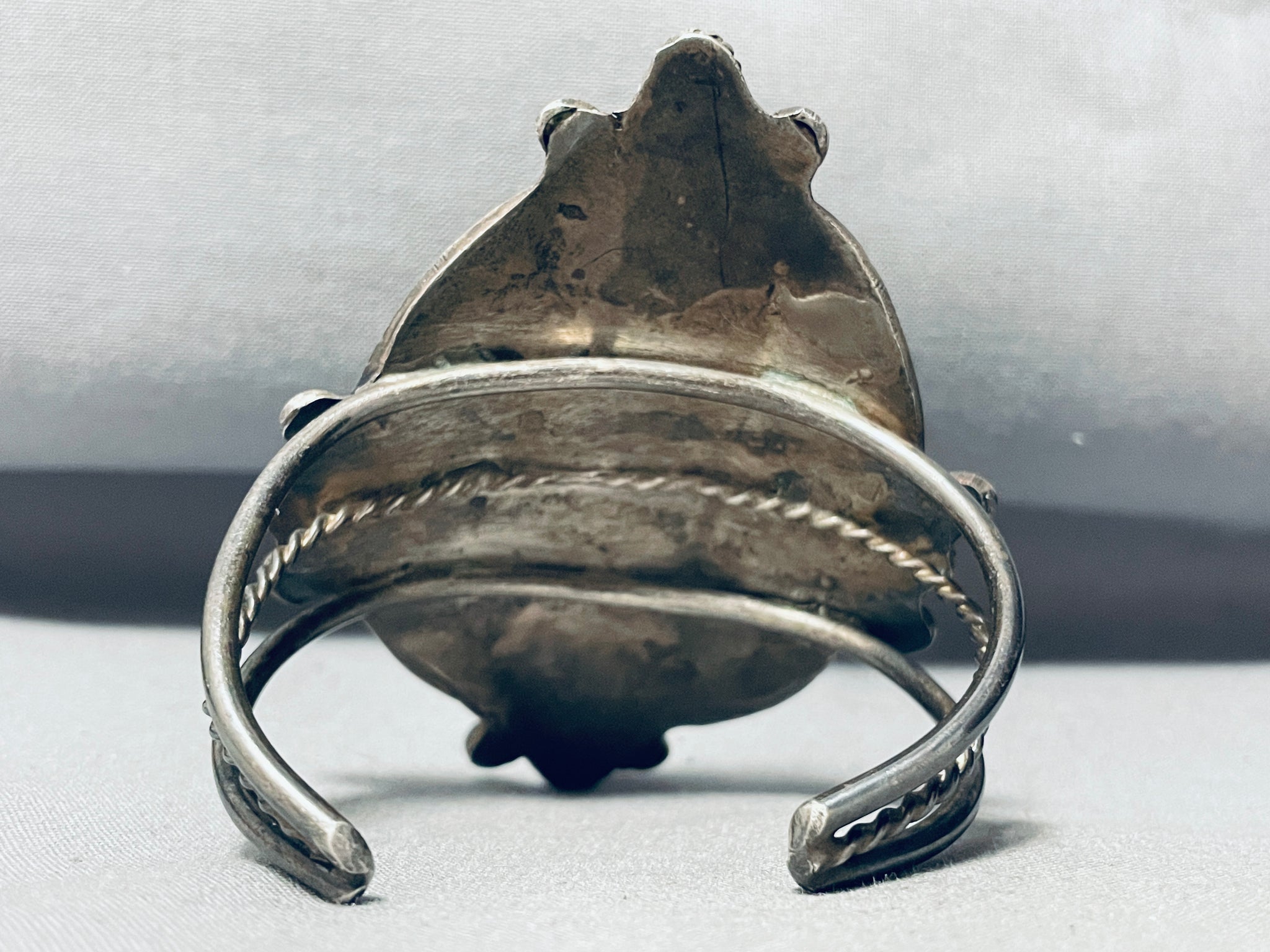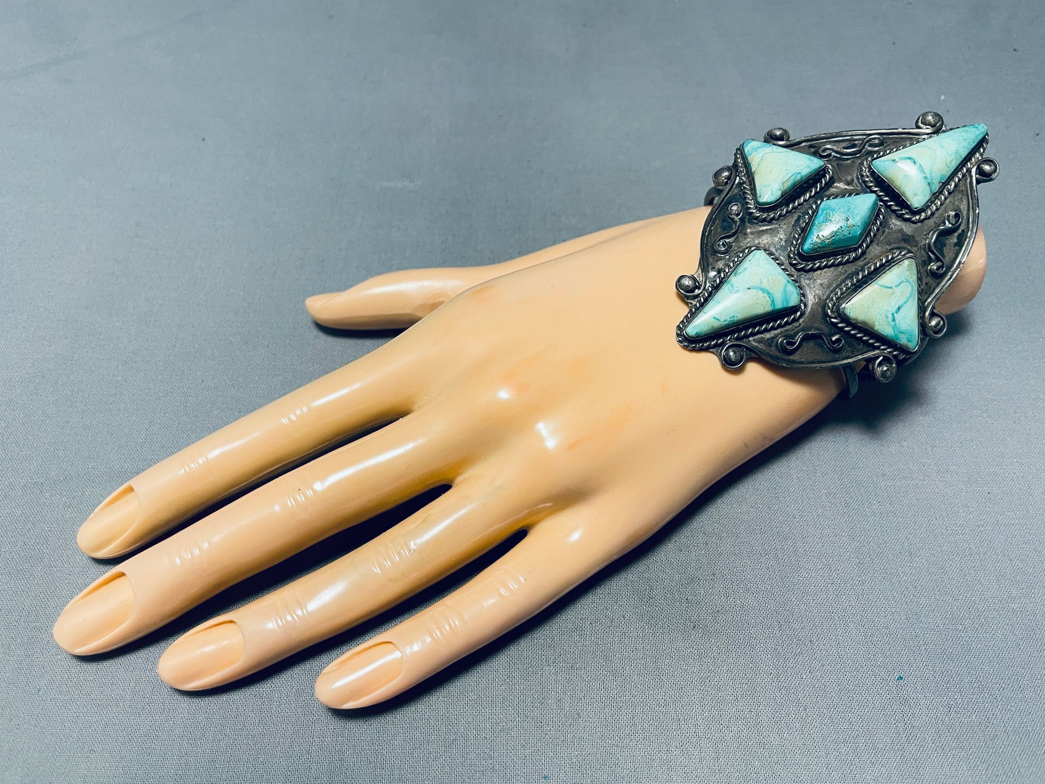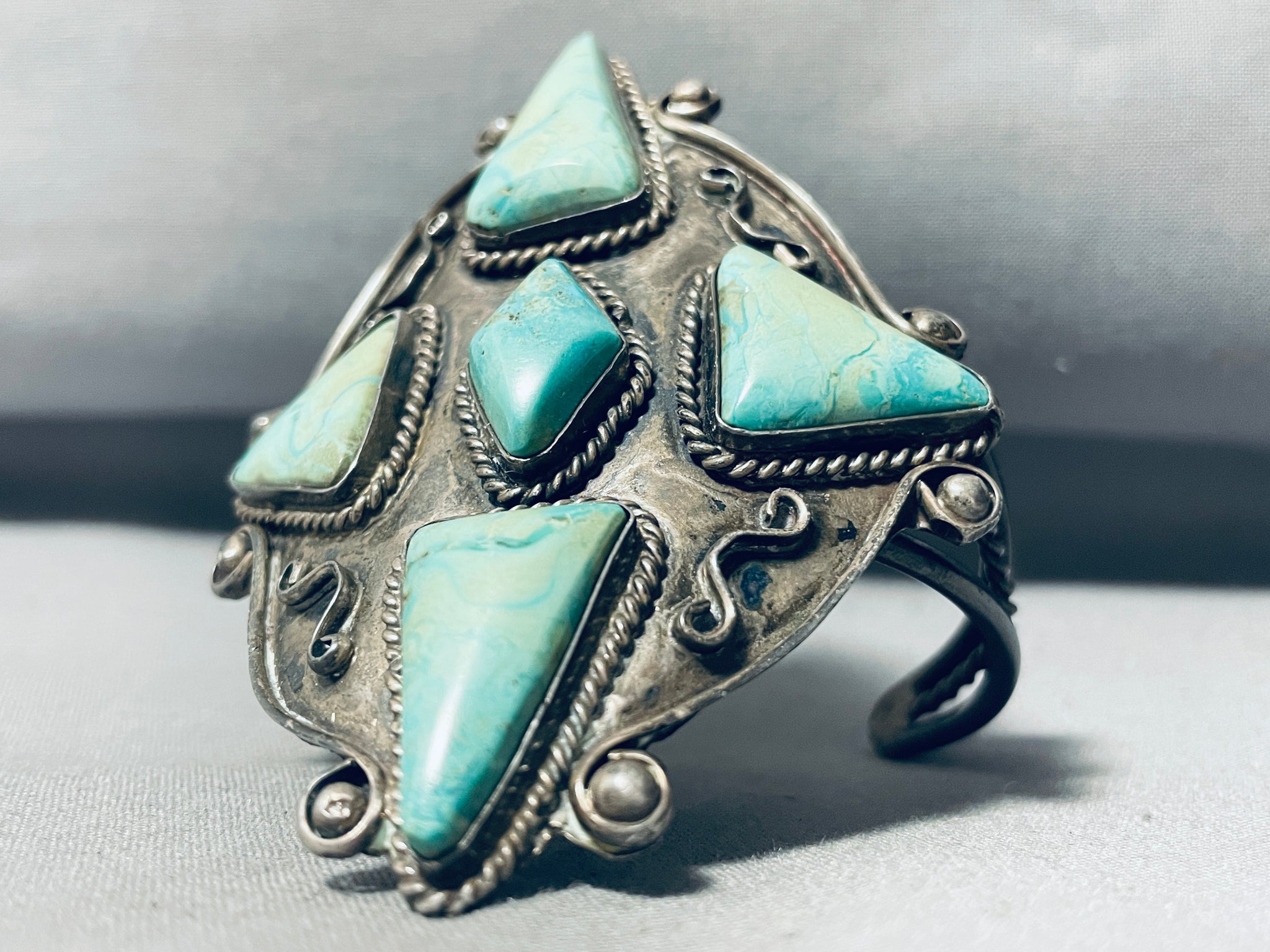 This is a tremendous vintage Navajo large five stone silver bracelet having beautiful old natural patina. This remarkable bracelet contains four large chunky teepee shaped turquoise stones and stunning center diamond shaped turquoise stone. The stones are a phenomenal green to blue color and contains outstanding surrounding silver ropes. Located throughout the stones are amazing silver swirling stems and raindrops. This bracelet contains an incredible triple silver shank cuff with the center shank being coiled. I love the old natural patina on this bracelet. The largest stone measures around 1" x 1/2". The width of the bracelet measures around 3-1/4". Sterling silver. Cir. Mid century . The inside end to end measures around 5-1/4" with an additional 1" gap. Sturdy 52 grams.
