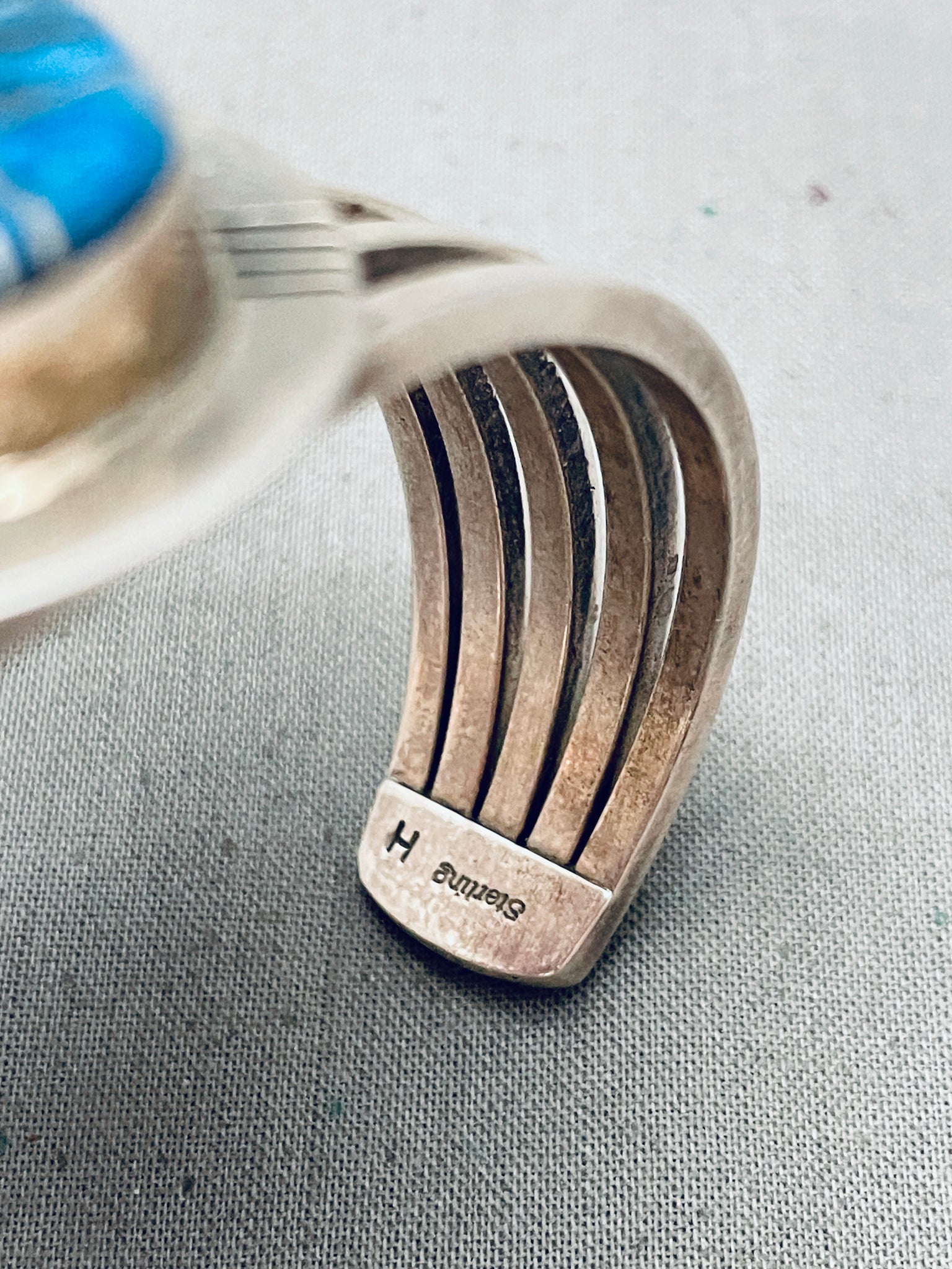 This is an astonishing Navajo inlaid silver bracelet. This fascinating bracelet contains a center inlaid section that consists of beautiful unique shapes of lapis stones. Surrounding the stones are marverlous silver channel segments. The center inlaid section measures around 1-1/4" X 7/8". This bracelet contains a very thick and sturdy square shaped five silver shank cuff that graduates in width towards the center. The height at the center of the bracelet measures around 1-1/2" while the width at the center of the five silver shank cuff measures around 1-1/4". Signed by Navajo artist, Herm Smith . Sterling silver, marked. Cir. 1970's+. The inside end to end measures around 5-1/2" with an additional 1-1/2" gap. Sturdy 68 grams.