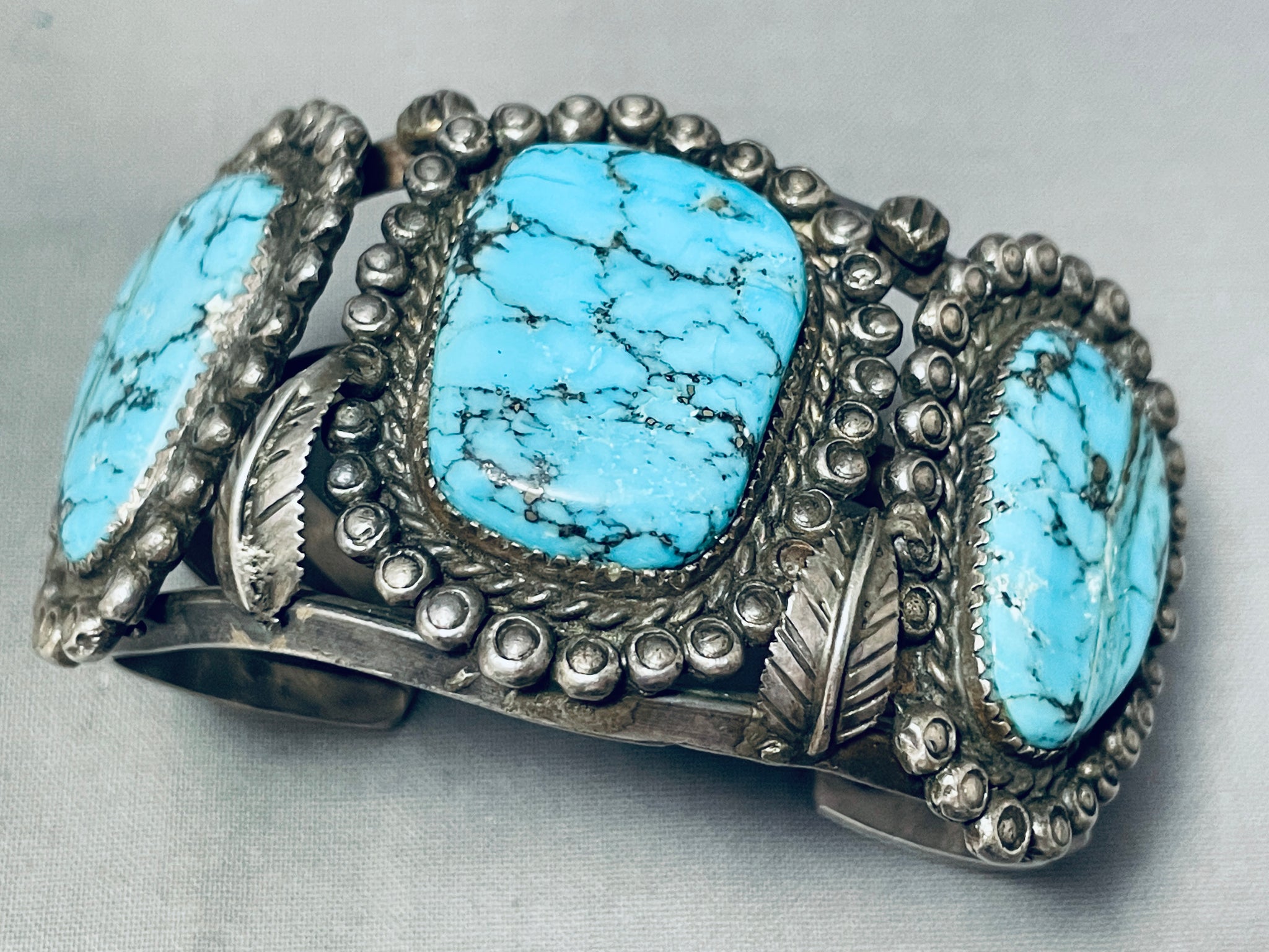 This is an incredible vintage Navajo large three stone silver bracelet. This fascinating bracelet contains three large chunky spiderweb matrix sky blue turquoise stones. Surrounding the beautiful stones are amazing silver works that consist of shells, ropes, and two accenting detailed silver leaves. The impressive detailing is just astonishing. This bracelet contains a remarkable sturdy and thick triple silver shank cuff. The center stone measures around 1" x 3/4". The width of the bracelet measures around 1-1/2". Sterling silver. Cir. Mid century . The inside end to end measures around 5-1/4" with an additional 1" gap. Sturdy 72 grams.