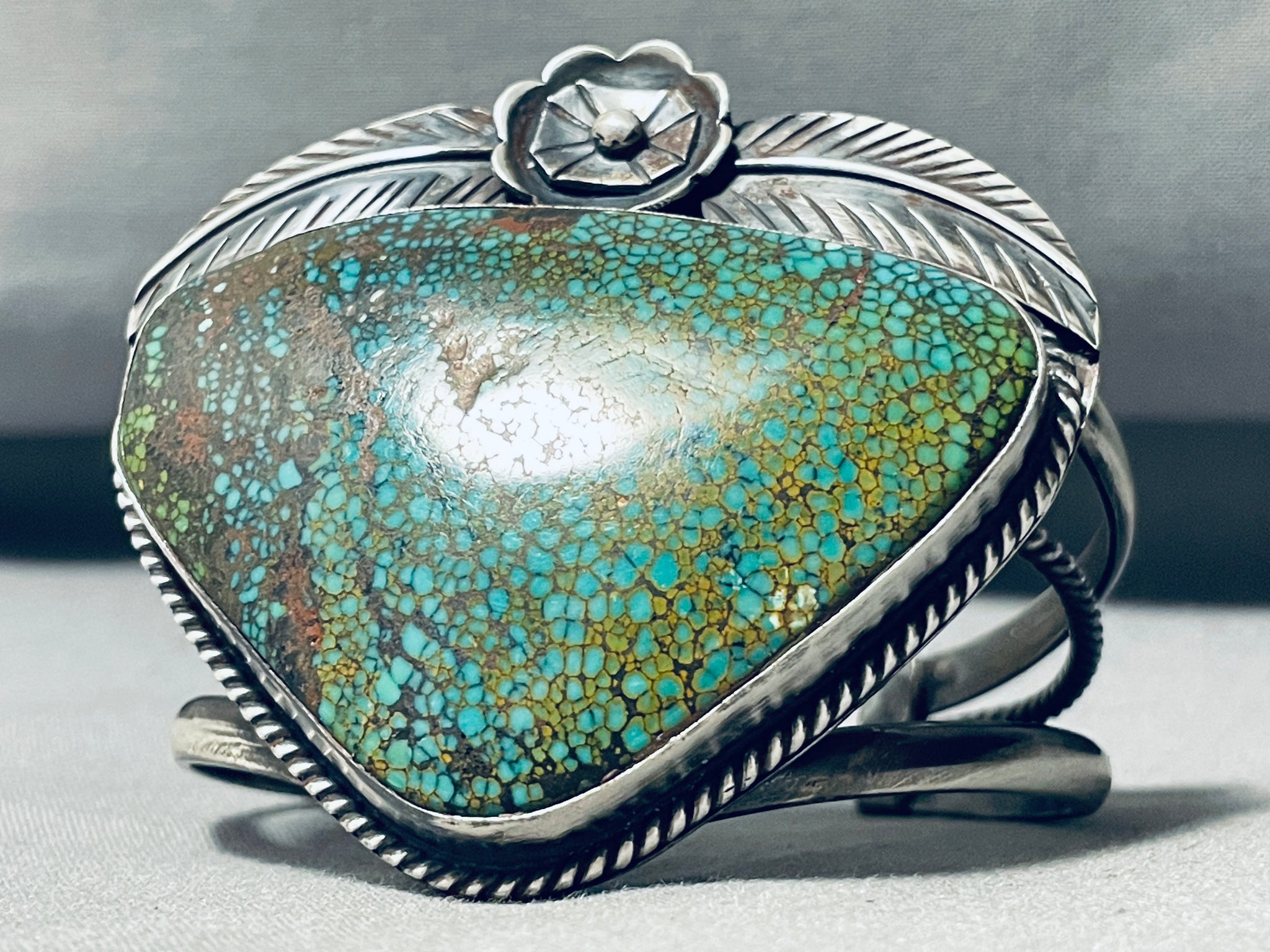 This is a tremendous vintage Navajo huge single turquoise stone silver bracelet. This remarkable bracelet contains one of the largest triangular shaped turquoise stones we have collected this year. The stone contains an incredible very tight and intricate spiderweb matrix. Situated at the top of the bracelet are wonderful large hand carved silver leaves with a center accenting hand carved silver flower. Surrounding the stone is a marvelous silver rope. This bracelet contains a remarkable old natural patina triple silver shank cuff with the center shank being coiled. The center stone measures around 1-5/8" x 2-1/4". The width of the bracelet measures around 2-1/2". Sterling silver, marked. Cir. Mid century . The inside end to end measures around 5-3/4" with an additional 3/4" gap. Sturdy 101 grams.