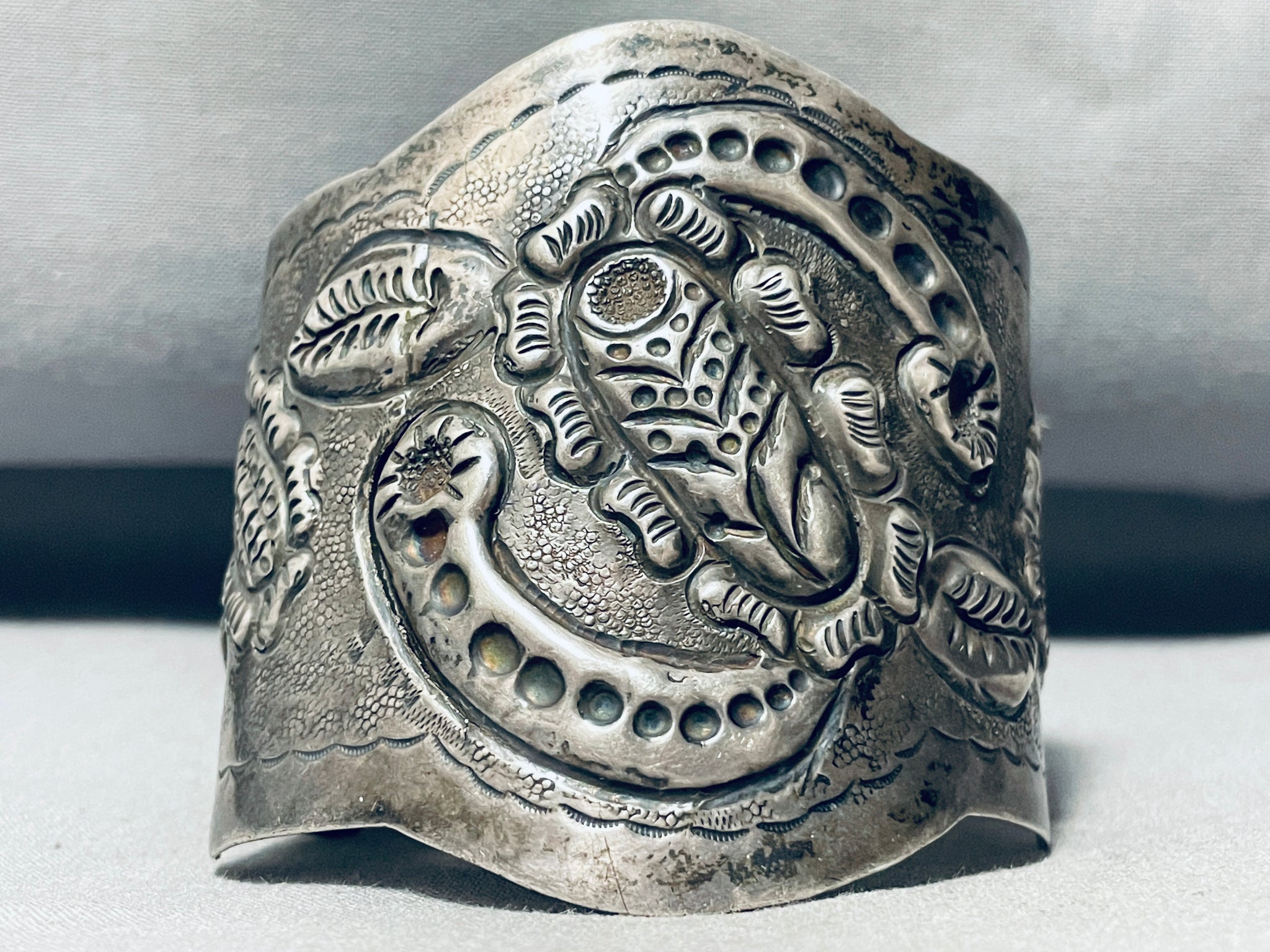 This is a superior vintage large all silver cuff bracelet. This fascinating bracelet contains outstanding carving patterns that consist of corn husks, leaves, and wave patterns. Bordering the cuff are outstanding silver wave patterns with a beautiful background textured cuff. The old natural patina on this bracelet is just stunning. I absolutely love the detailing on this piece as well as the bordering wave works. The width of the bracelet measures around 2-1/2". Sterling silver. Cir. Mid century . The inside end to end measures around 6-1/4" with an additional 1" gap. Sturdy 50 grams.