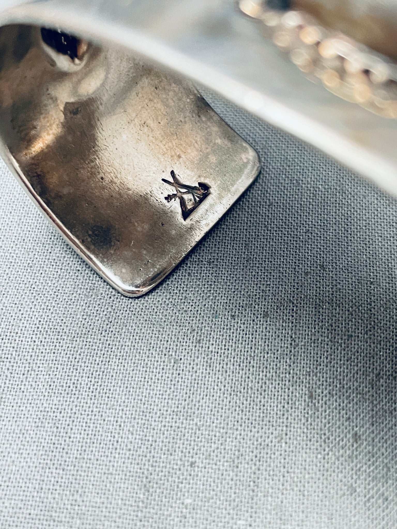 This is a marvelous Navajo all silver cuff bracelet. This fascinating bracelet contains a stunning all silver cuff that consists of repoussed shells. Bordering the repoussed shells are striking silver sun stamp patterns. Such a remarkable bracelet with a simplistic but yet detailed look. The width of the bracelet measures around 1". Signed by Navajo artist, AP. Sterling silver. Cir. 1970's+. The inside end to end measures around 5-1/2" with an additional 1-1/4" gap. Sturdy 48 grams.
