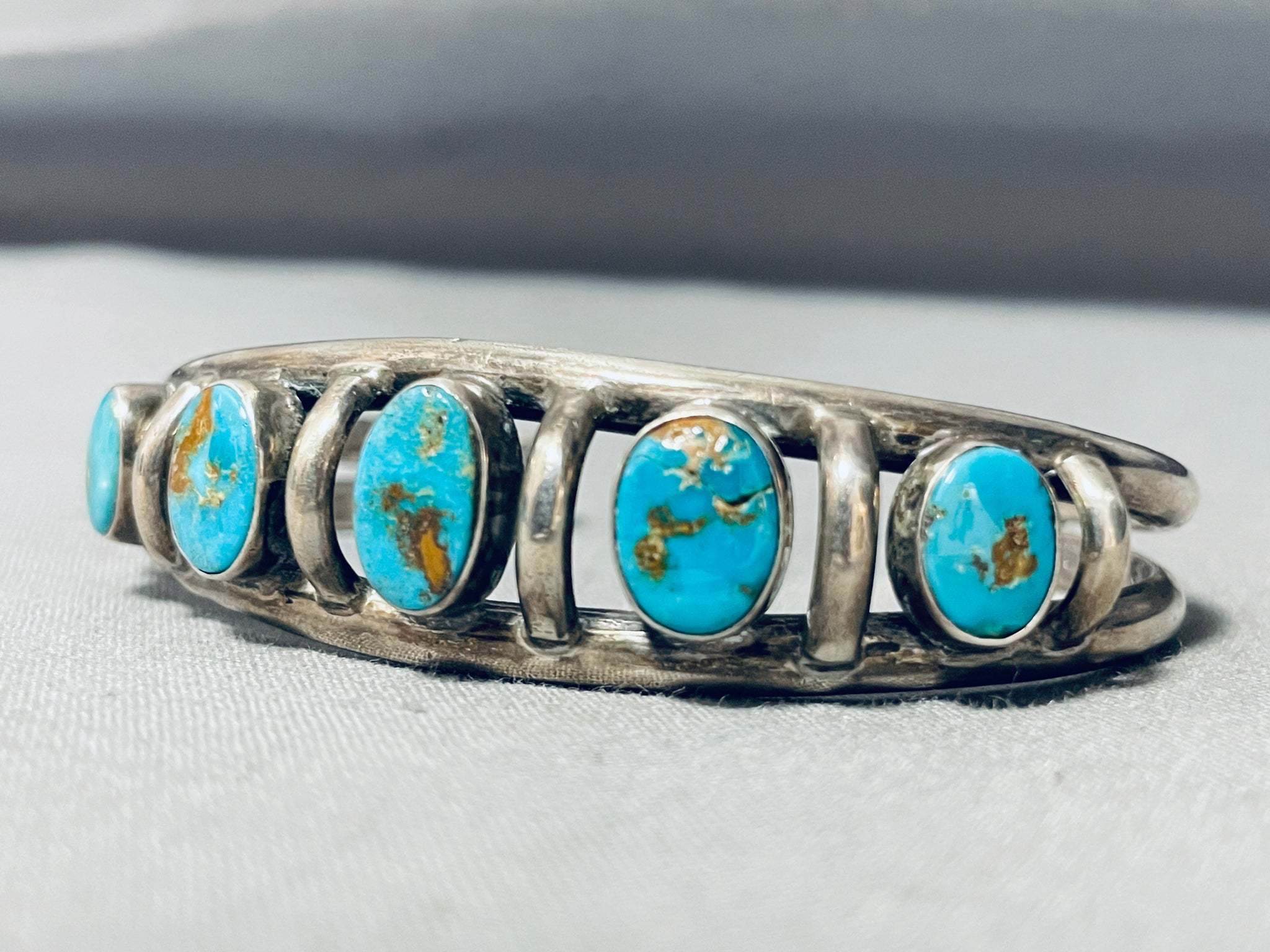 This is an exquisite vintage Navajo turquoise row silver bracelet. This incredible bracelet contains five outstanding Pilot Mountain turquoise stones. Seperating the stones are beautiful handmade silver bridges that are absolutely incredible and graduate in size towards the center. This bracelet contains a phenomenal double silver shank cuff with end terminal caps. The center stone measures around 1/2" x 1/4". The width of the bracelet measures around 3/4". Sterling silver. Cir. Mid century . The inside end to end measures around 5-1/2" with an additional 1-1/4" gap. Sturdy 29 grams.