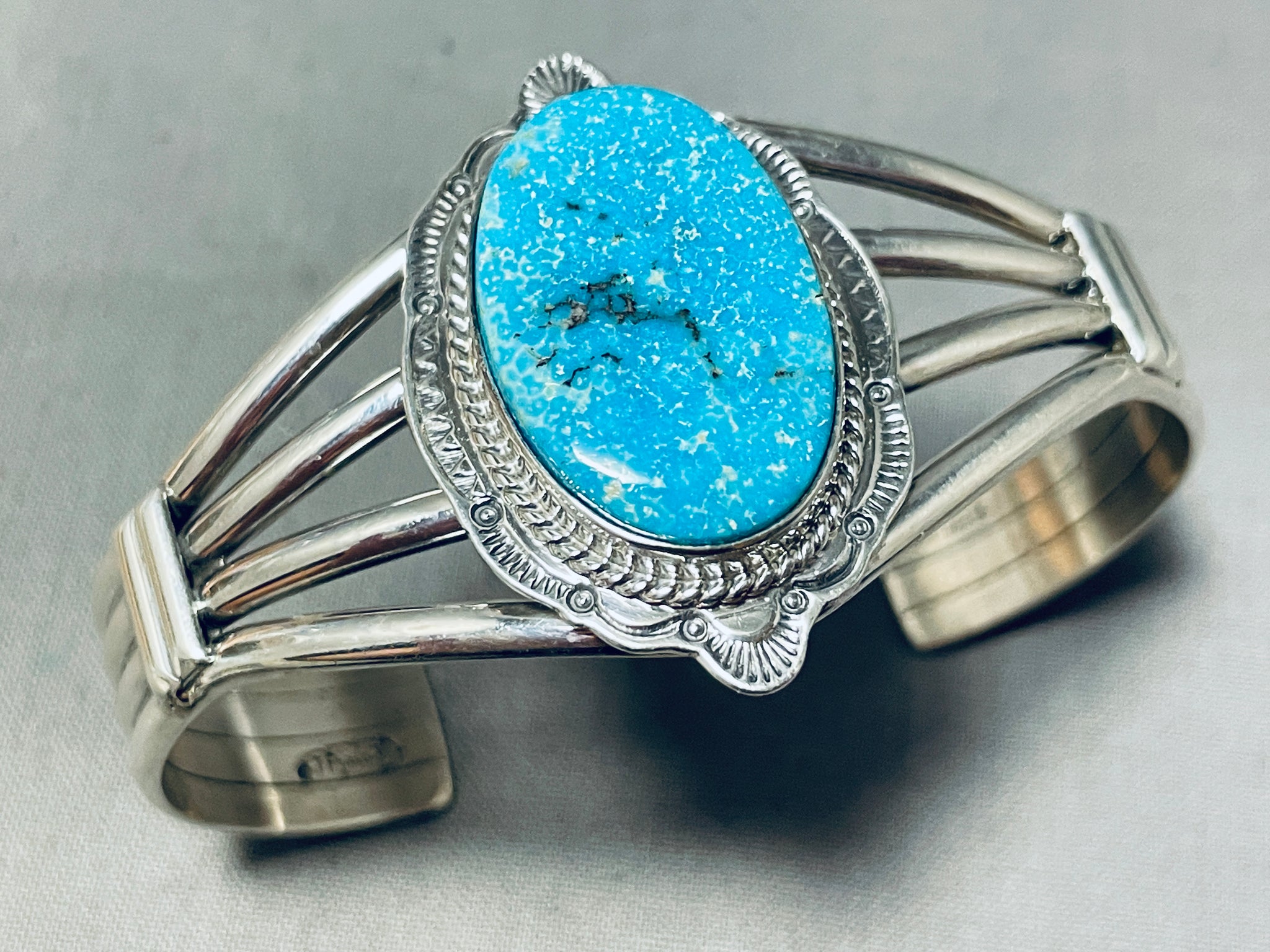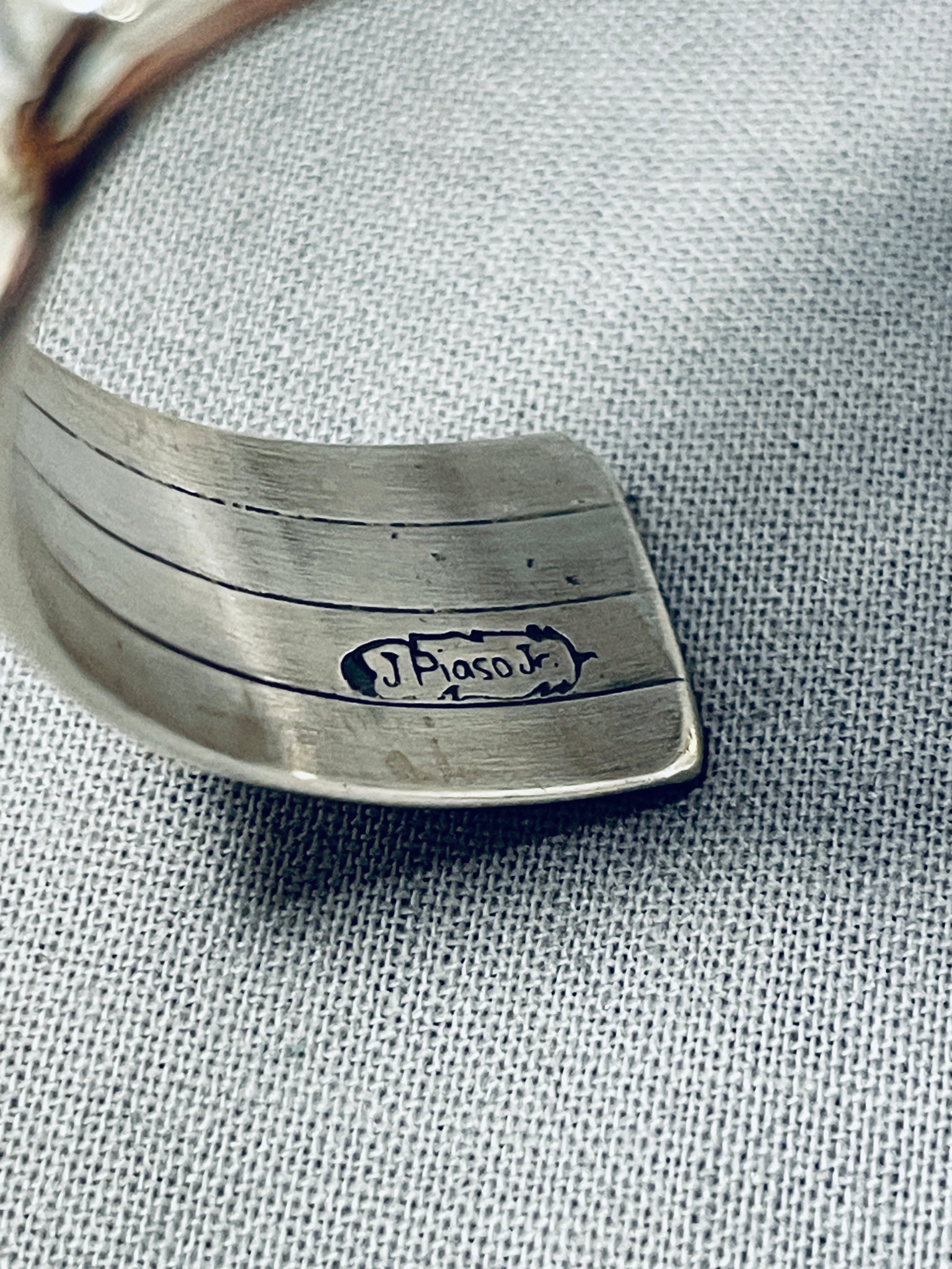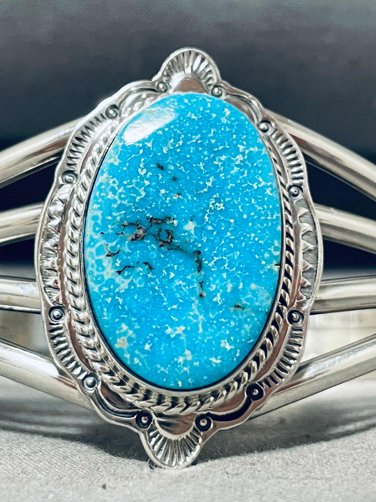 The Kingman turquoise mine, situated in northwestern Arizona, holds a prominent position in the world of turquoise mining. Renowned for its stunning sky-blue hues with intricate webbed matrix patterns, Kingman turquoise is highly sought after by jewelry makers and collectors alike. This mine has a history dating back over a thousand years, with Native American tribes in the region valuing its vibrant stones for both their aesthetic appeal and spiritual significance. The mine's output of high-quality turquoise, ranging from pale blue to vivid teal, has made it a staple in the jewelry industry. Today, the Kingman turquoise mine remains a cornerstone of American turquoise production, serving as a testament to the enduring allure and cultural importance of this captivating gemstone. The center stone measures around 1" x 5/8". The width of the bracelet measures around 1-1/2". Signed by Navajo artist, Jim Piaso Jr. Sterling silver, marked. The inside end to end measures around 5-5/8" with an additional 1-1/4" gap. Sturdy 39 grams.
