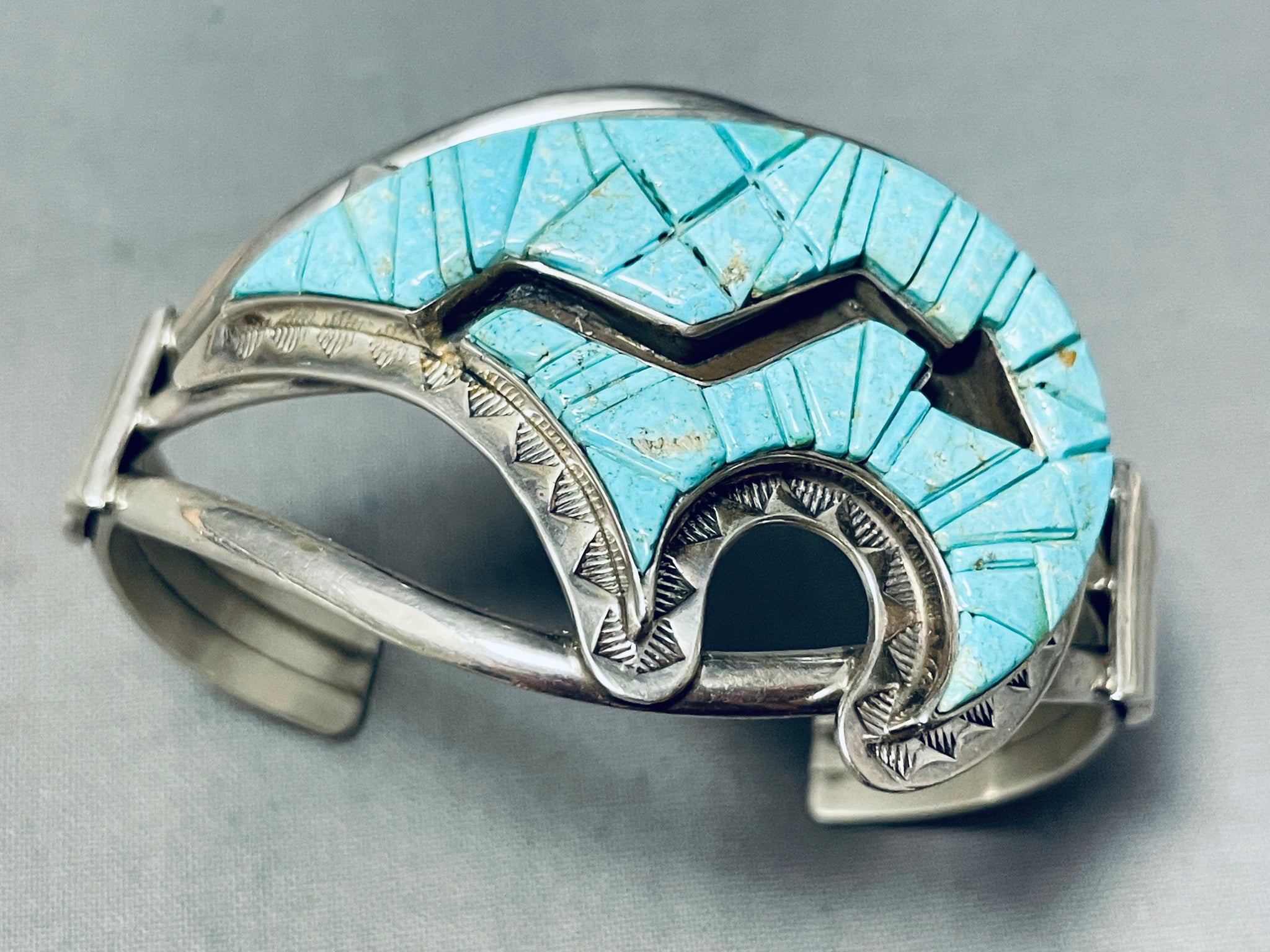 This is a striking vintage Navajo inlaid bear silver bracelet. This wonderful bracelet contains remarkable inlaid unique shaped hand cut turquoise stones. The bear measures around 2" X 1". Situated in the center of the turquoise bear is a stunning hand carved arrow pattern. Surrounding the turquoise bear are amazing silver teepee pattern. This bracelet contains a superior triple silver shank cuff that graduate in width towards the center. Resting at the sides are amazing triple tiered silver flanks. The width of the bracelet measures around 1-3/8". Signed by Navajo artist, DM. Sterling silver. Cir. 1970's+. The inside end to end measures around 5-1/4" with an additional 1-1/4" gap. Sturdy 36 grams.