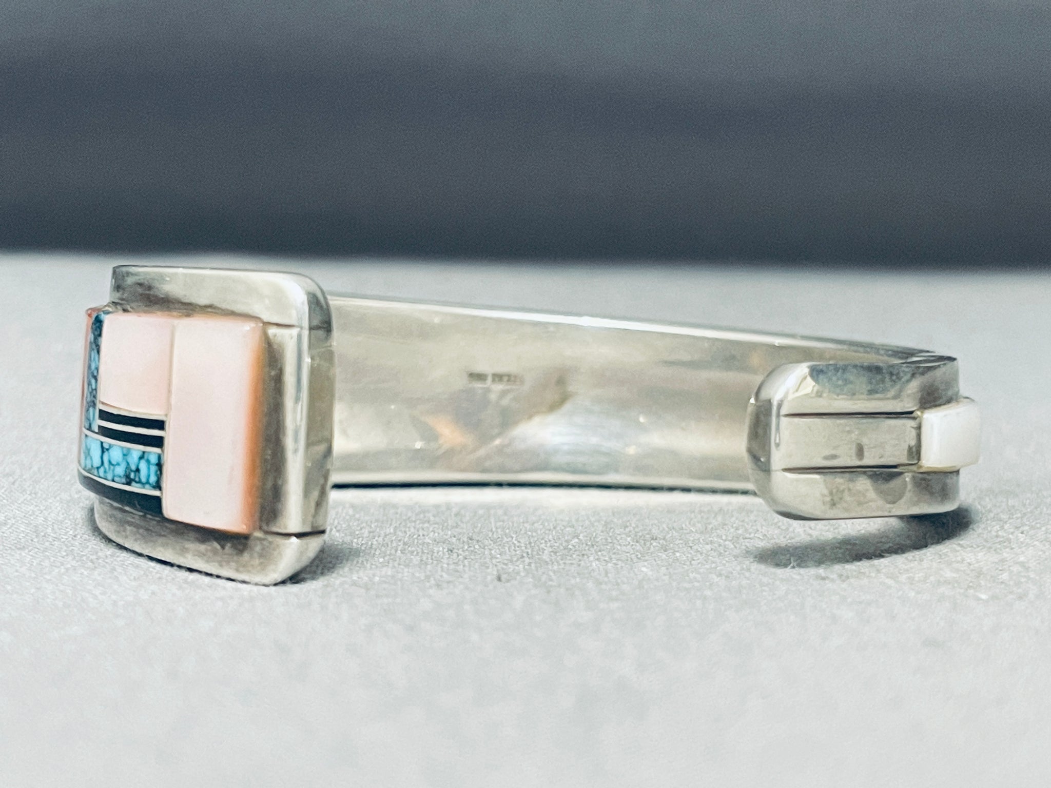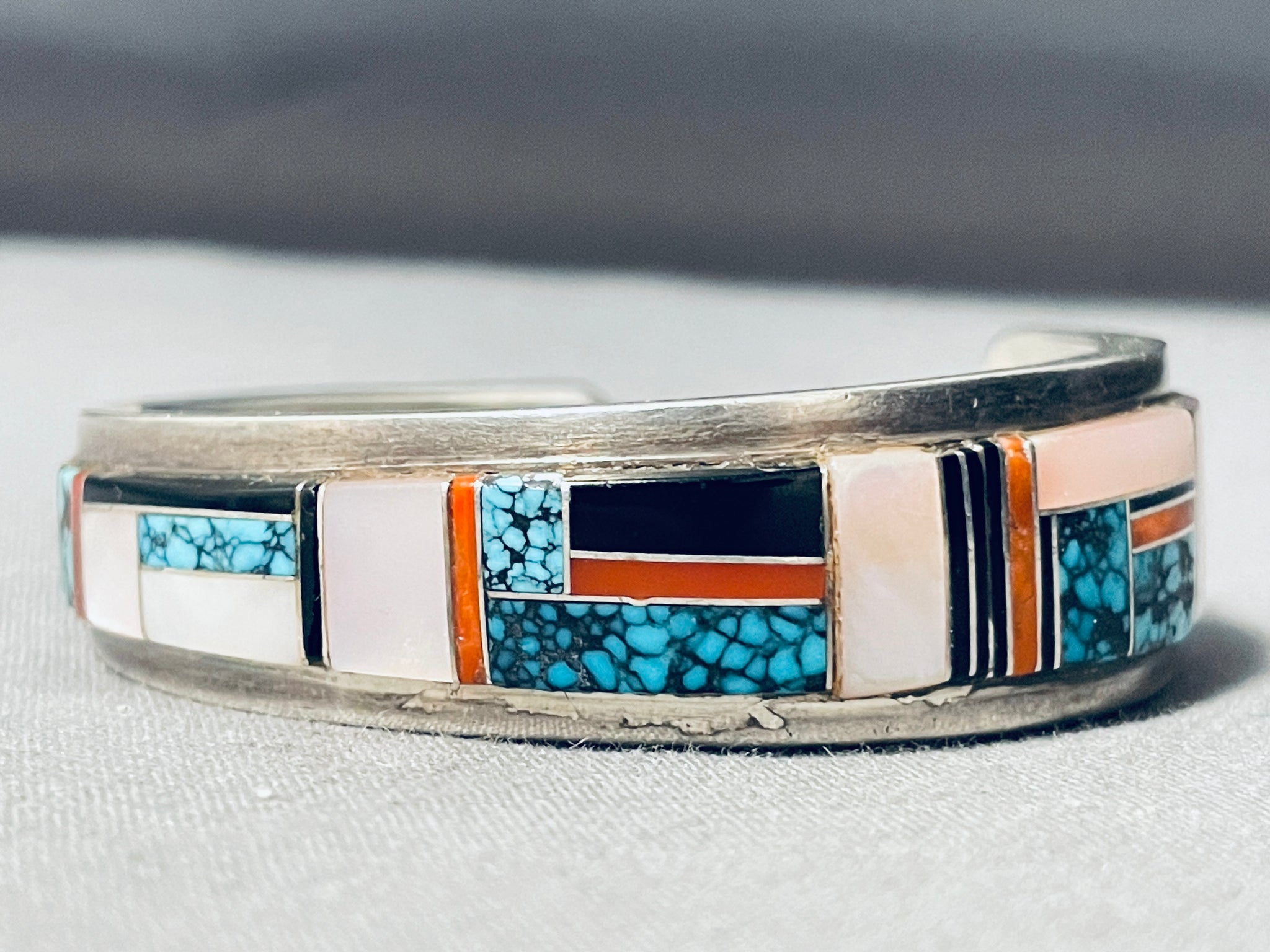 This is an exquisite vintage Navajo inlaid very thick silver cuff bracelet. This superior bracelet consistsof inlaid channeled stones and shells that wrap nearly around the entire cuff. I love how the cuff as well as the inlaid stones and shell patterns graduate in size from one end to the other. The inlaid stones and shells consist of mother of pearl, onyx, coral, and Lone Mountain turquoise. I love how the beautiful inlaid stones and shells lightly protrude out from the very thick silver cuff. The width of the bracelet measures around 1/2". Sterling silver, marked. Cir. Mid century . The inside end to end measures around 5" with an additional 1" gap. Sturdy 52 grams.