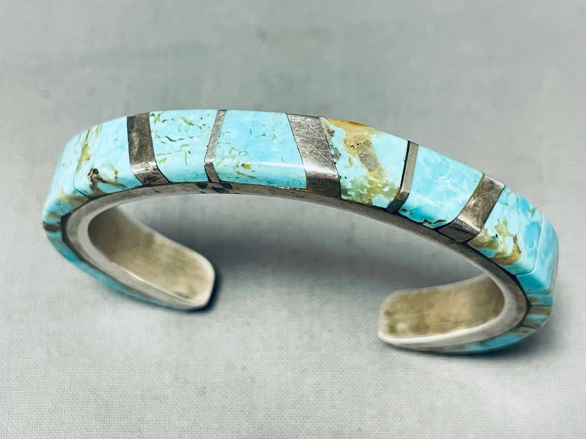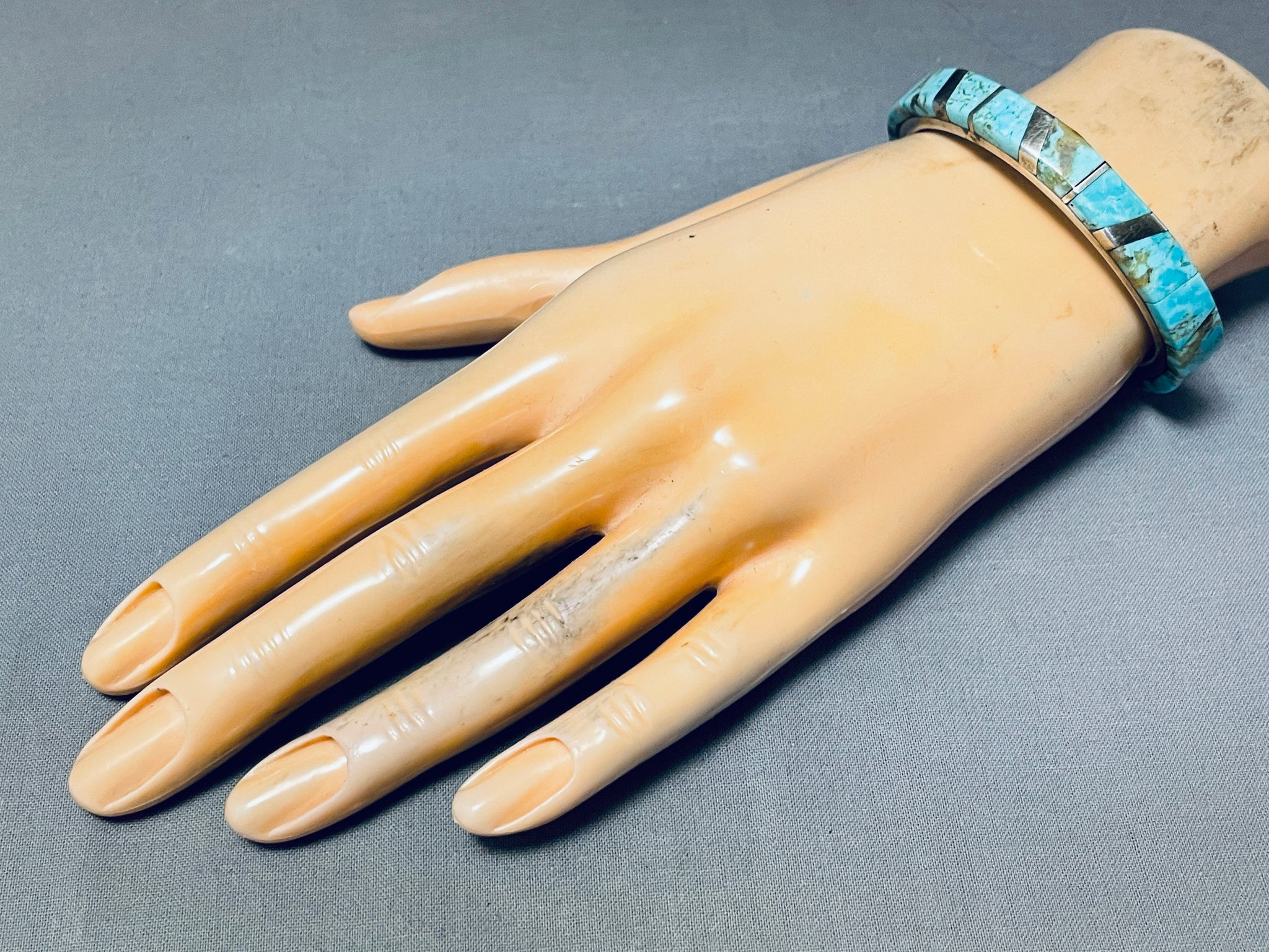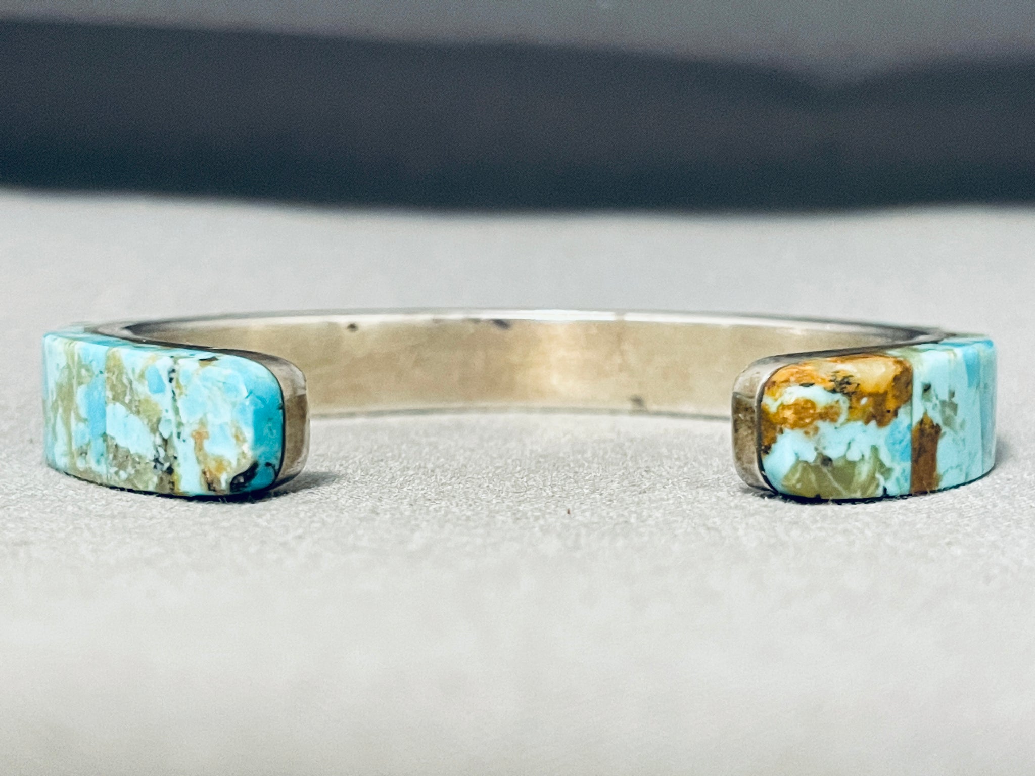 Thicker Vintage Native American Navajo #8 Turquoise Mine Sterling Silver Inlay Bracelet