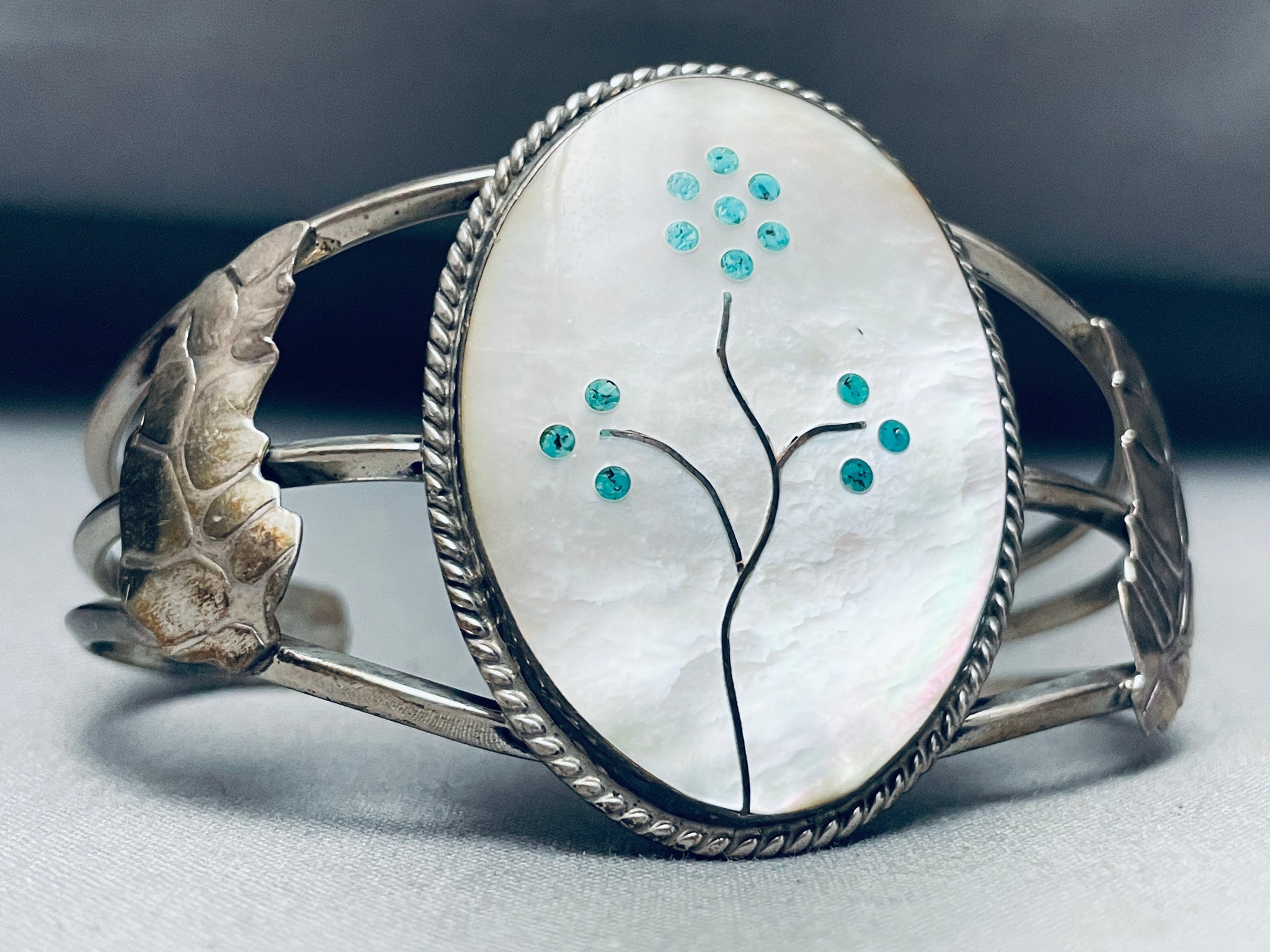 Turquoise Flower Vintage Native American Zuni Sterling Silver Inlay Bracelet Old