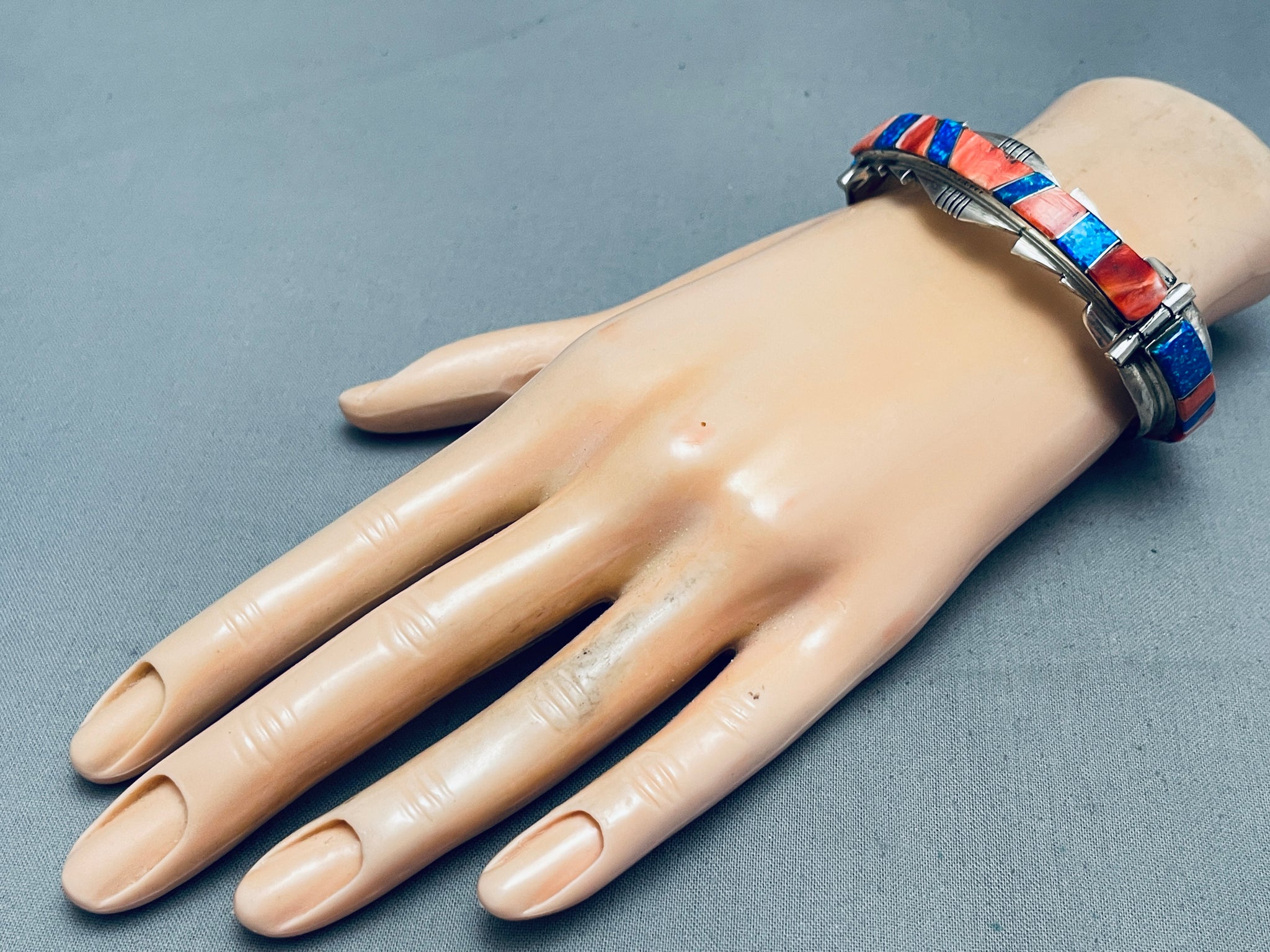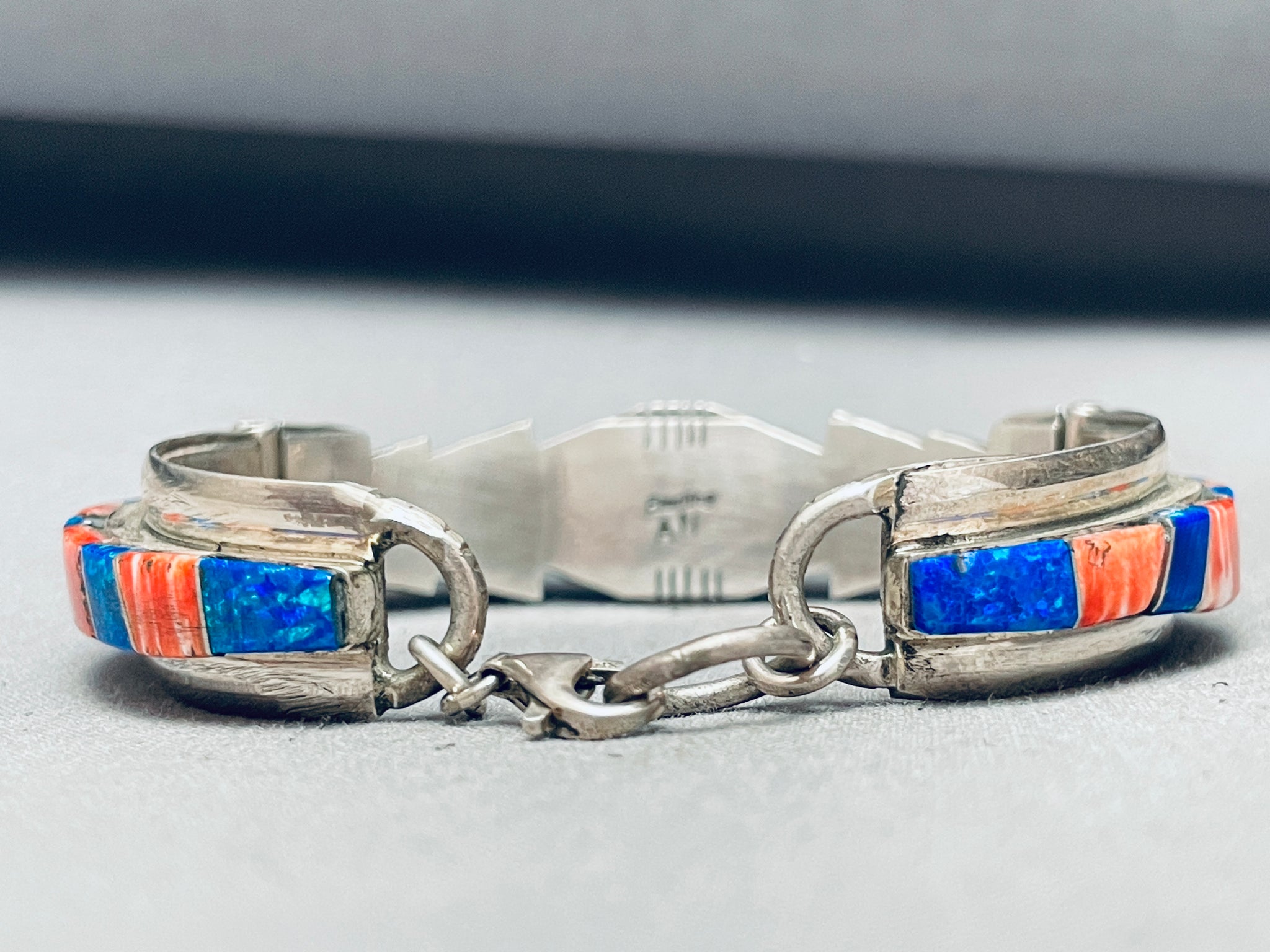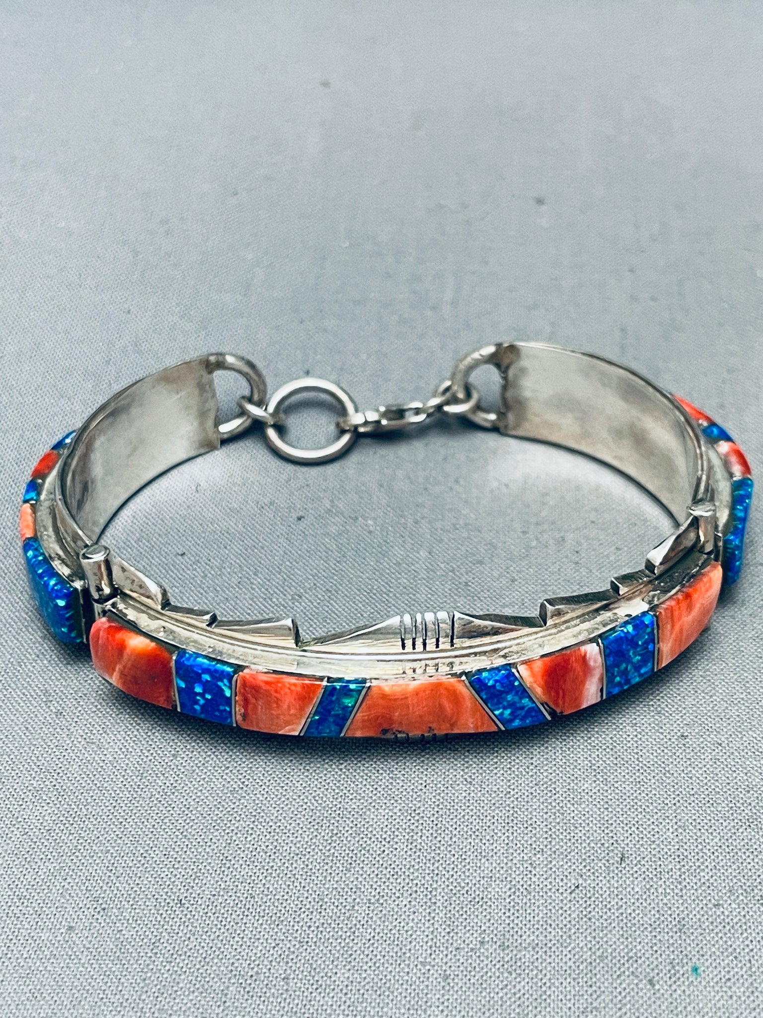 This is a marvelous vintage Navajo inlaid silver link bracelet. This phenomenal bracelet contains three fascinating inlaid sections that are thick and large. Each inlaid section consists of beauitful red spiny oyster shells and abalone. Bordering the edges of the bracelet are wonderful wave patterns with stunning channeled patterns. This bracelet can fit a wrist size of about 7-1/4". I absolutely love this bracelet. The width of the bracelet measures around 5/8". Signed by Navajo artist, AN. Sterling silver, marked. Cir. 1970's+. Sturdy 35 grams.