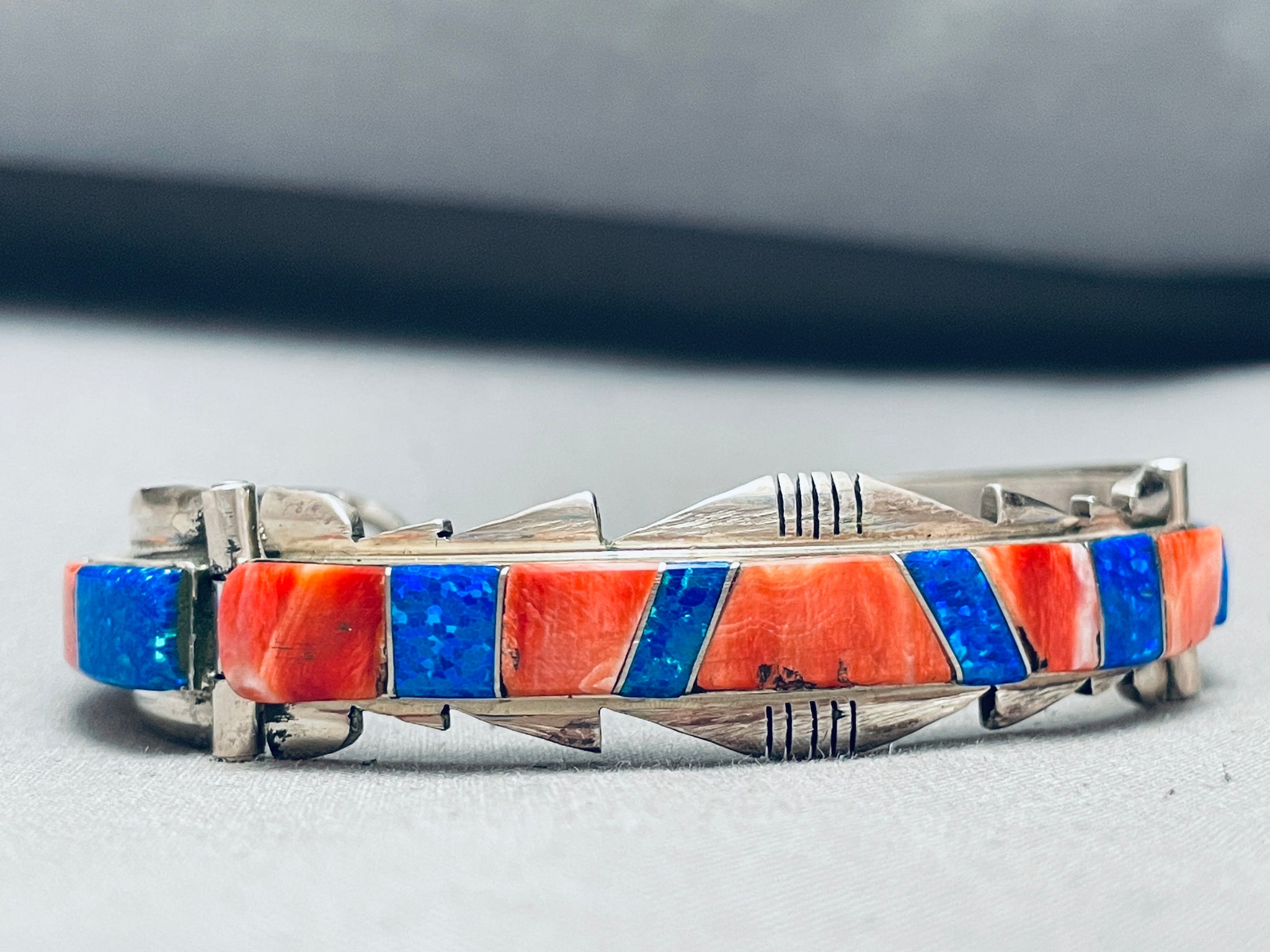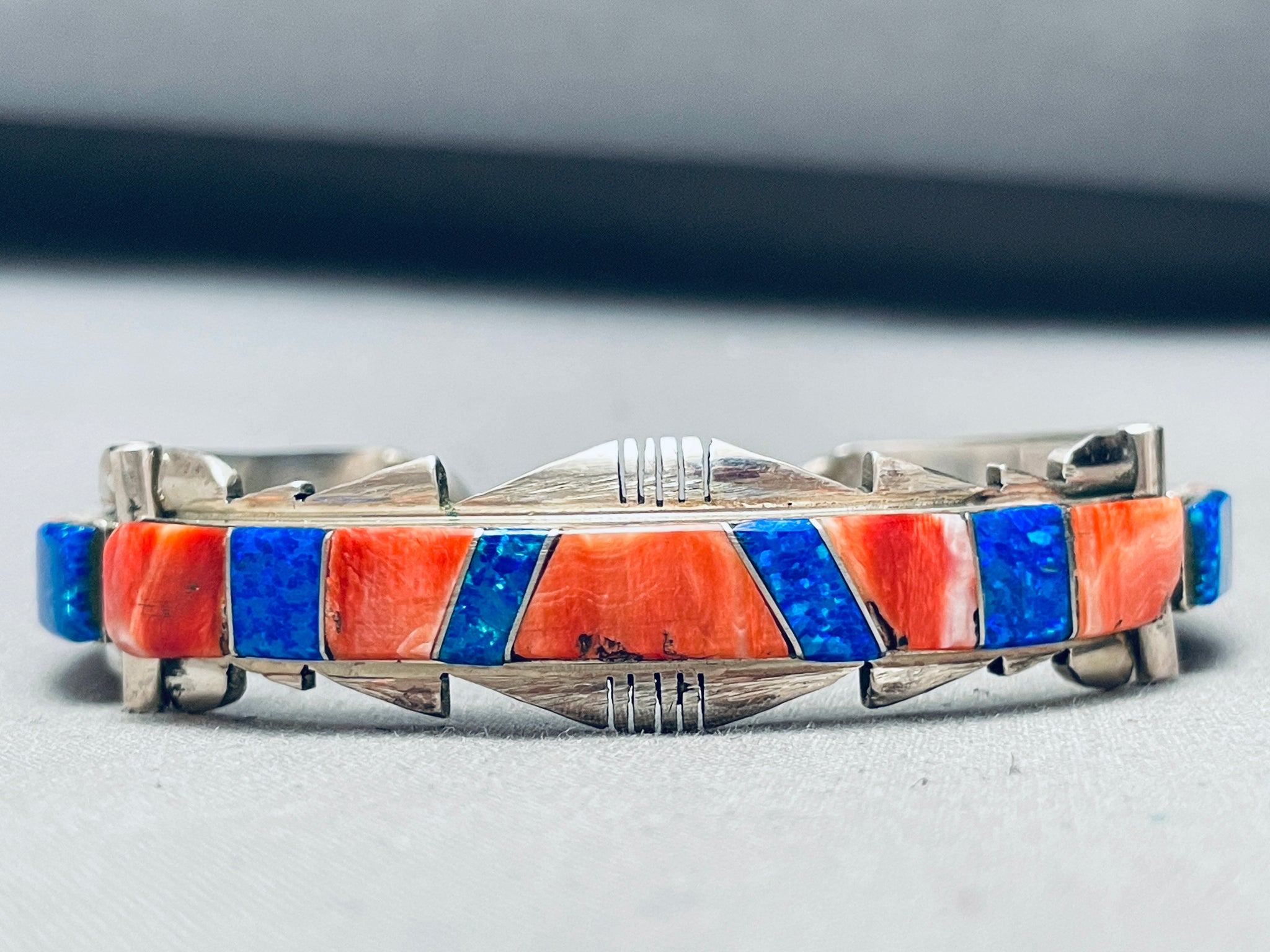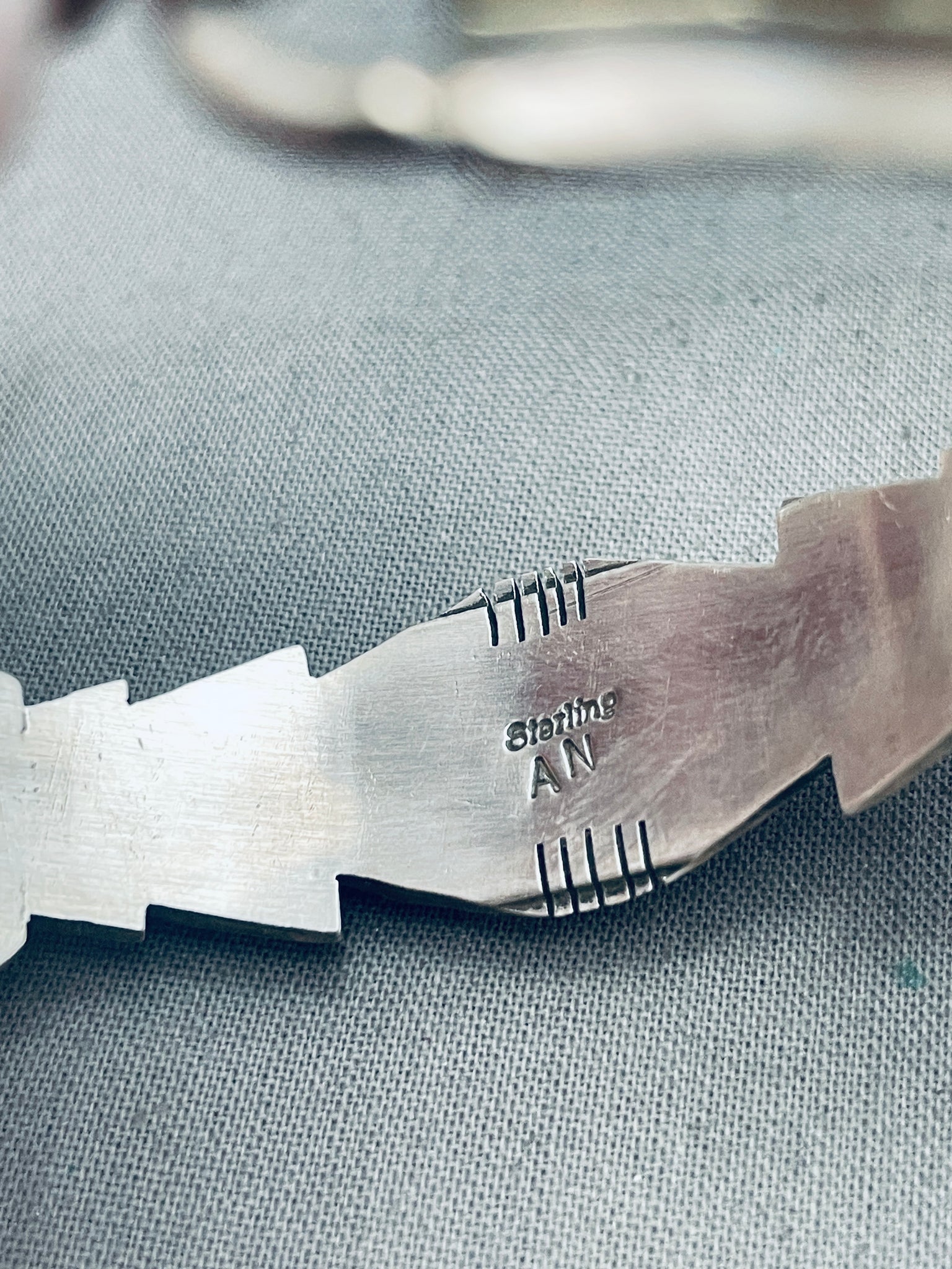 This is a marvelous vintage Navajo inlaid silver link bracelet. This phenomenal bracelet contains three fascinating inlaid sections that are thick and large. Each inlaid section consists of beauitful red spiny oyster shells and abalone. Bordering the edges of the bracelet are wonderful wave patterns with stunning channeled patterns. This bracelet can fit a wrist size of about 7-1/4". I absolutely love this bracelet. The width of the bracelet measures around 5/8". Signed by Navajo artist, AN. Sterling silver, marked. Cir. 1970's+. Sturdy 35 grams.
