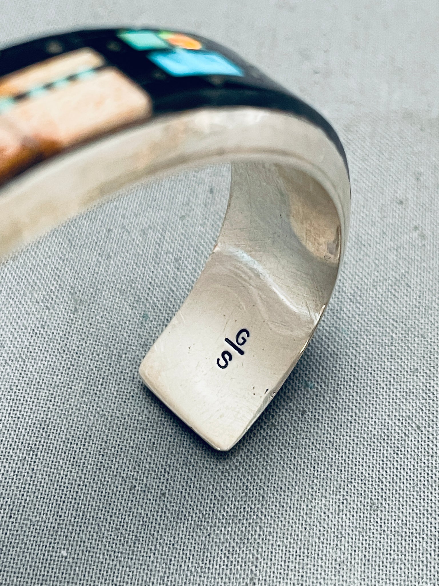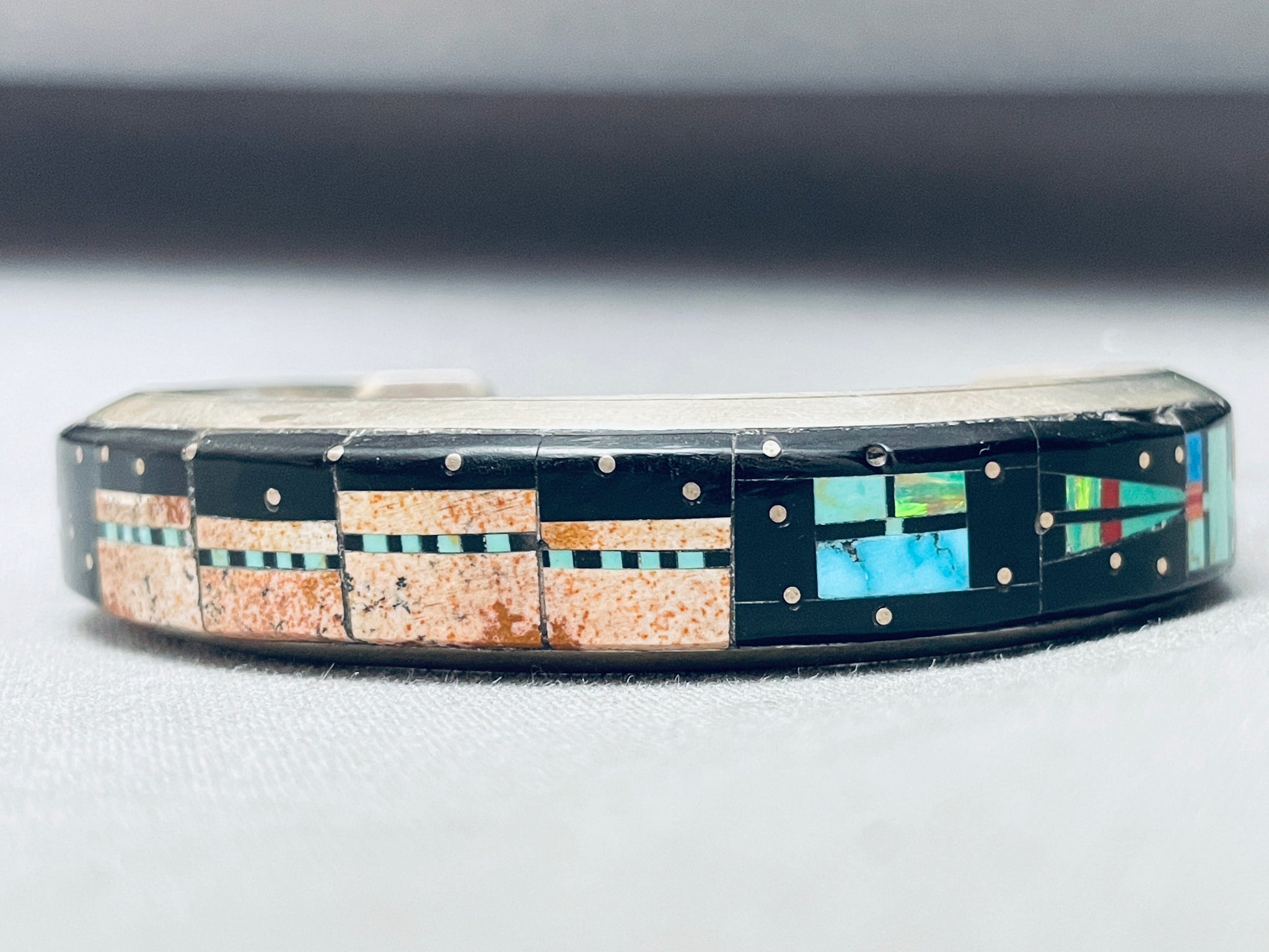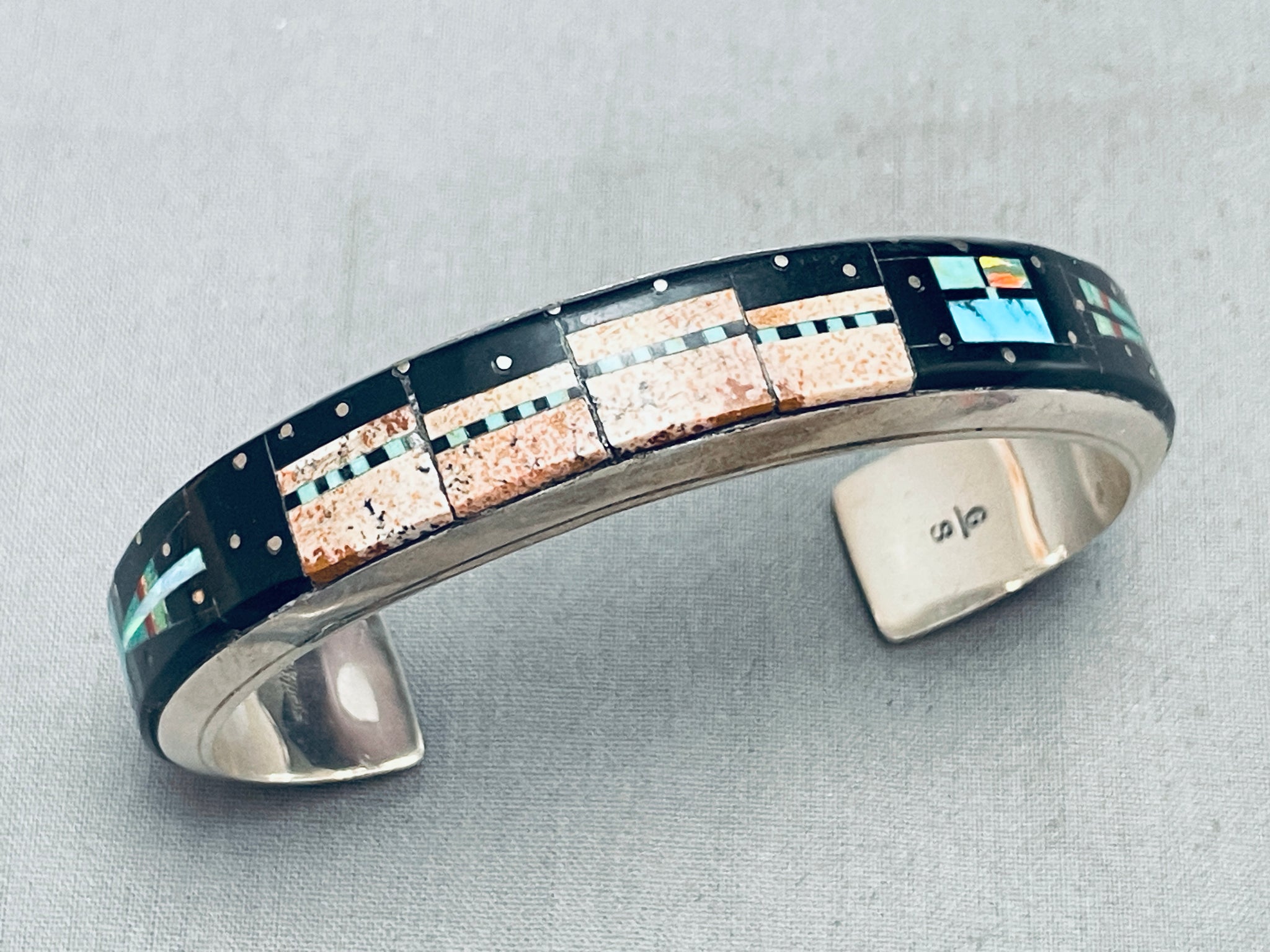 Very Rare 7 Inch Wrist Native American Navajo Turquoise Inlay Pueblo Sterling Silver Bracelet