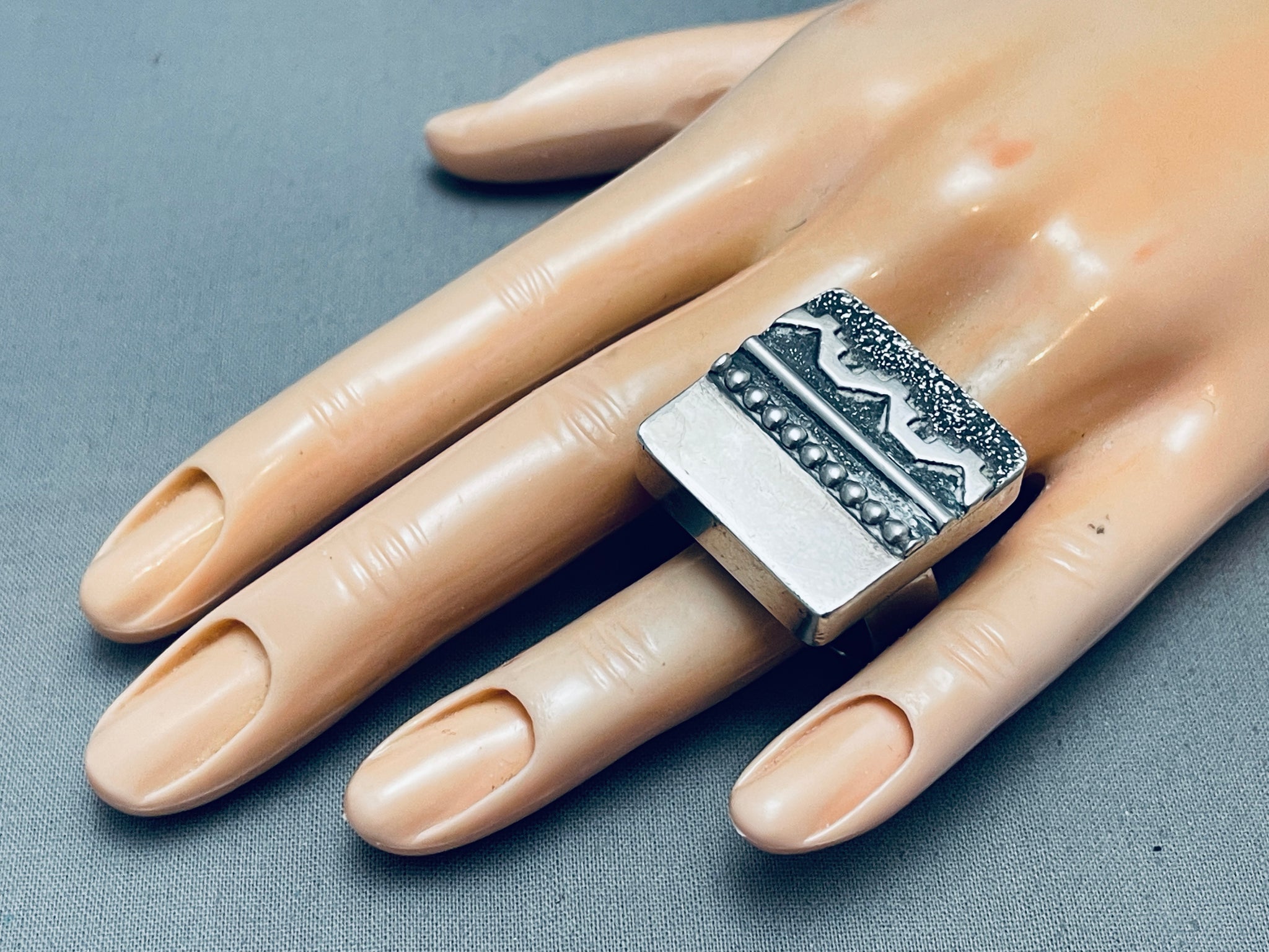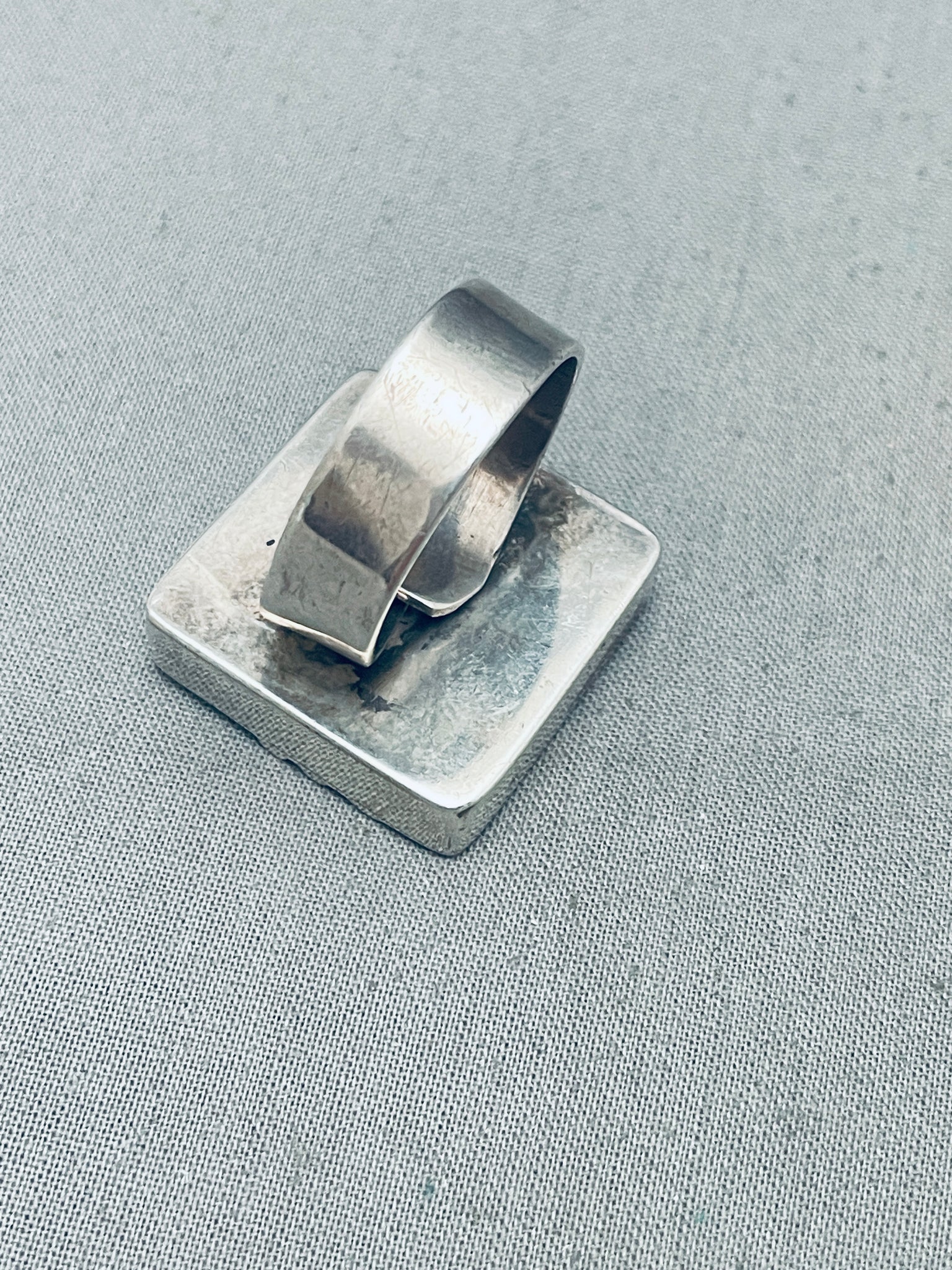 Thomas Singer was a legendary Navajo jewelry artist renowned for his innovative designs and profound influence on Native American jewelry. Born in 1940 in Winslow, Arizona, Singer pioneered the use of silver overlay techniques, often incorporating traditional Navajo symbols and storytelling into his work. He became especially well-known for his use of "chip inlay," a method that involved setting crushed turquoise, coral, and other stones into intricate silver designs. His jewelry often featured symbolic motifs such as arrows, feathers, and sunfaces, reflecting Navajo spiritual beliefs and cultural identity. Throughout his career, Thomas Singer's work remained rooted in tradition while also evolving with contemporary styles, earning him recognition and respect across the art world. Even after his passing in 2014, his legacy continues through the work of his family, especially his wife Rose Singer, who carries on his artistic vision and craftsmanship. The ring face measures around 1" x 1". Signed by Navajo artist, Thomas Singer. The ring size is around 10. Sterling silver, marked. Sturdy 16 grams.