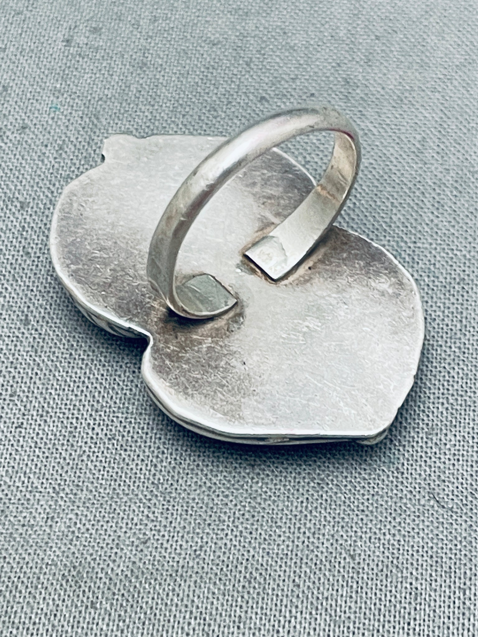 The Royston turquoise mine, located in Nevada, is one of the most famous and productive turquoise mines in the United States. Known for its vibrant, rich blue and green stones, Royston turquoise is highly prized for its striking color variations and distinctive golden or brown matrix, which gives each stone a unique appearance. The mine, which has been active for decades, produces high-quality turquoise that is prized by Native American jewelers, particularly Navajo, Zuni, and Hopi artists, who incorporate it into their handcrafted silver jewelry. Royston turquoise is known for its durability and consistent quality, making it a favorite choice for collectors and artisans. Today, the Royston turquoise mine remains one of the premier sources of American turquoise, contributing to the enduring legacy and cultural significance of turquoise in Native American jewelry. The stones measure around 3/8" x 1/4". The ring face measures around 1-3/8" x 1". The ring size is around 5. Sterling silver. Sturdy 8 grams. Cir Mid Century +