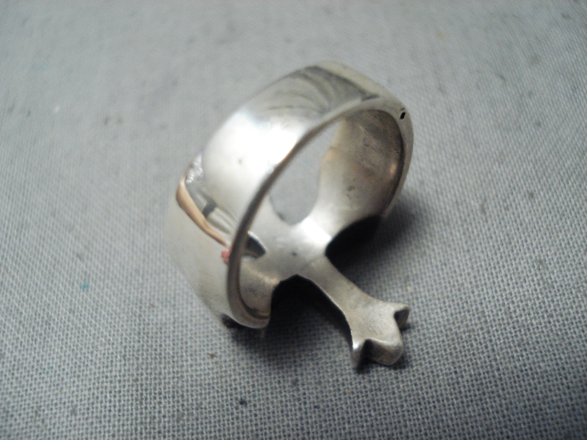 An incredible Navajo silver ring. This wonderful silver cross rests proudly upon the finger as the two sides of the cross morph into the band of the ring! The ring face measures around 3/4" x 3/4". The ring size is around 5. Sterling silver. Sturdy 10 grams.
