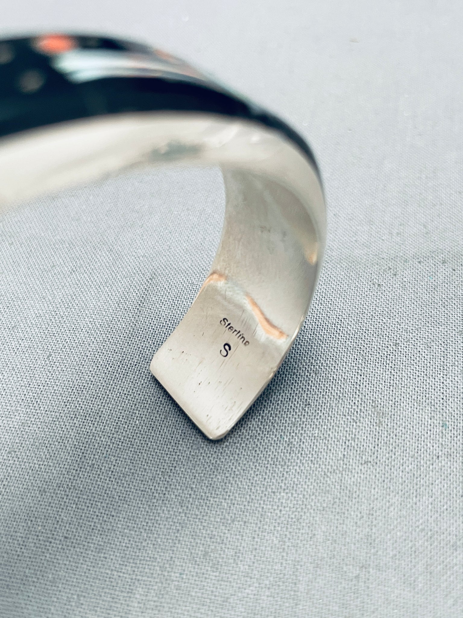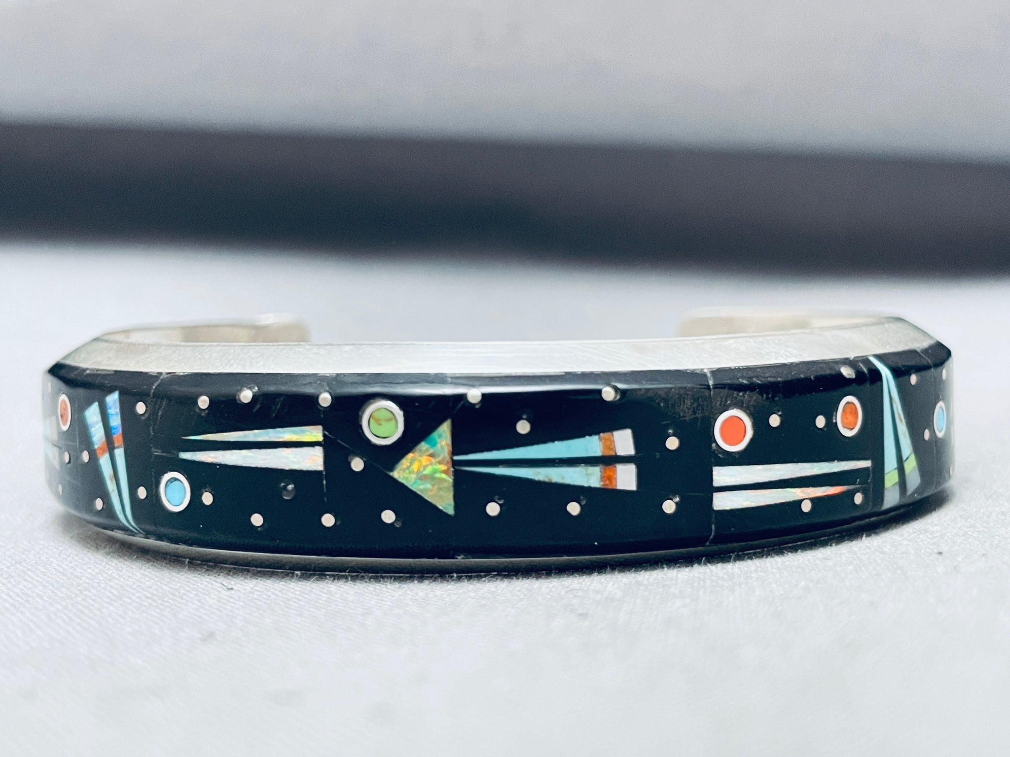 This is a marvelous vintage Navajo inlaid shooting star theme silver cuff bracelet. This impeccable bracelet contains a fascinating inlaid section that wraps from one end of the cuff to the other. The inlay consists of impressive onyx, turquoise, coral, opal, lapis, spiny oyster, and mother of pearl. The way the artist designed the inlay into a space inlay pattern with shooting stars and end kachina patterns. This bracelet is absolutely stunning. The internal stamp works is just fascinating. The width of the bracelet measures around 5/8". Signed by Navajo artist, Gil Smith . Sterling silver, marked. The inside end to end measures around 5-3/4" with an additional 1-1/2" gap. Sturdy 33 grams.